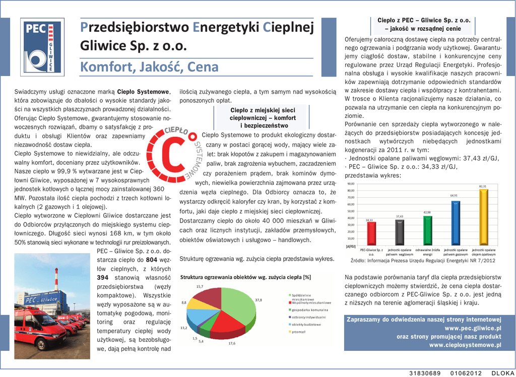Przedsiębiorstwo Energetyki Cieplnej Gliwice Sp. z o.o. Komfort, Jakość, Cena Świadczymy usługi oznaczone marką Ciepło Systemowe, która zobowiązuje do dba łości o wy sokie standardy jakości na wszystkich płaszczyznach prowadzonej działalności. Oferując Ciepło Systemowe, gwarantujemy stosowanie nowoczes nych roz wiązań, dba my o satys fak cję z pro duk tu i obsługi Klien tów oraz za pew nia my niezawodność dostaw ciepła. Ciep ło Sy stemowe to niewidzial ny, ale odczu walny komfort, doceniany przez użytkowników. Nasze ciep ło w 99,9 % wy twarzane jest w Ciep łowni Gli wice, wyposażonej w 7 wy sokospraw nych jednostek kotłowych o łącznej mocy zainstalowanej 360 MW. Pozosta ła ilość ciep ła pocho dzi z trzech kot łow ni lo kal nych (2 ga zowych i 1 olejowej). Ciep ło wy tworzone w Ciep łow ni Gli wice dostarcza ne jest do Od biorców przyłączonych do miej skiego sy stemu ciep łow nicze go. Długość sie ci wy nosi 168 km, w tym oko ło 50% stanowią sieci wykonane w technologii rur preizolowanych. PEC – Gliwice Sp. z o.o. dostarcza ciep ło do 804 węz łów ciepl nych, z których 394 sta nowią włas ność przed siębior stwa (węz ły kom pak towe). Wszyst kie węz ły wy posa żone są w au tomaty kę po godową, moni toring oraz re gu la cję tem pera tu ry ciep łej wo dy użyt kowej, są bezobsługo we, dają pełną kontrolę nad ilością zużywanego ciep ła, a tym samym nad wysokością ponoszonych op łat. Ciep ło z miejskiej sieci ciep łow niczej – kom fort i bezpieczeń stwo Ciep ło Sy stemowe to pro dukt ekologicz ny dostarcza ny w postaci gorącej wo dy, mający wiele za let: brak kłopotów z zakupem i magazynowaniem paliw, brak zagrożenia wybuchem, zaczadzeniem czy pora żeniem prą dem, brak komi nów dy mo wych, niewiel ka powierzchnia zaj mowana przez urzą dzenia węz ła ciepl ne go. Dla Od biorcy ozna cza to, że wystarczy odkręcić kaloryfer czy kran, by korzystać z komfortu, jaki daje ciep ło z miejskiej sie ci ciep łow niczej. Dostarcza my ciep ło do oko ło 40 000 miesz kań w Gli wi cach oraz licz nych in sty tucji, za kła dów przemy słowych, obiek tów oświa towych i usługowo – handlowych. Strukturę ogrzewania wg. zużycia ciepła przedstawia wykres. Ciep ło z PEC – Gliwice Sp. z o.o. – jakość w roz sąd nej cenie Oferu jemy ca łorocz ną dostawę ciep ła na potrzeby cen tral ne go ogrzewa nia i podgrza nia wo dy użyt kowej. Gwa ran tu jemy ciąg łość dostaw, sta bil ne i kon ku rencyj ne ceny re gu lowa ne przez Urząd Re gu la cji Ener gety ki. Profesjo nal na obsługa i wy sokie kwa li fi ka cje na szych pra cow ni ków za pew nia ją dotrzy ma nie od powied nich standardów w za kresie dostawy ciep ła i współ pra cy z kon tra hen ta mi. W trosce o Klien ta ra cjona li zu jemy na sze dzia ła nia, co pozwala na utrzy ma nie cen ciep ła na kon ku rencyjnym poziomie. Porów na nie cen sprze da ży ciep ła wy tworzone go w na le żą cych do przed siębiorstw posia da ją cych koncesję jed nost kach wy twór czych niebę dą cych jed nost ka mi ko genera cji za 2011 r. w tym: · Jed nost ki opa la ne pa li wa mi wę glowy mi: 37,43 zł/GJ, · PEC – Gli wice Sp. z o.o.: 34,33 zł/GJ, przed stawia wy kres: Źró dło: Infor macja Prezesa Urzędu Regula cji Energety ki NR 7/2012 Na podstawie porównania taryf dla ciepła przedsiębiorstw ciep łow niczych możemy stwierdzić, że cena ciep ła dostarcza ne go od biorcom z PEC-Gli wice Sp. z o.o. jest jed ną z niższych na terenie aglomera cji ślą skiej i kraju. Zapra szamy do odwiedzenia naszej strony internetowej www.pec.gli wice.pl oraz strony promu ją cej nasz pro dukt www.cieplosy stemowe.pl 31830689 01062012 DLOKA