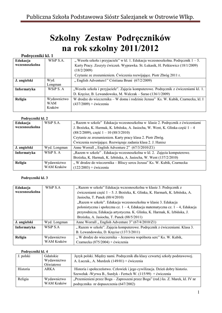 Publiczna Szkoła Podstawowa Sióstr Salezjanek w Ostrowie Wlkp. Szkolny Zestaw Podręczników na rok szkolny 2011/2012 Podręczniki kl. 1 WSiP S.A. Edukacja wczesnoszkolna J. angielski Informatyka Religia Wyd. Longman WSiP S. A Wydawnictwo WAM Kraków Podręczniki kl. 2 WSiP S.A. Edukacja wczesnoszkolna J. angielski Informatyka Wyd. Longman WSiP S. A Religia Wydawnictwo WAM Kraków „ Wesoła szkoła i przyjaciele” w kl. 1. Edukacja wczesnoszkolna. Podręcznik 1 – 5. Karty Pracy. Zeszyty ćwiczeń. Wyprawka. St. Łukasik, H. Petkiewicz (18/1/2009) (18/2/2009) Czytanie ze zrozumieniem. Ćwiczenia rozwijające. Piotr Zbróg 2011 r. „ English Adventure1” Cristiana Bruni (67/2/2009) „Wesoła szkoła i przyjaciele”. Zajęcia komputerowe. Podręcznik z ćwiczeniami kl. 1. D. Kręcisz, B. Lewandowska, M. Walczak – Sarao (136/1/2009) W drodze do wieczernika – W domu i rodzinie Jezusa” Ks. W. Kubik, Czarnecka, kl. I (437/2009) + ćwiczenia „ Razem w szkole” Edukacja wczesnoszkolna w klasie 2. Podręcznik z ćwiczeniami J. Brzózka, K. Harmak, K. Izbińska, A. Jasiocha, W. Went, K. Glinka część 1 – 4 (88/2/2009), część 1 – 10 (88/3/2010) Czytanie ze zrozumieniem. Karty pracy klasa 2. Piotr Zbróg. Ćwiczenia rozwijające. Rozwiązuje zadania klasa 2. J. Hanisz Anne Worrall „ English Adventure 2” (67/3/2010/Z1) „Razem w szkole” . Edukacja wczesnoszkolna w kl. 2. Zajęcia komputerowe. Brzózka, K. Harmak, K. Izbińska, A. Jasiocha, W. Went (137/2/2010) „ W drodze do wieczernika – Bliscy sercu Jezusa” Ks. W. Kubik, Czarnecka (122/2003) + ćwiczenia Podręczniki kl. 3 Edukacja wczesnoszkolna WSiP S.A J. angielski Informatyka Wyd. Longman WSiP S.A Religia Wydawnictwo WAM Kraków Podręczniki kl. 4 J. polski Gdańskie Wydawnictwo Oświatowe Historia ARKA Religia Wydawnictwo WAM Kraków „ Razem w szkole” Edukacja wczesnoszkolna w klasie 3. Podręcznik z ćwiczeniami część 1 – 5. J. Brzózka, K. Glinka, K. Harmark, K. Izbińska, A. Jasiocha, T. Panek (88/4/2010) „Razem w szkole”. Edukacja wczesnoszkolna w klasie 3. Edukacja polonistyczna i społeczna cz. 1 – 4, Edukacja matematyczna cz. 1 – 4, Edukacja przyrodnicza, Edukacja artystyczna. K. Glinka, K. Harmak, K. Izbińska, J. Brzózka, A. Jasiocha, T. Panek (88/5/2011) Anne Worrall „ English Adventure 3” (67/4/2010/Z1) „ Razem w szkole”. Zajęcia komputerowe. Podręcznik z ćwiczeniami. Klasa 3. B. Lewandowska, D. Kręcisz (137/3/2011) „ W drodze do wieczernika – Jezusowa wspólnota serc” Ks. W. Kubik, Czarnecka (875/2004) + ćwiczenia Język polski. Między nami. Podręcznik dla klasy czwartej szkoły podstawowej. A. Łuczak., A. Murdzek (149/01) + ćwiczenia Historia i społeczeństwo. Człowiek i jego cywilizacja. Dzień dobry historio. Szeweluk -Wyrwa B., Surdyk - Fertsch W. (115/99) + ćwiczenia „Przemienieni przez Boga – Zaproszeni przez Boga” (red.) ks. Z. Marek, kl. IV nr podręcznika nr dopuszczenia (647/2002) 1 Publiczna Szkoła Podstawowa Sióstr Salezjanek w Ostrowie Wlkp. Matematyka Przyroda WSiP S.A. Nowa era Informatyka J. angielski J. niemiecki MIGRA Macmillan PWN J. francuski J. hiszpański Technika Wyd. Nowela Edelsa Nowa Era Matematyka 2001. Praca zbiorowa Podręcznik dla klasy 4. (05/08) + ćwiczenia Augustyniak M., Augustyniak M. - Mój świat. Podręcznik do przyrody dla klasy IV. (53/ 02) + ćwiczenia Koba G. „ Informatyka dla szkoły podstawowej klasy IV – VI” (64/06) SUPERKIDS STARTER B. Ściborowska, I. Kubrakiewicz (6/05) + ćwiczenia L. Zastąpiło, E. Krawczyk, M. Kozubska „Und so witer” , podręcznik do j. niem. kl. IV PWN (99/06) + ćwiczenia „Alex et Zoè 1“ Samson C. , wyd. CLE International Nowela 131/06 + ćwiczenia “Colega1”, Hortelano Maria, Lornete J. Gonzales + ćwiczenia Zeszyt ćwiczeń. Klasa 4 – 6 Łech Łabecki nr ? Podręczniki kl. 5 J. polski Historia Religia Gdańskie Wydawnictwo Oświatowe ARKA Matematyka Przyroda Wydawnictwo WAM Kraków WSiP S.A. Nowa era Informatyka J. angielski J. niemiecki MIGRA Macmillan PWN J. francuski Plastyka Muzyka Wyd. Nowela Wyd. OPERON Podręczniki kl. 6 J. polski Gdańskie Wydawnictwo Oświatowe Historia ARKA Religia Przyroda Wydawnictwo WAM Kraków Nowa era Matematyka Informatyka J. angielski J. niemiecki WSiP S. A. MIGRA Macmillan PWN J. francuski Plastyka Między nami. Podręcznik dla klasy piątej szkoły podstawowej. A. Łuczak , A. Murdzek (180/02) + ćwiczenia Historia i społeczeństwo 5. Człowiek i jego cywilizacja. Wojciechowski G. (298/99) + ćwiczenia „Przemienieni przez Boga – Obdarowani przez Boga” (red.) ks.Z. Marek, kl. V nr dopuszczenia (3569/2002/2003) + ćwiczenia Matematyka 2001. Praca zbior. Podręcznik dla klasy 5. (20 / 08) + ćwiczenia Mój świat. Podręcznik do przyrody dla klasy V. E. Tuz, W. Niedzielska (124/03) + ćwiczenia „ Informatyka dla szkoły podstawowej klasy IV – VI” Koba G. (64/06) SUPERKIDS 1 B. Ściborowska, I. Kubrakiewicz (213/ 04) + ćwiczenia „Und so witer” (65/07) podręcznik do j. niem. kl. V Kozubska M., Krawczyk E., Zastąpiło L. “Alex et Zoé 2” Samson C. (72 / 08) + ćwiczenia Podręcznik dla kl. IV” Lubię tworzyć” (52/ 04) „ Muzyka – podręcznik dla kl. 4 – 6 „ M. Rykowska, Z. Szarko (DPN – KS – 5070 – 87/08) + ćwiczenia Łuczak A., Murdzek A. - Język polski. Między nami. Podręcznik dla klasy szóstej szkoły podstawowej (245/03) + ćwiczenia Wojciechowski G. - Historia i społeczeństwo 6. Człowiek i jego cywilizacja (235/00) + ćwiczenia „Przemienieni przez Boga – Przemienieni przez Boga” (red.) ks. Z. Marek Kl. VI (437/2004) E. Tuz, W. Niedzielska, D. Kamińska. Przyroda. Podręcznik dla klasy VI szkoły podstawowej (118/ 01) + ćwiczenia Matematyka 2001 - Praca zbiorowa. Podręcznik dla klasy 6 (06/08) + ćwiczenia „ Informatyka dla szkoły podstawowej klasy IV – VI” Koba G. (64/06) SUPERKIDS 2 B. Ściborowska, I. Kubrakiewicz (137/05) + ćwiczenia „Und so wit