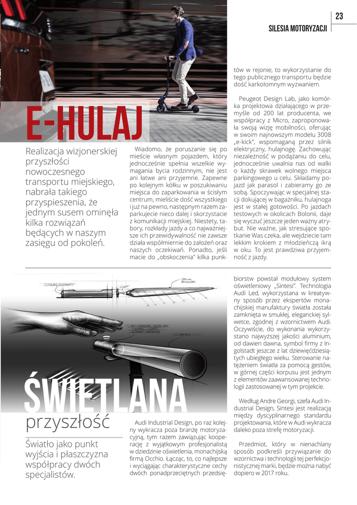 23 Silesia motoryzacji tów w rejonie, to wykorzystanie do tego publicznego transportu będzie dość karkołomnym wyzwaniem. e-hulaj Realizacja wizjonerskiej przyszłości nowoczesnego transportu miejskiego, nabrała takiego przyspieszenia, że jednym susem ominęła kilka rozwiązań będących w naszym zasięgu od pokoleń. Wiadomo, że poruszanie się po mieście własnym pojazdem, który jednocześnie spełnia wszelkie wymagania bycia rodzinnym, nie jest ani łatwe ani przyjemne. Zapewne po kolejnym kółku w poszukiwaniu miejsca do zaparkowania w ścisłym centrum, mieliście dość wszystkiego i już na pewno, następnym razem zaparkujecie nieco dalej i skorzystacie z komunikacji miejskiej. Niestety, tabory, rozkłady jazdy a co najważniejsze ich przewidywalność nie zawsze działa współmiernie do założeń oraz naszych oczekiwań. Ponadto, jeśli macie do „obskoczenia” kilka punk- Świetlana przyszłość Światło jako punkt wyjścia i płaszczyzna współpracy dwóch specjalistów. Audi Industrial Design, po raz kolejny wykracza poza branżę motoryzacyjną, tym razem zawiązując kooperację z wyjątkowym profesjonalistą w dziedzinie oświetlenia, monachijską firmą Occhio. Łącząc, to, co najlepsze i wyciągając charakterystyczne cechy dwóch ponadprzeciętnych przedsię- Peugeot Design Lab, jako komórka projektowa działającego w przemyśle od 200 lat producenta, we współpracy z Micro, zaproponowała swoją wizję mobilności, oferując w swoim najnowszym modelu 3008 „e-kick”, wspomaganą przez silnik elektryczny, hulajnogę. Zachowując niezależność w podążaniu do celu, jednocześnie uwalnia nas od walki o każdy skrawek wolnego miejsca parkingowego u celu. Składamy pojazd jak parasol i zabieramy go ze sobą. Spoczywając w specjalnej stacji dokującej w bagażniku, hulajnoga jest w stałej gotowości. Po jazdach testowych w okolicach Bolonii, daje się wyczuć jeszcze jeden ważny atrybut. Nie ważne, jak stresujące spotkanie Was czeka, ale wejdziecie tam lekkim krokiem z młodzieńczą ikrą w oku. To jest prawdziwa przyjemność z jazdy. biorstw powstał modułowy system oświetleniowy „Sintesi”. Technologia Audi Led, wykorzystana w kreatywny sposób przez ekspertów monachijskiej manufaktury światła została zamknięta w smukłej, eleganckiej sylwetce, zgodnej z wzornictwem Audi. Oczywiście, do wykonania wykorzystano najwyższej jakości aluminium, od dawien dawna, symbol firmy z Ingolstadt jeszcze z lat dziewięćdziesiątych ubiegłego wieku. Sterowanie natężeniem światła za pomocą gestów, w górnej części korpusu jest jednym z elementów zaawansowanej technologii zastosowanej w tym projekcie. Według Andre Georgi, szefa Audi Industrial Design, Sintesi jest realizacją między dyscyplinarnego standardu projektowania, które w Audi wykracza daleko poza strefę motoryzacji. Przedmiot, który w nienachlany sposób podkreśli przywiązanie do wzornictwa i technologii tej perfekcjonistycznej marki, będzie można nabyć dopiero w 2017 roku.