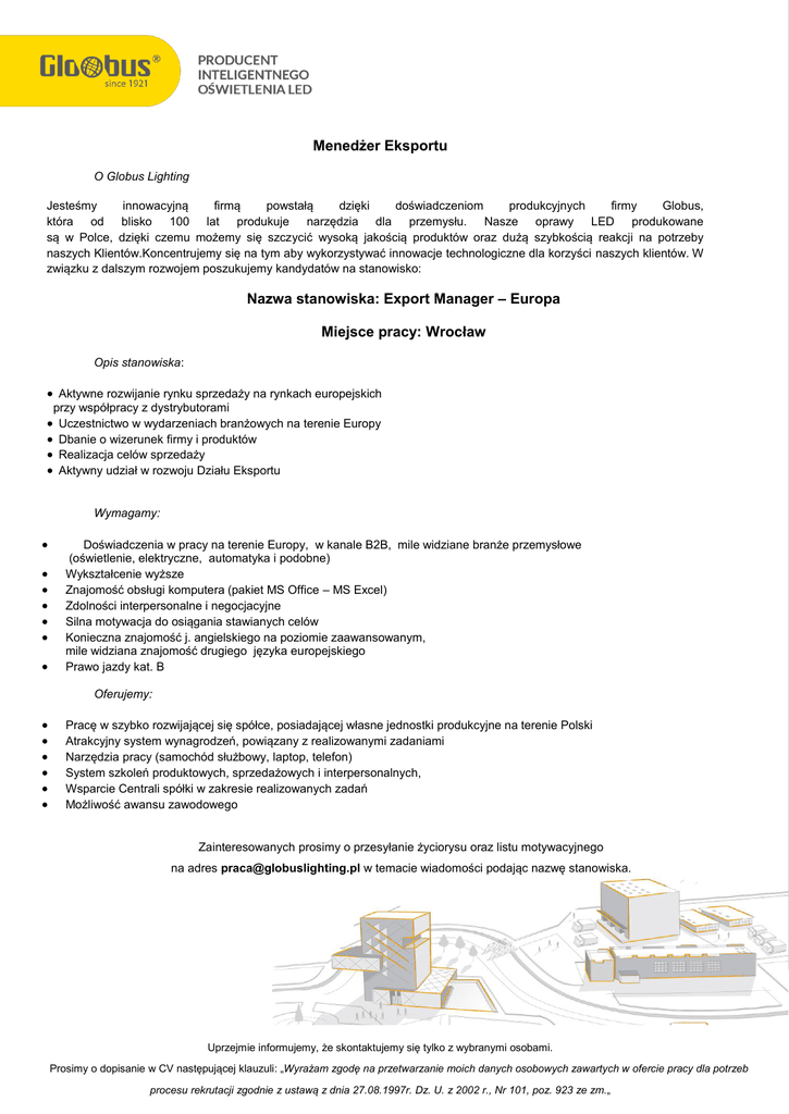 Menedżer Eksportu O Globus Lighting Jesteśmy innowacyjną firmą powstałą dzięki doświadczeniom produkcyjnych firmy Globus, która od blisko 100 lat produkuje narzędzia dla przemysłu. Nasze oprawy LED produkowane są w Polce, dzięki czemu możemy się szczycić wysoką jakością produktów oraz dużą szybkością reakcji na potrzeby naszych Klientów.Koncentrujemy się na tym aby wykorzystywać innowacje technologiczne dla korzyści naszych klientów. W związku z dalszym rozwojem poszukujemy kandydatów na stanowisko: Nazwa stanowiska: Export Manager – Europa Miejsce pracy: Wrocław Opis stanowiska: Aktywne rozwijanie rynku sprzedaży na rynkach europejskich przy współpracy z dystrybutorami Uczestnictwo w wydarzeniach branżowych na terenie Europy Dbanie o wizerunek firmy i produktów Realizacja celów sprzedaży Aktywny udział w rozwoju Działu Eksportu Wymagamy: Doświadczenia w pracy na terenie Europy, w kanale B2B, mile widziane branże przemysłowe (oświetlenie, elektryczne, automatyka i podobne) Wykształcenie wyższe Znajomość obsługi komputera (pakiet MS Office – MS Excel) Zdolności interpersonalne i negocjacyjne Silna motywacja do osiągania stawianych celów Konieczna znajomość j. angielskiego na poziomie zaawansowanym, mile widziana znajomość drugiego języka europejskiego Prawo jazdy kat. B Oferujemy: Pracę w szybko rozwijającej się spółce, posiadającej własne jednostki produkcyjne na terenie Polski Atrakcyjny system wynagrodzeń, powiązany z realizowanymi zadaniami Narzędzia pracy (samochód służbowy, laptop, telefon) System szkoleń produktowych, sprzedażowych i interpersonalnych, Wsparcie Centrali spółki w zakresie realizowanych zadań Możliwość awansu zawodowego Zainteresowanych prosimy o przesyłanie życiorysu oraz listu motywacyjnego na adres [email protected] w temacie wiadomości podając nazwę stanowiska. Uprzejmie informujemy, że skontaktujemy się tylko z wybranymi osobami. Prosimy o dopisanie w CV następującej klauzuli: „Wyrażam zgodę na przetwarzanie moich danych osobowych zawartych w ofercie pracy dla potrzeb procesu rekrutacji zgodnie z ustawą z dnia 27.08.1997r. Dz. U. z 2002 r., Nr 101, poz. 923 ze zm.„