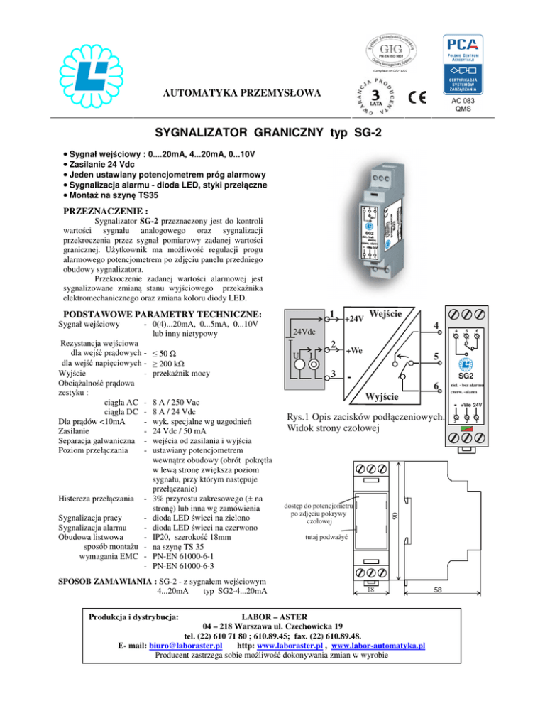 AUTOMATYKA PRZEMYSŁOWA SYGNALIZATOR GRANICZNY typ SG-2 • Sygnał wejściowy : 0....20mA, 4...20mA, 0...10V • Zasilanie 24 Vdc • Jeden ustawiany potencjometrem próg alarmowy • Sygnalizacja alarmu - dioda LED, styki przełączne • Montaż na szynę TS35 PRZEZNACZENIE : Sygnalizator SG-2 przeznaczony jest do kontroli wartości sygnału analogowego oraz sygnalizacji przekroczenia przez sygnał pomiarowy zadanej wartości granicznej. Użytkownik ma możliwość regulacji progu alarmowego potencjometrem po zdjęciu panelu przedniego obudowy sygnalizatora. Przekroczenie zadanej wartości alarmowej jest sygnalizowane zmianą stanu wyjściowego przekaźnika elektromechanicznego oraz zmiana koloru diody LED. 1 PODSTAWOWE PARAMETRY TECHNICZNE: - 0(4)...20mA, 0...5mA, 0...10V lub inny nietypowy Rezystancja wejściowa dla wejść prądowych dla wejść napięciowych Wyjście Obciążalność prądowa zestyku : ciągła AC ciągła DC Dla prądów <10mA Zasilanie Separacja galwaniczna Poziom przełączania - Histereza przełączania Sygnalizacja pracy Sygnalizacja alarmu Obudowa listwowa sposób montażu w ymagania EMC - 8 A / 250 Vac 8 A / 24 Vdc wyk. specjalne wg uzgodnień 24 Vdc / 50 mA wejścia od zasilania i wyjścia ustawiany potencjometrem wewnątrz obudowy (obrót pokrętła w lewą stronę zwiększa poziom sygnału, przy którym następuje przełączanie) 3% przyrostu zakresowego (± na stronę) lub inna wg zamówienia dioda LED świeci na zielono dioda LED świeci na czerwono IP20, szerokość 18mm na szynę TS 35 PN-EN 61000-6-1 PN-EN 61000-6-3 SPOSOB ZAMAWIANIA : SG-2 - z sygnałem wejściowym 4...20mA typ SG2-4...20mA Produkcja i dystrybucja: Wejście 4 24Vdc 2 ≤ 50 Ω ≥ 200 kΩ przekaźnik mocy +24V U I 3 +We 4 5 6 5 - SG2 6 Wyjście dostęp do potencjometru po zdjęciu pokrywy czołowej tutaj podważyć 18 LABOR – ASTER 04 – 218 Warszawa ul. Czechowicka 19 tel. (22) 610 71 80 ; 610.89.45; fax. (22) 610.89.48. http: www.laboraster.pl , www.labor-automatyka.pl E- mail: [email protected] Producent zastrzega sobie możliwość dokonywania zmian w wyrobie ziel. - bez alarmu czerw. -alarm - Rys.1 Opis zacisków podłączeniowych. Widok strony czołowej 90 Sygnał wejściowy 58 3 +We 24V 2 1