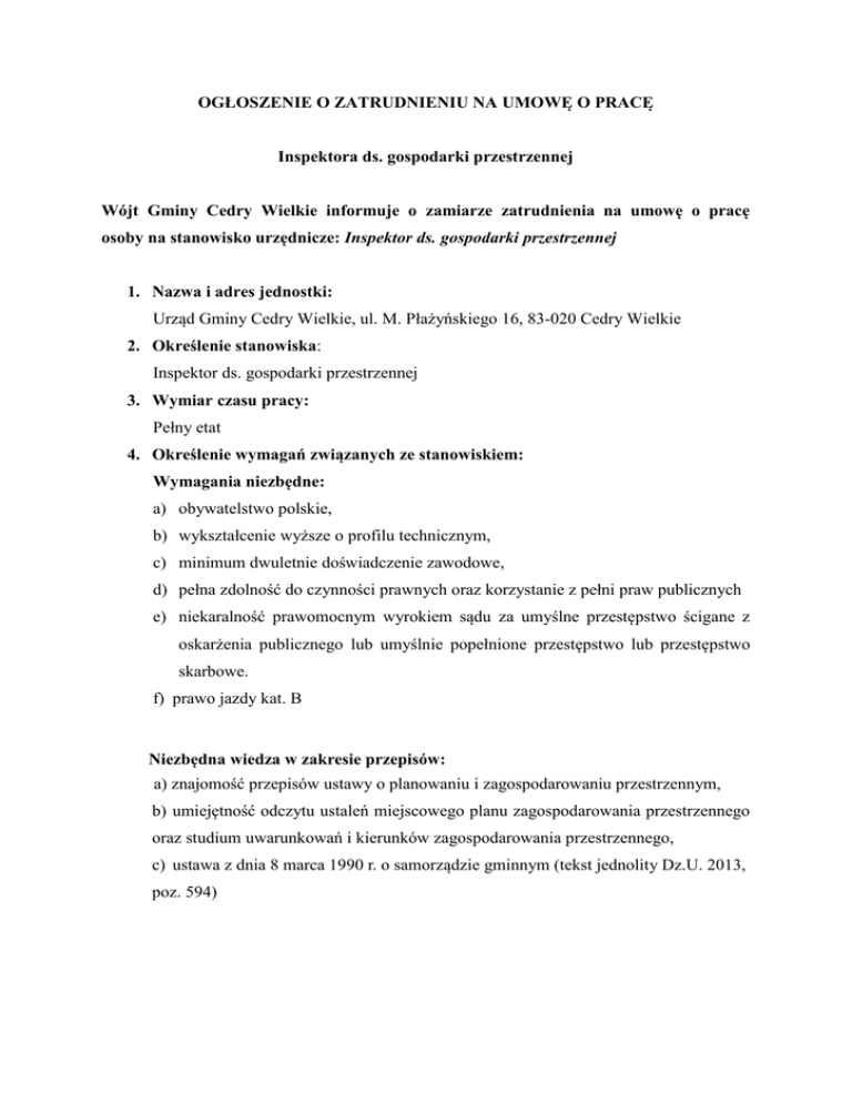 OGŁOSZENIE O ZATRUDNIENIU NA UMOWĘ O PRACĘ Inspektora ds. gospodarki przestrzennej Wójt Gminy Cedry Wielkie informuje o zamiarze zatrudnienia na umowę o pracę osoby na stanowisko urzędnicze: Inspektor ds. gospodarki przestrzennej 1. Nazwa i adres jednostki: Urząd Gminy Cedry Wielkie, ul. M. Płażyńskiego 16, 83-020 Cedry Wielkie 2. Określenie stanowiska: Inspektor ds. gospodarki przestrzennej 3. Wymiar czasu pracy: Pełny etat 4. Określenie wymagań związanych ze stanowiskiem: Wymagania niezbędne: a) obywatelstwo polskie, b) wykształcenie wyższe o profilu technicznym, c) minimum dwuletnie doświadczenie zawodowe, d) pełna zdolność do czynności prawnych oraz korzystanie z pełni praw publicznych e) niekaralność prawomocnym wyrokiem sądu za umyślne przestępstwo ścigane z oskarżenia publicznego lub umyślnie popełnione przestępstwo lub przestępstwo skarbowe. f) prawo jazdy kat. B Niezbędna wiedza w zakresie przepisów: a) znajomość przepisów ustawy o planowaniu i zagospodarowaniu przestrzennym, b) umiejętność odczytu ustaleń miejscowego planu zagospodarowania przestrzennego oraz studium uwarunkowań i kierunków zagospodarowania przestrzennego, c) ustawa z dnia 8 marca 1990 r. o samorządzie gminnym (tekst jednolity Dz.U. 2013, poz. 594) Zakres zadań wykonywanych na stanowisku: 1. Prowadzenie całokształtu spraw związanych z opracowywaniem, przechowywaniem i archiwizowaniem planów zagospodarowania przestrzennego gminy. 2. Prowadzenie rejestru wniosków o zmianę planów zagospodarowań przestrzennych. 3. Sporządzanie zaświadczeń, wypisów i wyrysów z planów zagospodarowania przestrzennego. 4. Wydawanie opinii o możliwości podziału terenu w oparciu o ustalenia obowiązujących miejscowych planów zagospodarowania przestrzennego oraz przepisów szczególnych. 5. Sporządzanie wypisów i wyrysów miejscowych planów zagospodarowania przestrzennego. 6. Opiniowanie postępowań administracyjnych w zakresie naliczania opłat planistycznych, adiacenckich itp. 7. Sporządzanie obowiązującej sprawozdawczości, analiz i zestawień dotyczących zagospodarowania przestrzennego gminy. 8. Współuczestnictwo w pracach związanych ze zmianami studium uwarunkowań i kierunków zagospodarowania przestrzennego gminy oraz miejscowego planu zagospodarowania przestrzennego. 9. Przygotowanie decyzji o naliczaniu opłat adiacenckich. 10. Udzielanie interesantom informacji dotyczących planowania przestrzennego. 11. Wykonywanie innych czynności zleconych przez Wójta Gminy. 5. Wymagane dokumenty: a) list motywacyjny z uzasadnieniem – podpisany odręcznie, b) życiorys – curriculum vitae – podpisany odręcznie, c) kwestionariusz osobowy – dostępny w załączniku poniżej, d) kserokopia dyplomu ukończenia studiów wyższych, e) kserokopie innych dokumentów o posiadanych kwalifikacjach, uprawnieniach i umiejętnościach, f) kserokopie świadectw pracy, g) oświadczenie o pełnej zdolności do czynności prawnych oraz korzystaniu z pełni praw publicznych, h) oświadczenie o niekaralności za przestępstwo umyślne ścigane z oskarżenia publicznego lub umyślne przestępstwo skarbowe, i) oświadczenie o stanie zdrowia potwierdzające brak przeciwskazań do pracy na określonym stanowisku, j) oświadczenie o wyrażeniu zgody na przetwarzanie danych osobowych na potrzeby postępowania rekrutacyjnego, zgodnie z ustawą z dnia 29 sierpnia 1997 r. o ochronie danych osobowych (j.t. Dz. U. z 2014 r. poz.1182 ze zmianami). 6. Termin i miejsce składania dokumentów: Wymagane dokumenty należy składać osobiście w sekretariacie urzędu lub przesłać pocztą na adres Urzędu: Urząd Gminy, ul. M. Płażyńskiego 16 83-020 Cedry Wielkie, w nieprzekraczalnym terminie do dnia 03 marca 2017 r. godz. 15.00, w zamkniętej kopercie opatrzonej imieniem i nazwiskiem oraz z dopiskiem „Inspektor ds. gospodarki przestrzennej”. Z wybranym kandydatem, który będzie spełniał wymagania Urząd Gminy skontaktuje się telefonicznie. Wójt Gminy /-/ Janusz Goliński