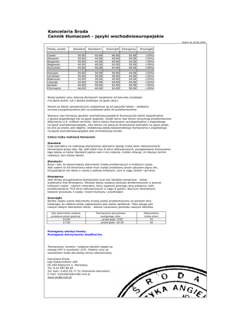 Kancelaria Środa Cennik tłumaczeń - języki wschodnioeuropejskie WaŜne do 30.06.2009. Teksty zwykłe Standard Standard+ Overnight Emergency Przysięgłe Czeski Słowacki Bułgarski Węgierski Rumuński 39,90 39,90 39,90 44,90 44,90 44,90 44,90 44,90 49,90 49,90 49,90 49,90 49,90 54,90 54,90 54,90 54,90 54,90 59,90 59,90 +25% +25% +30% +30% +30% Rosyjski Ukraiński Białoruski Litewski Serbski Chorwacki 29,90 34,90 34,90 34,90 44,90 44,90 34,90 39,90 39,90 39,90 49,90 49,90 39,90 49,90 49,90 49,90 54,90 54,90 44,90 54,90 54,90 54,90 59,90 59,90 +25% +25% +25% +25% +30% +30% WyŜej podane ceny dotyczą tłumaczeń niezaleŜnie od kierunku przekładu (na język polski, lub z języka polskiego na język obcy). Stawki za teksty specjalistyczne uzaleŜnione są od specyfiki tekstu - dokładna wycena przygotowywana jest na podstawie pliku do przetłumaczenia. Wszyscy nasi tłumacze języków wschodnioeuropejskich tłumaczą teŜ teksty bezpośrednio z języka angielskiego lub na język angielski. Dzięki temu nasi klienci otrzymują przetłumaczone dokumenty w b. krótkim terminie. Skoro teksty tłumaczone są bezpośrednio z angielskiego na język wschodnioeuropejski, nasi klienci nie płacą za tłumaczenie pośrednie na język polski, bo ono po prostu jest zbędne. Dodatkową zaletą bezpośredniego tłumaczenia z angielskiego na języki wschodnioeuropejskie jest minimalizacja korekt. Cztery tryby realizacji tłumaczeń Standard Czas potrzebny na realizację tłumaczenia obliczamy dzieląc liczbę stron obliczeniowych tłumaczenia przez dwa. Np. jeśli tekst liczy 8 stron obliczeniowych, przygotowanie tłumaczenia tego tekstu w trybie Standard zajmie nam 4 dni robocze. Krótko mówiąc, im dłuŜszy termin realizacji, tym niŜsze stawki. Standard+ Bywa i tak, Ŝe obszerniejsze dokumenty trzeba przetłumaczyć w krótszym czasie. Jeśli zatem na 10-stronicowy tekst musi zostać przełoŜony przed upływem pięciu dni, przygotujemy ten tekst w czasie o połowę krótszym, czyli w ciągu dwóch i pół dnia. Emergency Jeśli tempo przygotowania tłumaczenia musi być bardziej energiczne - wtedy wybieramy tryb Emergency. DłuŜsze teksty zostaną wówczas przetłumaczone w jeszcze krótszym czasie - naszym rekordem, który zapewne pewnego dnia pobijemy, było przetłumaczenie 74,9 stron obliczeniowych w ciągu 8 godzin. Nad tym rekordowym tekstem pracowały 4 osoby: trzech tłumaczy i proofreader. Overnight Bardzo często waŜne dokumenty muszą zostać przetłumaczone na poranek dnia kolejnego, bo właśnie wtedy zaplanowane jest waŜne spotkanie. Taka usługa jest naszym stałym elementem oferty - dobrze rozumiemy potrzeby naszych klientów. Gdy dokumenty zostaną przesłane przed godziną… 14:00 17:00 Tłumaczenie jest gotowe następnego dnia… ...przed godz. 9:00 ...przed godz. 10:30 Pomagamy obniŜyć koszty. Pomagamy dotrzymywać deadline'ów. Tłumaczenia, korekty i redakcja tekstów objęte są stawką VAT w wysokości 22%. Podane ceny są wartościami netto dla jednej strony obliczeniowej. Kancelaria Środa Łąki Radzymińskie 16D 05-250 Radzymin k. Warszawy Tel. 0.22 487.84.04 Tel. kom. 0.602 65.77.31 (Kierownik Kancelarii) E-mail: [email protected] www.sroda.com.pl Maksymalna liczba stron 15 10