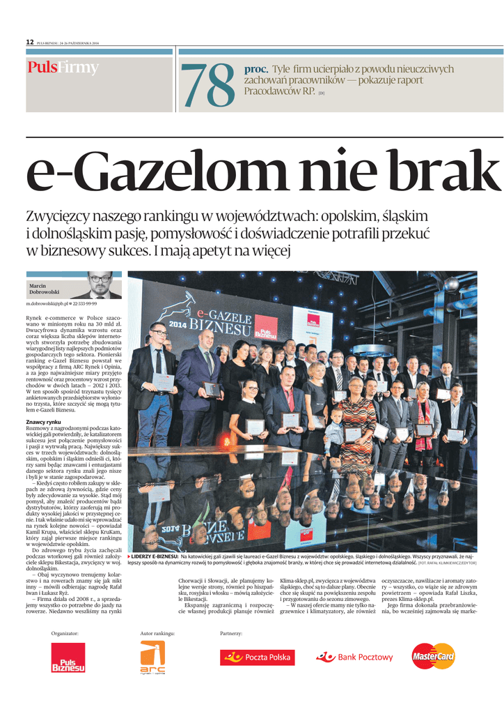 12 PULS BIZNESU, 24-26 PAŹDZIERNIKA 2014 78 PulsFirmy proc. Tyle firm ucierpiało z powodu nieuczciwych zachowań pracowników — pokazuje raport Pracodawców RP. [DI] e-Gazelom nie brak Zwycięzcy naszego rankingu w województwach: opolskim, śląskim i dolnośląskim pasję, pomysłowość i doświadczenie potrafili przekuć w biznesowy sukces. I mają apetyt na więcej Marcin Dobrowolski [email protected] 22-333-99-99 Rynek e-commerce w Polsce szacowano w minionym roku na 30 mld zł. Dwucyfrowa dynamika wzrostu oraz coraz większa liczba sklepów internetowych stworzyła potrzebę zbudowania wiarygodnej listy najlepszych podmiotów gospodarczych tego sektora. Pionierski ranking e-Gazel Biznesu powstał we współpracy z firmą ARC Rynek i Opinia, a za jego najważniejsze miary przyjęto rentowność oraz procentowy wzrost przychodów w dwóch latach — 2012 i 2013. W ten sposób spośród trzynastu tysięcy ankietowanych przedsiębiorstw wyłoniono trzysta, które szczycić się mogą tytułem e-Gazeli Biznesu. Znawcy rynku Rozmowy z nagrodzonymi podczas katowickiej gali potwierdziły, że katalizatorem sukcesu jest połączenie pomysłowości i pasji z wytrwałą pracą. Największy sukces w trzech województwach: dolnośląskim, opolskim i śląskim odnieśli ci, którzy sami będąc znawcami i entuzjastami danego sektora rynku znali jego nisze i byli je w stanie zagospodarować. — Kiedyś często robiłem zakupy w sklepach ze zdrową żywnością, gdzie ceny były zdecydowanie za wysokie. Stąd mój pomysł, aby znaleźć producentów bądź dystrybutorów, którzy zaoferują mi produkty wysokiej jakości w przystępnej cenie. I tak właśnie udało mi się wprowadzać na rynek kolejne nowości — opowiadał Kamil Krupa, właściciel sklepu KruKam, który zajął pierwsze miejsce rankingu w województwie opolskim. Do zdrowego trybu życia zachęcali podczas wtorkowej gali również założyciele sklepu Bikestacja, zwycięzcy w woj. dolnośląskim. — Obaj wyczynowo trenujemy kolarstwo i na rowerach znamy się jak nikt inny — mówili odbierając nagrodę Rafał Iwan i Łukasz Ryż. — Firma działa od 2008 r., a sprzedajemy wszystko co potrzebne do jazdy na rowerze. Niedawno weszliśmy na rynki Organizator: LIDERZY E-BIZNESU: Na katowickiej gali zjawili się laureaci e-Gazel Biznesu z województw: opolskiego, śląskiego i dolnośląskiego. Wszyscy przyznawali, że najlepszy sposób na dynamiczny rozwój to pomysłowość i głęboka znajomość branży, w której chce się prowadzić internetową działalność. [FOT. RAFAŁ KLIMKIEWICZ/EDYTOR] Chorwacji i Słowacji, ale planujemy kolejne wersje strony, również po hiszpańsku, rosyjsku i włosku — mówią założyciele Bikestacji. Ekspansję zagraniczną i rozpoczęcie własnej produkcji planuje również Autor rankingu: Partnerzy: Klima-sklep.pl, zwycięzca z województwa śląskiego, choć są to dalsze plany. Obecnie chce się skupić na powiększeniu zespołu i przygotowaniu do sezonu zimowego. — W naszej ofercie mamy nie tylko nagrzewnice i klimatyzatory, ale również oczyszczacze, nawilżacze i aromaty zatory — wszystko, co wiąże się ze zdrowym powietrzem — opowiada Rafał Liszka, prezes Klima-sklep.pl. Jego firma dokonała przebranżowienia, bo wcześniej zajmowała się marke- PULS BIZNESU, 24-26 PAŹDZIERNIKA 2014 SPOTKANIE Znajdź partnera do projektu 18 listopada w Warszawie odbędzie się bezpłatne spotkanie brokerskie poświęcone poszukiwaniu partnerów do współpracy przy składaniu i realizacji projektów w ramach 19. konkursu Inicjatywy Cornet. Wydarzenie jest przeznaczone dla przedstawicieli zrzeszeń branżowych grupujących małe i średnie firmy oraz jednostek naukowych. Cornet to europejska sieć agencji finansujących B+R w Europie, która daje możliwość finansowania badań na potrzeby konkretnych branż przemysłowych. W ramach sieci ogłaszane są regularnie konkursy na projekty realizowane we współpracy międzynarodowej. W pierwszej części spotkania uczestnicy będą mogli przedstawić koncepcje swoich projektów w celu znalezienia partnerów z odpowiednim know-how. W drugiej koordynatorzy przedstawią projekty finansowane z Cornet. Spotkanie odbędzie się w języku angielskim, obowiązuje rejestracja on-line. Więcej informacji: www.cornet-era.net/. [SACH] uje entuzjazmu PASJONACI: Założyciele Bikestacji, Łukasz Ryż i Rafał Iwan, twierdzą, że na rowerach znają się jak nikt inny. Dyplom za 1. miejsce w woj. dolnośląskim wręczyła im Patricia Deyna, prezes Bonnier Business Polska (z lewej). [FOT. RAFAŁ KLIMKIEWICZ/ EDYTOR] WIECZÓR NAGRODZONYCH: Uroczysta, regionalna gala e-Gazel Biznesu odbyła się w gościnnych wnętrzach katowickiego hotelu Monopol. [FOT. RAFAŁ KLIMKIEWICZ/EDYTOR] NOWA BRANŻA: Rafał Liszka, założyciel firmy Klima-sklep.pl, zajmował się wcześniej marketingiem i IT. Zmienił pole działania i opłaciło się. Zajął 1. miejsce w woj. śląskim. [FOT. RAFAŁ KLIMKIEWICZ/ EDYTOR] tingiem internetowym i doradztwem informatycznym. — Dobry marketing to podstawa. Dzięki wcześniejszym doświadczeniom możemy docierać do klientów z wyselekcjonowaną ofertą odpowiadającą ich potrzebom — tłumaczy Rafał Liszka. Dodaje, że rozwój i promocja sklepu internetowego to długi i kosztowny proces. Z tezą Rafała Liszki zgadzali się uczestnicy panelu dyskusyjnego, w którym zasiedli eksperci rynku e-commerce. — Sprzedaż internetowa to wciąż zaledwie 5 proc. całościowej polskiej sprzedaży detalicznej. To bardzo mało, w szczególności w porównaniu z krajami zachodnimi. Nasi przedsiębiorcy muszą inwestować i być otwarci na nowe rozwiązania technologiczne, które umożliwią ich klientom przyspieszenie dokonywania transakcji przy jednoczesnym bezpieczeństwie płatności — przekonywała Kamila Kaliszyk, dyrektor ds. rozwoju rynku i akceptacji kart płatniczych polskiego oddziału MasterCard Europe. Technologia na pomoc W z