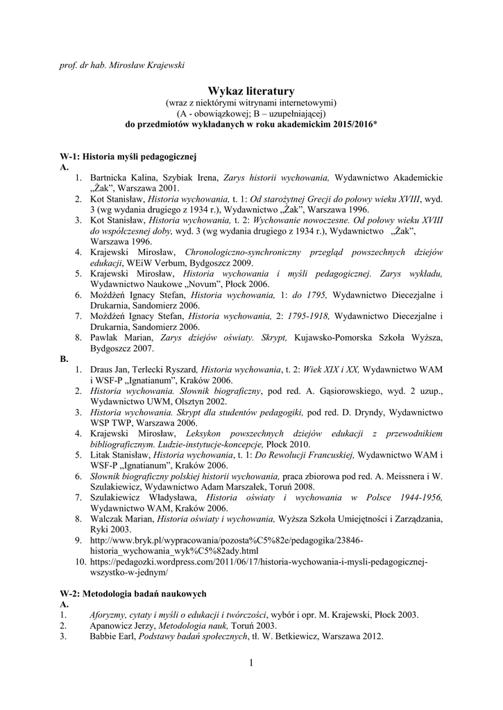 prof. dr hab. Mirosław Krajewski Wykaz literatury (wraz z niektórymi witrynami internetowymi) (A - obowiązkowej; B – uzupełniającej) do przedmiotów wykładanych w roku akademickim 2015/2016* W-1: Historia myśli pedagogicznej A. 1. Bartnicka Kalina, Szybiak Irena, Zarys historii wychowania, Wydawnictwo Akademickie „Żak”, Warszawa 2001. 2. Kot Stanisław, Historia wychowania, t. 1: Od starożytnej Grecji do połowy wieku XVIII, wyd. 3 (wg wydania drugiego z 1934 r.), Wydawnictwo „Żak”, Warszawa 1996. 3. Kot Stanisław, Historia wychowania, t. 2: Wychowanie nowoczesne. Od połowy wieku XVIII do współczesnej doby, wyd. 3 (wg wydania drugiego z 1934 r.), Wydawnictwo „Żak”, Warszawa 1996. 4. Krajewski Mirosław, Chronologiczno-synchroniczny przegląd powszechnych dziejów edukacji, WEiW Verbum, Bydgoszcz 2009. 5. Krajewski Mirosław, Historia wychowania i myśli pedagogicznej. Zarys wykładu, Wydawnictwo Naukowe „Novum”, Płock 2006. 6. Możdżeń Ignacy Stefan, Historia wychowania, 1: do 1795, Wydawnictwo Diecezjalne i Drukarnia, Sandomierz 2006. 7. Możdżeń Ignacy Stefan, Historia wychowania, 2: 1795-1918, Wydawnictwo Diecezjalne i Drukarnia, Sandomierz 2006. 8. Pawlak Marian, Zarys dziejów oświaty. Skrypt, Kujawsko-Pomorska Szkoła Wyższa, Bydgoszcz 2007. B. 1. Draus Jan, Terlecki Ryszard, Historia wychowania, t. 2: Wiek XIX i XX, Wydawnictwo WAM i WSF-P „Ignatianum”, Kraków 2006. 2. Historia wychowania. Słownik biograficzny, pod red. A. Gąsiorowskiego, wyd. 2 uzup., Wydawnictwo UWM, Olsztyn 2002. 3. Historia wychowania. Skrypt dla studentów pedagogiki, pod red. D. Dryndy, Wydawnictwo WSP TWP, Warszawa 2006. 4. Krajewski Mirosław, Leksykon powszechnych dziejów edukacji z przewodnikiem bibliograficznym. Ludzie-instytucje-koncepcje, Płock 2010. 5. Litak Stanisław, Historia wychowania, t. 1: Do Rewolucji Francuskiej, Wydawnictwo WAM i WSF-P „Ignatianum”, Kraków 2006. 6. Słownik biograficzny polskiej historii wychowania, praca zbiorowa pod red. A. Meissnera i W. Szulakiewicz, Wydawnictwo Adam Marszałek, Toruń 2008. 7. Szulakiewicz Władysława, Historia oświaty i wychowania w Polsce 1944-1956, Wydawnictwo WAM, Kraków 2006. 8. Walczak Marian, Historia oświaty i wychowania, Wyższa Szkoła Umiejętności i Zarządzania, Ryki 2003. 9. http://www.bryk.pl/wypracowania/pozosta%C5%82e/pedagogika/23846historia_wychowania_wyk%C5%82ady.html 10. https://pedagozki.wordpress.com/2011/06/17/historia-wychowania-i-mysli-pedagogicznejwszystko-w-jednym/ W-2: Metodologia badań naukowych A. 1. Aforyzmy, cytaty i myśli o edukacji i twórczości, wybór i opr. M. Krajewski, Płock 2003. 2. Apanowicz Jerzy, Metodologia nauk, Toruń 2003. 3. Babbie Earl, Podstawy badań społecznych, tł. W. Betkiewicz, Warszawa 2012. 1 4. Bielcowie Ewa. i Janusz, Podręcznik pisania prac albo technika pisania po polsku, Kraków 2004. 5. Boć Jan, Jak pisać pracę magisterską?, konsultacja językowa J. Miodek, wyd. 4 poprawione, Kolonia Limited 2003. 6. Gambarelli Gianfranco, Łucki Zbigniew, Jak przygotować pracę dyplomową lub doktorską? Wybór tematu, pisanie, prezentowanie, publikowanie, Kraków 1996. 7. Grzegorzewski P., Jak pisać prace dyplomowe? http://main.amu.edu.pl/~grzepa/files/dyplom.doc 8. Krajewski Mirosław, Piszemy prace naukowe. Vademecum dla studentów i doktorantów, Rypin 2004 9. Mackiewicz Jolanta, Jak pisać teksty naukowe?, Gdańsk 1996. 10. Nowak Stefan, Metodologia badań społecznych, Warszawa 2012. 11. Zielińska Iwona, Metodologiczne podstawy badań społecznych, Rypin 2008. B. 1. Kamiński Aleksander, Metoda, technika, procedura badawcza w pedagogice, [w:] Metodologia pedagogiki społecznej, praca zbiorowa pod red. R. Wroczyńskiego i T. Pilcha, Wrocław Warszawa - Kraków - Gdańsk 1974. 2. Konteksty i metody w badaniach historyczno-pedagogicznych, red. Tadeusz Jałmużna, I. Michalska, G. Michalski, Kraków 2004. 3. Krajewski Mirosław, Badania pedagogiczne w zarysie. Wybór bibliograficzny druków zwartych, czasopism pedagogiczno-przedmiotowych i witryn internetowych z wprowadzeniem, Płock 2006. 4. Krajewski Mirosław, Europejski Obszar Szkolnictwa Wyższego, Płock 20024. 5. Krajewski Mirosław, Vademecum autora i wydawcy prac naukowych, wyd. 2 popr., uzup. i rozszerzone, Włocławek 2001. 6. Łydyżyński Andrzej, Walejewska Ewa, Jak skutecznie studiować? Poradnik z zakresu technik pracy umysłowej. Nie tylko dla studentów!, Wrocław 2000. 7. Majchrzak Jadwiga, Mendel Tadeusz, Metodyka pisania prac magisterskich i dyplomowych. Poradnik pisania prac promocyjnych oraz innych opracowań naukowych wraz z przygotowaniem ich do obrony lub publikacji, wyd. 2, poprawione, Poznań 1995. 8. Mendel Tadeusz, Metodyka pisania prac doktorskich, wyd. 5, Poznań 2002. 9. Morszczyńska Urszula, Rola elementów metodologii nauk w treściach nauczania, Katowice 1991. 10. Pawlak Marian, Serczyk Jerzy, Podstawy badań historycznych. Skrypt dla studentów I roku historii, wyd. 8, Bydgoszcz 1999. 11. Pilch Tadeusz, Zasady badań pedagogicznych, Warszawa - Wrocław -Kraków - Gdańsk 1977. 12. Pułło Andrzej, Prace magisterskie i licencjackie. Wskazówki dla studentów, wyd. 3, Warszawa 2003. 13. Rubacha Krzysztof, Metodologia badań nad edukacją, Warszawa 2008. 14. Weglińska M., Jak pisać pracę magisterską? Poradnik dla studentów, Kraków 2002. W-3: Wprowadzenie do teorii polityki A. 1. Heywood Andrew, Teoria polityki- wprowadzenie, przekł. M. Jasiński, B. Maliszewska, D. Stasiak, red. nauk. T. Żyro, Warszawa 2009. 2. Laska Artur, Nocoń Jarosław, Teoria polityki- wprowadzenie, Warszawa 2010. 3. Teoria polityki, red. Pw. Sokół, M. Żmigrodzki, Kraków 1999. 4. Weber Max, Polityka jako zawód i powołanie, Kraków 1998, B. 1. Chmaj Marek, Żmigrodzki Marek, Wprowadzenie do teorii polityki, Lublin 1996. 2. Encyklopedia politologii, red. W. Sokół, M. Żmigrodzki, Kraków 1999. 2 3. https://www.academia.edu/7230760/Chmaj_%C5%BBmigrodzki__Wprowad