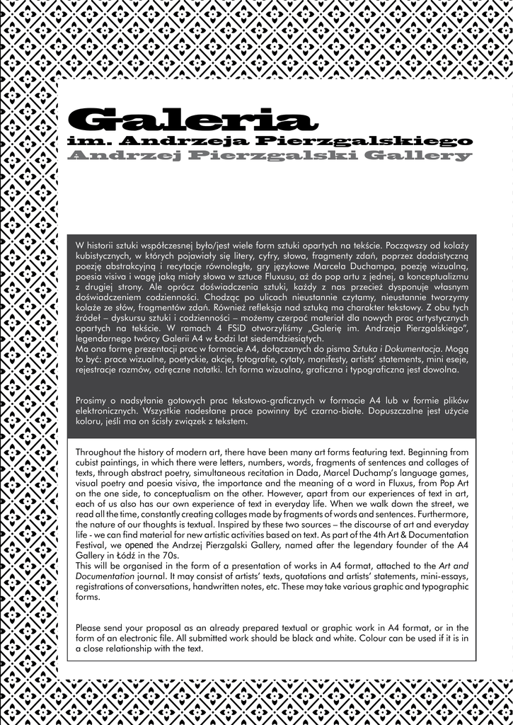 Galeria im. Andrzeja Pierzgalskiego Andrzej Pierzgalski Gallery W historii sztuki współczesnej było/jest wiele form sztuki opartych na tekście. Począwszy od kolaży kubistycznych, w których pojawiały się litery, cyfry, słowa, fragmenty zdań, poprzez dadaistyczną poezję abstrakcyjną i recytacje równoległe, gry językowe Marcela Duchampa, poezję wizualną, poesia visiva i wagę jaką miały słowa w sztuce Fluxusu, aż do pop artu z jednej, a konceptualizmu z drugiej strony. Ale oprócz doświadczenia sztuki, każdy z nas przecież dysponuje własnym doświadczeniem codzienności. Chodząc po ulicach nieustannie czytamy, nieustannie tworzymy kolaże ze słów, fragmentów zdań. Również refleksja nad sztuką ma charakter tekstowy. Z obu tych źródeł – dyskursu sztuki i codzienności – możemy czerpać materiał dla nowych prac artystycznych opartych na tekście. W ramach 4 FSiD otworzyliśmy „Galerię im. Andrzeja Pierzgalskiego”, legendarnego twórcy Galerii A4 w Łodzi lat siedemdziesiątych. Ma ona formę prezentacji prac w formacie A4, dołączanych do pisma Sztuka i Dokumentacja. Mogą to być: prace wizualne, poetyckie, akcje, fotografie, cytaty, manifesty, artists’ statements, mini eseje, rejestracje rozmów, odręczne notatki. Ich forma wizualna, graficzna i typograficzna jest dowolna. Prosimy o nadsyłanie gotowych prac tekstowo-graficznych w formacie A4 lub w formie plików elektronicznych. Wszystkie nadesłane prace powinny być czarno-białe. Dopuszczalne jest użycie koloru, jeśli ma on ścisły związek z tekstem. Throughout the history of modern art, there have been many art forms featuring text. Beginning from cubist paintings, in which there were letters, numbers, words, fragments of sentences and collages of texts, through abstract poetry, simultaneous recitation in Dada, Marcel Duchamp’s language games, visual poetry and poesia visiva, the importance and the meaning of a word in Fluxus, from Pop Art on the one side, to conceptualism on the other. However, apart from our experiences of text in art, each of us also has our own experience of text in everyday life. When we walk down the street, we read all the time, constantly creating collages made by fragments of words and sentences. Furthermore, the nature of our thoughts is textual. Inspired by these two sources – the discourse of art and everyday life - we can find material for new artistic activities based on text. As part of the 4th Art & Documentation Festival, we opened the Andrzej Pierzgalski Gallery, named after the legendary founder of the A4 Gallery in Łódź in the 70s. This will be organised in the form of a presentation of works in A4 format, attached to the Art and Documentation journal. It may consist of artists’ texts, quotations and artists’ statements, mini-essays, registrations of conversations, handwritten notes, etc. These may take various graphic and typographic forms. Please send your proposal as an already prepared textual or graphic work in A4 format, or in the form of an electronic file. All submitted work should be black and white. Colour can be used if it is in a close relationship with the text. Sztuka i Dokumentacja, nr 9 (2013) 151 J.M. Szczurek Jeśli idzie o malowanie to najlepiej wychodzi mi pisanie / When it comes to painting, I am more of a writer, olej na płótnie, 2012. J.M. Szczurek Jedyny obraz z takim napisem / This is the only painting with such writing on it, olej na płótnie, 2012. Lilo Nein, How the concept came to the love, 2013. Astrid Jahns, Thoughts about nothing. Astrid Jahns, Thoughts about nothing. Astrid Jahns, Thoughts about nothing. Ewa Michalska