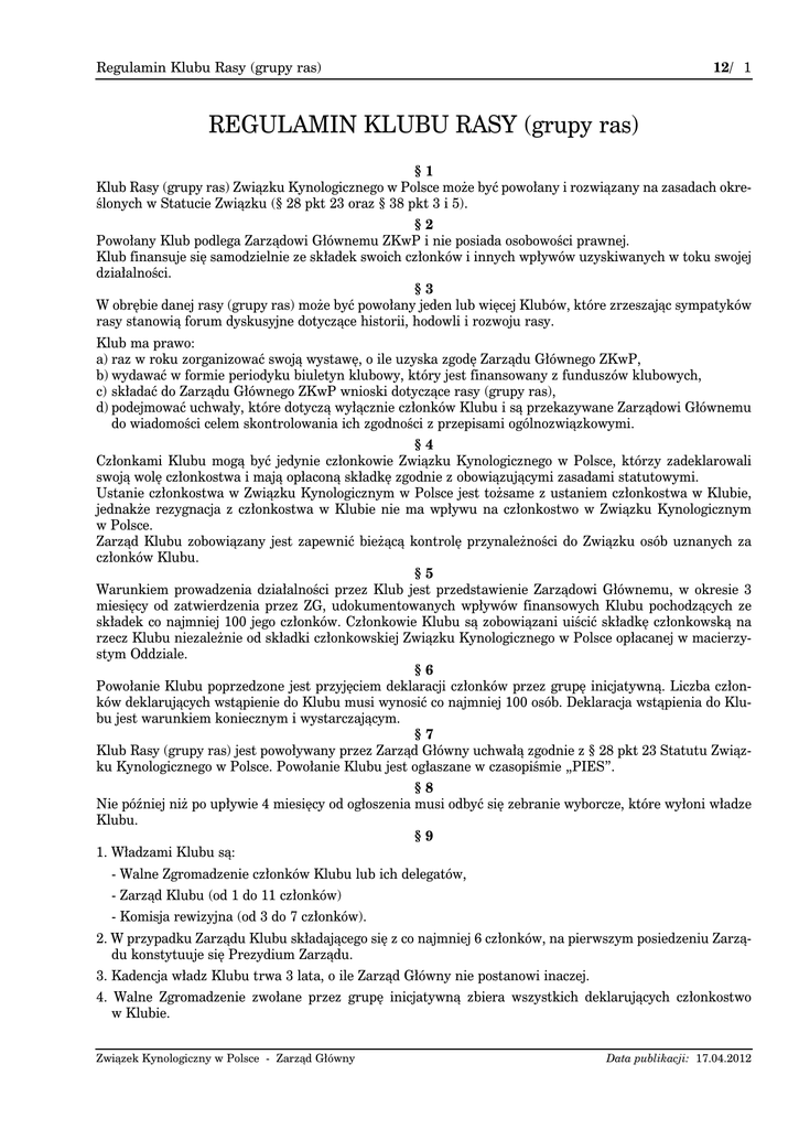 12/ 1 Regulamin Klubu Rasy (grupy ras) REGULAMIN KLUBU RASY (grupy ras) §1 Klub Rasy (grupy ras) Związku Kynologicznego w Polsce może być powołany i rozwiązany na zasadach określonych w Statucie Związku (§ 28 pkt 23 oraz § 38 pkt 3 i 5). §2 Powołany Klub podlega Zarządowi Głównemu ZKwP i nie posiada osobowości prawnej. Klub finansuje się samodzielnie ze składek swoich członków i innych wpływów uzyskiwanych w toku swojej działalności. §3 W obrębie danej rasy (grupy ras) może być powołany jeden lub więcej Klubów, które zrzeszając sympatyków rasy stanowią forum dyskusyjne dotyczące historii, hodowli i rozwoju rasy. Klub ma prawo: a) raz w roku zorganizować swoją wystawę, o ile uzyska zgodę Zarządu Głównego ZKwP, b) wydawać w formie periodyku biuletyn klubowy, który jest finansowany z funduszów klubowych, c) składać do Zarządu Głównego ZKwP wnioski dotyczące rasy (grupy ras), d) podejmować uchwały, które dotyczą wyłącznie członków Klubu i są przekazywane Zarządowi Głównemu do wiadomości celem skontrolowania ich zgodności z przepisami ogólnozwiązkowymi. §4 Członkami Klubu mogą być jedynie członkowie Związku Kynologicznego w Polsce, którzy zadeklarowali swoją wolę członkostwa i mają opłaconą składkę zgodnie z obowiązującymi zasadami statutowymi. Ustanie członkostwa w Związku Kynologicznym w Polsce jest tożsame z ustaniem członkostwa w Klubie, jednakże rezygnacja z członkostwa w Klubie nie ma wpływu na członkostwo w Związku Kynologicznym w Polsce. Zarząd Klubu zobowiązany jest zapewnić bieżącą kontrolę przynależności do Związku osób uznanych za członków Klubu. §5 Warunkiem prowadzenia działalności przez Klub jest przedstawienie Zarządowi Głównemu, w okresie 3 miesięcy od zatwierdzenia przez ZG, udokumentowanych wpływów finansowych Klubu pochodzących ze składek co najmniej 100 jego członków. Członkowie Klubu są zobowiązani uiścić składkę członkowską na rzecz Klubu niezależnie od składki członkowskiej Związku Kynologicznego w Polsce opłacanej w macierzystym Oddziale. §6 Powołanie Klubu poprzedzone jest przyjęciem deklaracji członków przez grupę inicjatywną. Liczba członków deklarujących wstąpienie do Klubu musi wynosić co najmniej 100 osób. Deklaracja wstąpienia do Klubu jest warunkiem koniecznym i wystarczającym. §7 Klub Rasy (grupy ras) jest powoływany przez Zarząd Główny uchwałą zgodnie z § 28 pkt 23 Statutu Związku Kynologicznego w Polsce. Powołanie Klubu jest ogłaszane w czasopiśmie „PIES”. §8 Nie później niż po upływie 4 miesięcy od ogłoszenia musi odbyć się zebranie wyborcze, które wyłoni władze Klubu. §9 1. Władzami Klubu są: - Walne Zgromadzenie członków Klubu lub ich delegatów, - Zarząd Klubu (od 1 do 11 członków) - Komisja rewizyjna (od 3 do 7 członków). 2. W przypadku Zarządu Klubu składającego się z co najmniej 6 członków, na pierwszym posiedzeniu Zarządu konstytuuje się Prezydium Zarządu. 3. Kadencja władz Klubu trwa 3 lata, o ile Zarząd Główny nie postanowi inaczej. 4. Walne Zgromadzenie zwołane przez grupę inicjatywną zbiera wszystkich deklarujących członkostwo w Klubie. Związek Kynologiczny w Polsce - Zarząd Główny Data publikacji: 17.04.2012 12/ 2 Regulamin Klubu Rasy (grupy ras) Walne Zgromadzenia zwoływane w toku działalności Klubu mogą mieć postać Zjazdów Delegatów, jeśli Klub liczy co najmniej 300 członków i posiada strukturę terytorialną zaakceptowaną przez Zarząd Główny. Klucz wyboru delegatów proponują władze Klubu - grupa inicjatywna (jest określony wewnętrznym regulaminem klubu, § 15 niniejszego regulaminu), a zatwierdza Zarząd Główny. 5. Do władz Klubu stosuje się odpowiednio postanowienia § 19 pkt 4 i 5 oraz § 27, 40, 41 i 43 Statutu. § 10 Przebieg zebrania sprawozdawczo-wyborczego musi być zgodny z Regulaminem Zebrań zatwierdzonym przez Zarząd Główny ZKwP. (Obowiązuje regulamin wyborczy Oddziałów przystosowany do wyboru władz Klubu.) § 11 Struktura terytorialno-organizacyjna Klubu jest ustalana przez Klub na Walnym Zgromadzeniu członków lub delegatów Klubu i zatwierdzona przez Zarząd Główny. § 12 Siedziba Klubu zostanie określona na zebraniu sprawozdawczo-wyborczym Klubu, zatwierdzona przez Zarząd Główny pod warunkiem zaakceptowania propozycji przez Zarząd Oddziału ZKwP, w którym ma mieć siedzibę Klub. § 13 Zarząd Klubu składa coroczne sprawozdania ze swojej działalności z uwzględnieniem zapisów finansowoksięgowych, dokonywanych na zasadach analogicznych jak w Oddziałach, na zgromadzeniu sprawozdawczym lub sprawozdawczo-wyborczym. Przyjęcie sprawozdania jest równoznaczne z udzieleniem Zarządowi absolutorium. Sprawozdanie jest przesyłane do Zarządu Głównego w terminie ustalanym corocznie przez Zarząd Główny pod rygorem zablokowania konta. Zarząd Główny może je opublikować w czasopiśmie „PIES”. § 14 Najpóźniej po upływie 3 lat od powołania Klubu Zarząd Główny dokona oceny jego działalności. § 15 Na pierwszym Walnym Zgromadzeniu sprawozdawczo-wyborczym władze Klubu opracują regulamin wewnętrzny Klubu, który wejdzie w życie po zatwierdzeniu go przez Zarząd Główny ZKwP. Regulamin musi być zgodny ze Statutem Związku Kynologicznego w Polsce. Regulamin wewnętrzny Klubu określa m.in. organizację administracyjno-finansową Klubu. § 16 Sprawy nie uregulowane niniejszym regulaminem rozstrzyga Zarząd Główny ZKwP. § 17 Niniejszy regulamin został zatwierdzony uchwałą Zarządu Głównego z dnia 23.02.2002 r. i wchodzi w życie z dniem ogłoszenia. Unieważnia się regulamin Klubu Rasy zatwierdzony w dniu 16.01.1999 r. Fragmenty wyróżnione wytłuszczeniem i kursywą zatwierdzone zostały przez Plenum Zarządu Głównego Związku Kynologicznego w Polsce w dniu 31 marca 2012 roku. ***** Związek Kynologiczny w Polsce - Zarząd Główny
