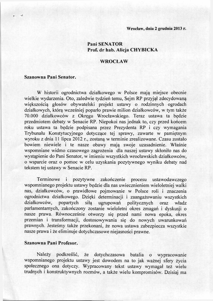 Wrocław, dnia 2 grudnia 2013 r. Pani SENATOR Prof. dr hab. Alicja CHYBICKA WROCŁAW Szanowna Pani Senator. W historii ogrodnictwa działkowego w Polsce mają miejsce obecnie wielkie wydarzenia. Oto, zaledwie tydzień temu, Sejm RP przyjął zdecydowaną większością głosów obywatelski projekt ustawy o rodzinnych ogrodach działkowych, którą wcześniej poparło prawie milion działkowców, w tym także 70.000 działkowców z Okręgu Wrocławskiego. Teraz ustawa ta będzie przedmiotem debaty w Senacie RP. Niepokoi nas jednak to, czy przed końcem roku ustawa ta będzie podpisana przez Prezydenta RP i czy wymagania Trybunału Konstytucyjnego dotyczące tej sprawy, zawarte w pamiętnym wyroku z dnia 11 lipca 2012 r., zostaną w terminie zrealizowane. Czasu zostało bowiem niewiele i te nasze obawy mają swoje uzasadnienie. Właśnie wspomniane widmo czasowego zagrożenia dla naszej ustawy skłoniło nas do wystąpienie do Pani Senator, w imieniu wszystkich wrocławskich działkowców, o wsparcie oraz o pomoc w celu uzyskania pozytywnego wyniku debaty nad tekstem tej ustawy w Senacie RP. Terminowe i pozytywne zakończenie procesu ustawodawczego wspomnianego projektu ustawy będzie dla nas uwiecznieniem wieloletniej walki nas, działkowców, o prawidłowe pojmowanie w Polsce roli i znaczenia ogrodnictwa działkowego. Dzięki determinacji i zaangażowaniu wszystkich działkowców, popartych siłą ugrupowań politycznych oraz władz parlamentarnych, zakończony zostanie wieloletni okres zmagań i dyskusji o nasze prawa. Równocześnie otworzy się przed nami nowa epoka, okres przemian i transformacji, dostosowywania się do nowych uwarunkowań prawnych. Jesteśmy także przekonani, że nowa ustawa zabezpiecza wszystkie nasze prawa i że eliminuje dotychczasowe niejasności prawne. Szanowna Pani Profesor. Należy podkreślić, że dotychczasowa batalia o wypracowanie wspomnianego projektu ustawy jest dowodem na to jak ważnej sfery życia społecznego ona dotyczy. Wypracowany tekst ustawy wymagał też wielu trudnych i konstruktywnych rozmów, a także wielu kompromisów. Dzisiaj ma wszelkie szanse na to, żeby być dowodem mądrości i rozsądku wszystkich zainteresowanych stron, przejawem opiekuńczej roli Państwa wobec najuboższych warstw społeczeństwa. Uważamy, że jest to bardzo dobry akt prawny nie wymagający już dalszych przeróbek. Zresztą na jakiekolwiek poprawki nie ma już czasu. Pozbawiono nas tego czasu w poprzednich miesiącach, podczas trudnej batalii sejmowej. Mamy nadzieję, że w przypadku Senatu RP prace nad ustawą będą zdecydowanie szybsze. Dlatego też w imieniu wszystkich wrocławskich działkowców zwracamy się do Pani Senator, jako naszego reprezentanta w Senacie, z gorącą prośbą o pełne poparcie tej ustawy, o przyczynienie się do tego żeby podczas prac Senatu nad omawianą ustawą i w dokonywanych przy niej działaniach nie przyczyniono się do przekroczenia terminu wyznaczonego przez Trybunał Konstytucyjny, żeby nie naruszono jej kształtu i treści. Będziemy Pani za to bardzo wdzięczni. Łączymy wyrazy szacunku i poważania. Członkowie Okręgowego Zarządu PZD we Wrocławiu Otrzymują: - Krajowa Rada PZD; - OZ PZD we Wrocławiu; - a/a