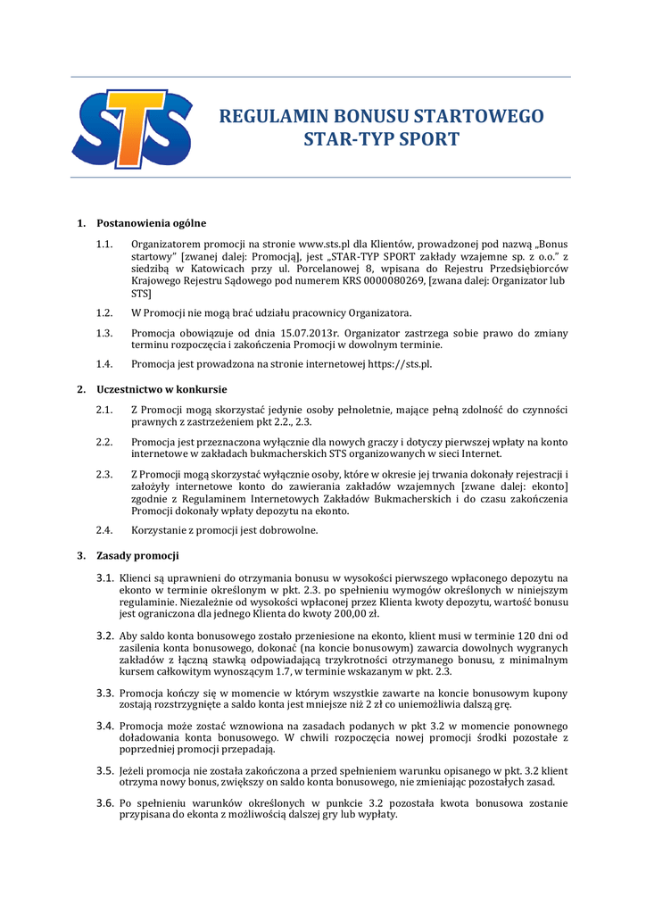 REGULAMIN BONUSU STARTOWEGO STAR-TYP SPORT 1. 2. 3. Postanowienia ogólne 1.1. Organizatorem promocji na stronie www.sts.pl dla Klientów, prowadzonej pod nazwą „Bonus startowy” [zwanej dalej: Promocją], jest „STAR-TYP SPORT zakłady wzajemne sp. z o.o.” z siedzibą w Katowicach przy ul. Porcelanowej 8, wpisana do Rejestru Przedsiębiorców Krajowego Rejestru Sądowego pod numerem KRS 0000080269, [zwana dalej: Organizator lub STS] 1.2. W Promocji nie mogą brać udziału pracownicy Organizatora. 1.3. Promocja obowiązuje od dnia 15.07.2013r. Organizator zastrzega sobie prawo do zmiany terminu rozpoczęcia i zakończenia Promocji w dowolnym terminie. 1.4. Promocja jest prowadzona na stronie internetowej https://sts.pl. Uczestnictwo w konkursie 2.1. Z Promocji mogą skorzystać jedynie osoby pełnoletnie, mające pełną zdolność do czynności prawnych z zastrzeżeniem pkt 2.2., 2.3. 2.2. Promocja jest przeznaczona wyłącznie dla nowych graczy i dotyczy pierwszej wpłaty na konto internetowe w zakładach bukmacherskich STS organizowanych w sieci Internet. 2.3. Z Promocji mogą skorzystać wyłącznie osoby, które w okresie jej trwania dokonały rejestracji i założyły internetowe konto do zawierania zakładów wzajemnych [zwane dalej: ekonto] zgodnie z Regulaminem Internetowych Zakładów Bukmacherskich i do czasu zakończenia Promocji dokonały wpłaty depozytu na ekonto. 2.4. Korzystanie z promocji jest dobrowolne. Zasady promocji 3.1. Klienci są uprawnieni do otrzymania bonusu w wysokości pierwszego wpłaconego depozytu na ekonto w terminie określonym w pkt. 2.3. po spełnieniu wymogów określonych w niniejszym regulaminie. Niezależnie od wysokości wpłaconej przez Klienta kwoty depozytu, wartość bonusu jest ograniczona dla jednego Klienta do kwoty 200,00 zł. 3.2. Aby saldo konta bonusowego zostało przeniesione na ekonto, klient musi w terminie 120 dni od zasilenia konta bonusowego, dokonać (na koncie bonusowym) zawarcia dowolnych wygranych zakładów z łączną stawką odpowiadającą trzykrotności otrzymanego bonusu, z minimalnym kursem całkowitym wynoszącym 1.7, w terminie wskazanym w pkt. 2.3. 3.3. Promocja kończy się w momencie w którym wszystkie zawarte na koncie bonusowym kupony zostają rozstrzygnięte a saldo konta jest mniejsze niż 2 zł co uniemożliwia dalszą grę. 3.4. Promocja może zostać wznowiona na zasadach podanych w pkt 3.2 w momencie ponownego doładowania konta bonusowego. W chwili rozpoczęcia nowej promocji środki pozostałe z poprzedniej promocji przepadają. 3.5. Jeżeli promocja nie została zakończona a przed spełnieniem warunku opisanego w pkt. 3.2 klient otrzyma nowy bonus, zwiększy on saldo konta bonusowego, nie zmieniając pozostałych zasad. 3.6. Po spełnieniu warunków określonych w punkcie 3.2 pozostała kwota bonusowa zostanie przypisana do ekonta z możliwością dalszej gry lub wypłaty. 3.7. Uczestnikowi Promocji nie przysługuje prawo do scedowania prawa do bonusu na osobę trzecią. 3.8. Wypłaty pierwszego wpłaconego depozytu do kwoty 200 zł można dokonać dopiero po zawarciu dowolnych wygranych zakładów z łączną stawką odpowiadającą jednokrotności kwoty depozytu do 200 zł, z minimalnym kursem całkowitym wynoszącym 1,5. Część kwoty pierwszego wpłaconego depozytu przewyższająca wartość 200 zł z wyłączeniem tej wartości, może być wypłacona w dowolnie wybranym momencie bez konieczności spełnienia warunków zawartych w punkcie 3.6. 3.9. Do promocji nie będą zaliczane zakłady na wydarzenia z oferty Zakłady Specjalne – „HIT DNIA”. 4. Postępowanie reklamacyjne i przedawnienie roszczeń 4.1. Ewentualne reklamacje zgłaszać należy drogą elektroniczną na adres e-mail: [email protected], podając dokładny opis i powód reklamacji oraz dane osoby zgłaszającej. 4.2. Reklamacje rozpatrywane będą przez Organizatora na podstawie niniejszego regulaminu w terminie do 30 dni od ich otrzymania. 4.3. W przedmiocie reklamacji ostateczna i wiążąca jest decyzja Organizatora. Uczestnik Promocji zostanie powiadomiony o decyzji drogą elektroniczną. 5. Postanowienia końcowe 5.1. Wszelkie spory wynikłe z tytułu wykonania zobowiązań związanych z niniejszą Promocją będą rozstrzygane przez Sąd właściwy dla siedziby Organizatora. 5.2. Zasady Promocji określa wyłącznie niniejszy regulamin. W kwestiach nie uregulowanych regulaminem stosuje się odpowiednie przepisy Kodeksu cywilnego, ustawy o grach hazardowych oraz Regulamin Internetowych Zakładów Bukmacherskich obowiązujący u Organizatora. 5.3. Wszelkie materiały reklamowe lub promocyjne rozpowszechniane w związku z Promocją, mają charakter wyłącznie informacyjny. 5.4. Regulamin konkursu dostępny jest na oficjalnej stronie internetowej Organizatora ( www.sts.pl). 5.5. Organizator zastrzega sobie prawo do wprowadzenia zmian w niniejszym regulaminie w dowolnym czasie. Zmiany wchodzą w życie w następnym dniu od ich ogłoszenia na stronie www.sts.pl. 5.6. Organizator zastrzega sobie prawo podejmowania indywidualnych decyzji wykluczających poszczególnych Klientów ze Sprzedaży Premiowej lub dopuszczających do Sprzedaży Premiowej. - Verte - ANEKS z dnia 18.11.2015 r. DO REGULAMINU BONUSU STARTOWEGO STAR-TYP SPORT Zmiana regulaminu Bonusu Startowego 1. Na podstawie pkt 5.5. regulaminu Bonusu Startowego z dniem 18.11.2015 r. Organizator dokonuje zmiany jego zasad. 2. Zmianie ulegają następujące punkty regulaminu: 2.1. Dotychczasowy punkt 3.2. regulaminu: Aby saldo konta bonusowego zostało przeniesione na ekonto, klient musi w terminie 120 dni od zasilenia konta bonusowego, dokonać (na koncie bonusowym) zawarcia dowolnych wygranych zakładów z łączną stawką odpowiadającą trzykrotności otrzymanego bonusu, z minimalnym kursem całkowitym wynoszącym 1,7, w terminie wskazanym w pkt. 2.3. Otrzymuje następujące brzmienie: Aby saldo konta bonusowego zostało przeniesione na ekonto, klient musi w 