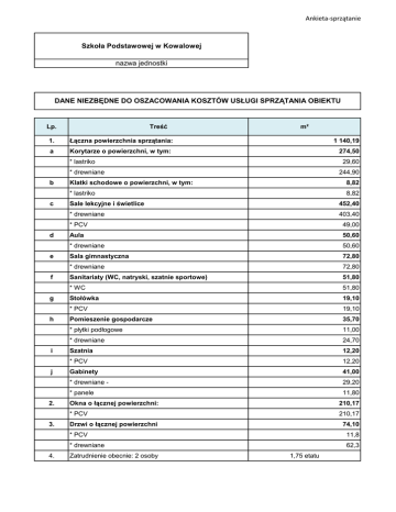 Ankieta-sprzątanie Szkoła Podstawowej w Kowalowej nazwa jednostki DANE NIEZBĘDNE DO OSZACOWANIA KOSZTÓW USŁUGI SPRZĄTANIA OBIEKTU Treść Lp. m² 1. Łączna powierzchnia sprzątania: 1 140,19 a Korytarze o powierzchni, w tym: 274,50 * lastriko 29,60 * drewniane b c d e f g h i j 2. 3. 4. 244,90 Klatki schodowe o powierzchni, w tym: 8,82 * lastriko 8,82 Sale lekcyjne i świetlice 452,40 * drewniane 403,40 * PCV 49,00 Aula 50,60 * drewniane 50,60 Sala gimnastyczna 72,80 * drewniane 72,80 Sanitariaty (WC, natryski, szatnie sportowe) 51,80 * WC 51,80 Stołówka 19,10 * PCV 19,10 Pomieszenie gospodarcze 35,70 * płytki podłogowe 11,00 * drewniane 24,70 Szatnia 12,20 * PCV 12,20 Gabinety 41,00 * drewniane - 29,20 * panele 11,80 Okna o łącznej powierzchni: 210,17 * PCV 210,17 Drzwi o łącznej powierzchni 74,10 * PCV 11,8 * drewniane 62,3 Zatrudnienie obecnie: 2 osoby 1,75 etatu Ankieta-sprzątanie SPECYFIKACJA SKŁADOWYCH CZĘŚCI USŁUGI SPRZĄTANIA OBIEKTU Rodzaj czynności i częstotliwość Lp. 1. Czynności wykonywane raz dziennie, 5 razy w tygodniu: a wycieranie na mokro powierzchni zmywalnych b odkurzanie wykładzin dywanowych c opróżnianie i mycie koszy na śmieci d zamiatanie podłóg e wycieranie na mokro ławek f mycie koszy na śmieci sanitariaty: g mycie umywalek, muszli klozetowych, pisuarów h mycie podłóg na mokro i mycie armatury 2. Czynności wykonywane raz na tydzień: a wycieranie na mokro krzeseł, mebli 3. Czynności wykonywane raz na dwa tygodnie: a czyszczenie włączników, gniazdek 4. Czynności wykonywane raz w miesiącu: a mycie glazury w toaletach - wegług potrzeb b mycie drzwi c czyszczenie kaloryferów d wycieranie miejsc trudno dostępnych 5. Czynności wykonywane dwa razy w roku: a mycie okien od strony wewnętrznej i zewnętrznej b konserwacja wykładzin podłogowych wg zaleceń producenta c mycie lamp d pastowanie parkietu e pranie firanek Wszelkie prace stanowiące ewentualny przedmiot umowy, powinny być wykonywanie według zaleceń producentów poszczególnych materiałów i urządzeń Cena oferty powinna zawierać wszystkie koszty związane z realizacją zamówienia, w tym koszty materiałów niezbędnych do realizacji zamówienia, a w szczególności: płyny do utrzymania czystości podłóg, mebli, sprzętów biurowych, pomieszczeń sanitarnych, powierzchni przeszklonych. Wykonawca ewentualnego zamówienia powinien być zobowiązany do wyposażenia swoich pracowników w: odzież firmową i identyfikatory, środki ochrony osobistej, sprzęt i środki niezbędne do wykonania zamówienia. Ankieta-sprzątanie Zespół Szkół w Lubczy nazwa jednostki DANE NIEZBĘDNE DO OSZACOWANIA KOSZTÓW USŁUGI SPRZĄTANIA OBIEKTU Treść Lp. m² 1. Łączna powierzchnia sprzątania: 2 377,93 a Korytarze o powierzchni, w tym: 549,57 * linoleum 549,57 Klatki schodowe o powierzchni, w tym: 35,51 gres 35,51 b c e f Sale lekcyjne i świetlice 1 029,76 *linoleum 748,76 *panele podłogowe 137,00 *wykładzina dywanowa 144,00 Sala gimnastyczna 185,00 *parkiet 185,00 Sanitariaty (WC, natryski, szatnie uczniowskie) 248,06 *linoleum g 2. 19,00 gres 229,06 Stołówka 64,48 *linoleum 64,48 Okna o łącznej powierzchni: 265,55 * PCV 252,45 * drewniane 3. 4. 13,10 Drzwi o łącznej powierzchni 121,38 * aluminiowe 19,62 * drewniane 101,76 Zatrudnienie obecnie - 4 osoby 3,25 etatu Ankieta-sprzątanie SPECYFIKACJA SKŁADOWYCH CZĘŚCI USŁUGI SPRZĄTANIA OBIEKTU Rodzaj czynności i częstotliwość Lp. 1. Czynności wykonywane raz dziennie, 5 razy w tygodniu: a wycieranie na mokro powierzchni zmywalnych b maszynowe mycie powierzchni korytarzy - nie c opróżnianie i wymiana worków foliowych w koszach na śmieci d wycieranie na mokro ławek i krzeseł,mebli e mycie misek na wodę do tablicy f mycie parapetów g ścieranie kurzu na szafkach w szatni h podlewanie kwiatków sanitariaty: i mycie umywalek, muszli klozetowych, pisuarów, czyszczenie luster j mycie podłóg na mokro k mycie armatury l mycie glazury w toaletach 2. Czynności wykonywane raz na tydzień: a mycie lamperii b mycie drzwii 3 x w tygodniu 3. Czynności wykonywane raz na dwa tygodnie: a czyszczenie włączników, gniazdek 4. Czynności wykonywane raz w miesiącu: a czyszczenie kaloryferów b wycieranie miejsc trudno dostępnych c dodatkowe sprzątanie w sobotę lub niedzielę sali gimnastycznej z zapleczem d mycie koszy na śmieci 5. Czynności wykonywane dwa razy w roku: a mycie okien od strony wewnętrznej i zewnętrznej (trzy razy w roku) b konserwacja wykładzin podłogowych wg zaleceń producenta c czyszczenie lamp Wszelkie prace stanowiące ewentualny przedmiot umowy, powinny być wykonywanie według zaleceń producentów poszczególnych materiałów i urządzeń Cena oferty powinna zawierać wszystkie koszty związane z realizacją zamówienia, w tym koszty materiałów niezbędnych do realizacji zamówienia, a w szczególności: Płyny do utrzymania czystości podłóg, mebli, sprzętów biurowych, pomieszczeń sanitarnych, powierzchni przeszklonych. Wykonawca ewentualnego zamówienia powinien być zobowiązany do wyposażenia swoich pracowników w: odzież firmową i identyfikatory, środki ochrony osobistej, sprzęt i środki niezbędne do wykonania zamówienia. Ankieta-sprzątanie Gimnazjum w Ryglicach nazwa jednostki DANE NIEZBĘDNE DO OSZACOWANIA KOSZTÓW USŁUGI SPRZĄTANIA OBIEKTU Treść Lp. m² 1. Łączna powierzchnia sprzątania: 5 331,10 a Korytarze o powierzchni, w tym: 1 756,00 * gres podłoga + ściany 1 592,50 b c d e 2. * odboje drewniane 163,50 Klatki schodowe o powierzchni, w tym: 132,50 * gres podłoga + ściany 132,50 Sale lekcyjne i świetlice 1 399,50 * parkiet 144,20 * PCV 605,30 * lamperia olejna 650,00 Sala gimnastyczna 677,00 * parkiet 677,00 Sanitariaty (WC, natryski, szatnie sportowe) 678,80 * gres 678,80 Okna o łącznej powierzchni: 687,30 * PCV parapety 3. 55,30 * drewniane 632,00 Drzwi o łącznej powierzchni 603,60 * aluminiowe 185,6 * drewniane 4. Zatrudnienie obe