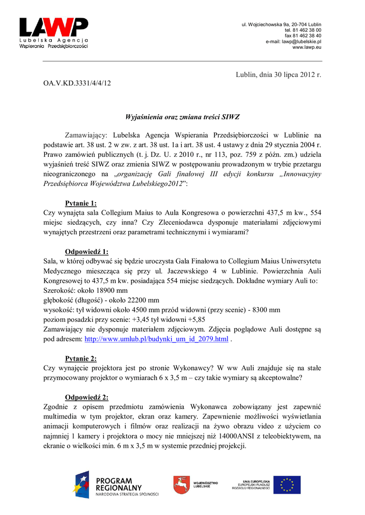 ul. Wojciechowska 9a, 20-704 Lublin tel. 81 462 38 00 fax 81 462 38 40 e-mail: [email protected] www.lawp.eu Lublin, dnia 30 lipca 2012 r. OA.V.KD.3331/4/4/12 Wyjaśnienia oraz zmiana treści SIWZ Zamawiający: Lubelska Agencja Wspierania Przedsiębiorczości w Lublinie na podstawie art. 38 ust. 2 w zw. z art. 38 ust. 1a i art. 38 ust. 4 ustawy z dnia 29 stycznia 2004 r. Prawo zamówień publicznych (t. j. Dz. U. z 2010 r., nr 113, poz. 759 z późn. zm.) udziela wyjaśnień treść SIWZ oraz zmienia SIWZ w postępowaniu prowadzonym w trybie przetargu nieograniczonego na „organizację Gali finałowej III edycji konkursu „Innowacyjny Przedsiębiorca Województwa Lubelskiego2012”: Pytanie 1: Czy wynajęta sala Collegium Maius to Aula Kongresowa o powierzchni 437,5 m kw., 554 miejsc siedzących, czy inna? Czy Zleceniodawca dysponuje materiałami zdjęciowymi wynajętych przestrzeni oraz parametrami technicznymi i wymiarami? Odpowiedź 1: Sala, w której odbywać się będzie uroczysta Gala Finałowa to Collegium Maius Uniwersytetu Medycznego mieszcząca się przy ul. Jaczewskiego 4 w Lublinie. Powierzchnia Auli Kongresowej to 437,5 m kw. posiadająca 554 miejsc siedzących. Dokładne wymiary Auli to: Szerokość: około 18900 mm głębokość (długość) - około 22200 mm wysokość: tył widowni około 4500 mm przód widowni (przy scenie) - 8300 mm poziom posadzki przy scenie: +3,45 tył widowni +5,85 Zamawiający nie dysponuje materiałem zdjęciowym. Zdjęcia poglądowe Auli dostępne są pod adresem: http://www.umlub.pl/budynki_um_id_2079.html . Pytanie 2: Czy wynajęcie projektora jest po stronie Wykonawcy? W ww Auli znajduje się na stałe przymocowany projektor o wymiarach 6 x 3,5 m – czy takie wymiary są akceptowalne? Odpowiedź 2: Zgodnie z opisem przedmiotu zamówienia Wykonawca zobowiązany jest zapewnić multimedia w tym projektor, ekran oraz kamery. Zapewnienie możliwości wyświetlania animacji komputerowych i filmów oraz realizacji na żywo obrazu video z użyciem co najmniej 1 kamery i projektora o mocy nie mniejszej niż 14000ANSI z teleobiektywem, na ekranie o wielkości min. 6 m x 3,5 m w systemie przedniej projekcji. ul. Wojciechowska 9a, 20-704 Lublin tel. 81 462 38 00 fax 81 462 38 40 e-mail: [email protected] www.lawp.eu Pytanie 3: Czy wymóg dołączenia do oferty wizualizacji scenografii przewiduje inne formaty niż flv, np. statyczna wizualizacja 3D? Odpowiedź 3: Zamawiający wymaga aby do oferty został dołączony projekt wizualizacji na płycie CD lub DVD w formacie Flash Video pliki flv lub DVD video. Stateczna wizualizacja 3D nie spełni oczekiwań Zamawiającego. Pytanie 4: W związku z prowadzonym postępowaniem przetargowym dot. Organizacji Gali Finałowej III edycji konkursu „Innowacyjny Przedsiębiorca Województwa Lubelskiego” 2012 zwracamy się z prośbą wystąpienie do Kanclerza Uniwersytetu Medycznego w Lublinie (…) o wydanie dokumentacji obiektu, w którym odbędzie się planowana gala, w szczególności rzutów i przekrojów auli Collegium Maius wraz z holem przed aulą (…). Odpowiedź 4: Zamawiający nie dysponuje rzutami Auli. Posiada natomiast jej wymiary, które zostały podane w odpowiedzi na pytanie 1. Pytanie 5: Czy oświetlenie należy też rozplanować we foyer i holu? czy Wykonawca ma za zadanie aby w swoim zakresie zapewnić tylko oświetlenie na auli? Odpowiedź 5: Zgonie z opisem przedmiotu zamówienia stanowiącym załącznik nr 1 do SIWZ, Wykonawca zobowiązany jest wykonać scenografię pomieszczeń Collegium Maius w Lublinie, tj. auli, w której zostanie przeprowadzona część oficjalna Gali: wystąpienia władz samorządowych, VIP-ów, przemówienia beneficjentów, wręczenie nagród, prezentacja filmów promocyjnych na temat nominowanych, koncerty gwiazd oraz foyer, w którym będzie odbywał się bankiet. Wykonawca zobowiązany jest wykonać scenografię główną w auli widowiskowej oraz oprawę plastyczną we foyer z wykorzystaniem tych samych technik. W obu pomieszczeniach przewidziana scenografia powinna być scenografią multimedialną realizowaną przy użyciu techniki światła i technologii LED-owej. Scenografia obu pomieszczeń (auli, foyer) nie powinna zawierać elementów stałych typu solwent, banery, elementów drewnianych, papierowych, materiałowych itp. (oprócz szczegółowego oznaczenia miejsca imprezy – patrz pkt 4 Opisu przedmiotu zamówienia – załącznik nr 1 do SIWZ). Pytanie 6: OA.IV.KD.3331/4/4/12 Wyjaśnienia oraz zmiana treści SIWZ. Strona 2 z 6 ul. Wojciechowska 9a, 20-704 Lublin tel. 81 462 38 00 fax 81 462 38 40 e-mail: [email protected] www.lawp.eu Czy możemy prosić o podanie wymiarów auli? tj. wysokość, szerokość, długość. Odpowiedź 6: Odpowiedź na to pytanie została udzielona w odpowiedzi na pytanie nr 1. Pytanie 7: Czy na auli dostępna jest scena? jeśli tak bardzo prosimy o podanie jej wymiarów. Odpowiedź 7: Na Auli Konferencyjnej Collegium Maius znajduje się scena w kształcie trapezu, a jej wymiary to: szerokość od strony widowni: 15000 mm; szerokość od strony zaplecza: 7000 mm; długość: 7000 mm; wysokość od strony widowni: 8000 mm; wysokość od strony zaplecza: 5000 mm. Pytanie 8: Jaką liczę osób należy zapewnić do pilnowania parkingu? Odpowiedź 8: Parking liczy 60 miejsc postojowych. Wykonawca powinien zapewnić taką ilość osób aby ruch samochodowy odbywał się w sposób niezakłócony. Pytanie 9: Czy Wykonawca, powinien zatrudnić w celu posprzątania auli oraz holu, profesjonalną firmę sprzątającą? która będzie miała za zadanie, sprzątnięcie łazienek, umycie powierzchni podłogowej, opróżnienie koszy na śmieci itp. czy po stronie Wykonawcy jest tylko sprzątnięcie tabliczek, oznaczeń oraz pozostałości po cateringu? Odpowiedź 9: Zgodnie ze wzorem umowy stanowiącym załącznik nr 3 do SIWZ, Wykonawca zobowiązany jest uporządkować salę i hol w których odbyły się Gala i bankiet. Zamawiający nie stawia