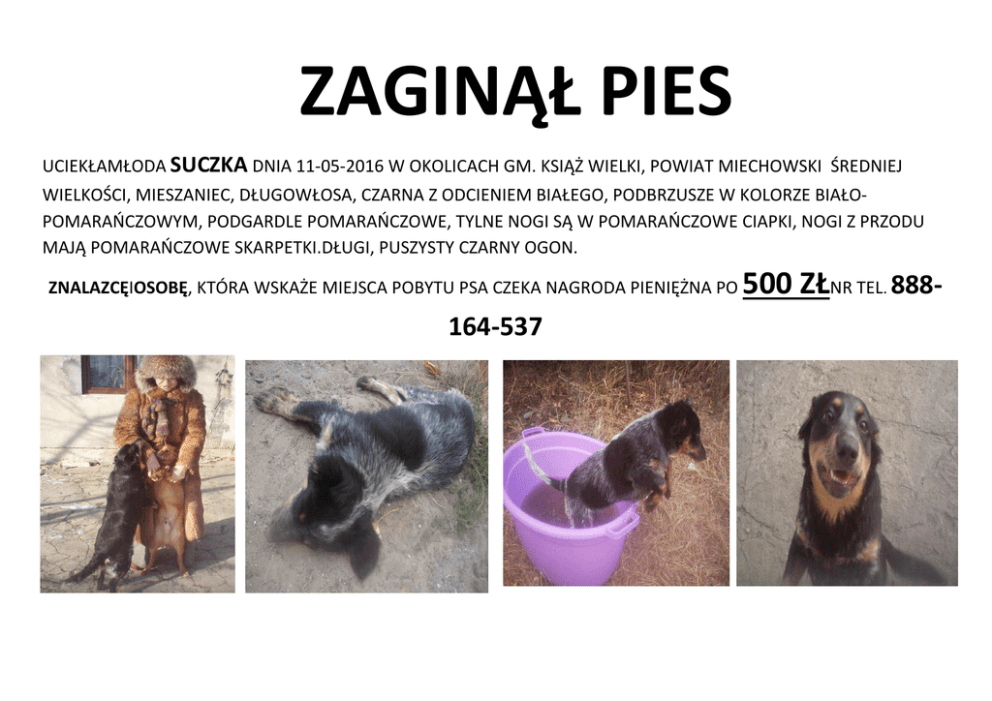 ZAGINĄŁ PIES UCIEKŁAMŁODA SUCZKA DNIA 11-05-2016 W OKOLICACH GM. KSIĄŻ WIELKI, POWIAT MIECHOWSKI ŚREDNIEJ WIELKOŚCI, MIESZANIEC, DŁUGOWŁOSA, CZARNA Z ODCIENIEM BIAŁEGO, PODBRZUSZE W KOLORZE BIAŁOPOMARAŃCZOWYM, PODGARDLE POMARAŃCZOWE, TYLNE NOGI SĄ W POMARAŃCZOWE CIAPKI, NOGI Z PRZODU MAJĄ POMARAŃCZOWE SKARPETKI.DŁUGI, PUSZYSTY CZARNY OGON. ZNALAZCĘIOSOBĘ, KTÓRA WSKAŻE MIEJSCA POBYTU PSA CZEKA NAGRODA PIENIĘŻNA PO 164-537 500 ZŁNR TEL. 888-