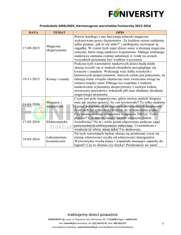 Przedszkole ANIELINEK, Harmonogram warsztatów Funiversity 2015-2016 DATA TEMAT 17-09-2015 Magiczne eksperymenty 19-11-2015 Kwasy i zasady 21-01-2016 Magnesy i magnetyzm 17-03-2016 Elektrostatyka 19-05-2016 Laboratorium kosmetyczne OPIS Prawie każdego z nas fascynują sztuczki magiczne wykonywane przez iluzjonistów. Za każdym razem zadajemy sobie pytanie „jak to się stało?” i próbujemy rozwiązać tę zagadkę. W czasie tych zajęć dzieci same wykonają magiczne sztuczki, które mają naukowe wyjaśnienie. Małego szalonego naukowca zamiana czarnej substancji w wodę na oczach wszystkich przestanie być wielkim wyczynem. Podczas tych warsztatów naukowych dzieci będą miały okazję wcielić się w małych chemików przyglądając się kwasom i zasadom. Wykonają więc kilka wesołych i kolorowych eksperymentów, których celem jest pokazanie, że istnieją różne związki chemiczne oraz zwrócenia uwagi na różnice między nimi. Dlatego też wspólnie z małymi naukowcami wykonamy eksperymenty z suchym lodem, stworzymy prawdziwy wskaźnik pH oraz zbadamy działanie magicznego atramentu. Czym jest pole magnetyczne, gdzie można znaleźć bieguny oraz jak można sprawić, by coś lewitowało? To tylko niektóre z pojęć poruszanych na zajęciach poświęconych magnesom. A od nich już tylko mały kroczek do wynalezienia prądu. Czy można dotknąć urządzenia o napięciu 200 tyś. Volt i przeżyć? Czy można zapalić swoim własnym ciałem świetlówkę? Na te i wiele pytań odpowiemy podczas zajęć poświęconych elektryczności statycznej. Uczestnikom z wrażenia aż włosy staną dęba! I to dosłownie. Na tych warsztatach będzie okazja się przekonać czym się różnią właściwości mydła od właściwości detergentów. Wytworzymy trochę piany i wspaniałe musujące zapachy do kąpieli! Czy to chemia czy fizyka? Przekonacie sie sami! 1