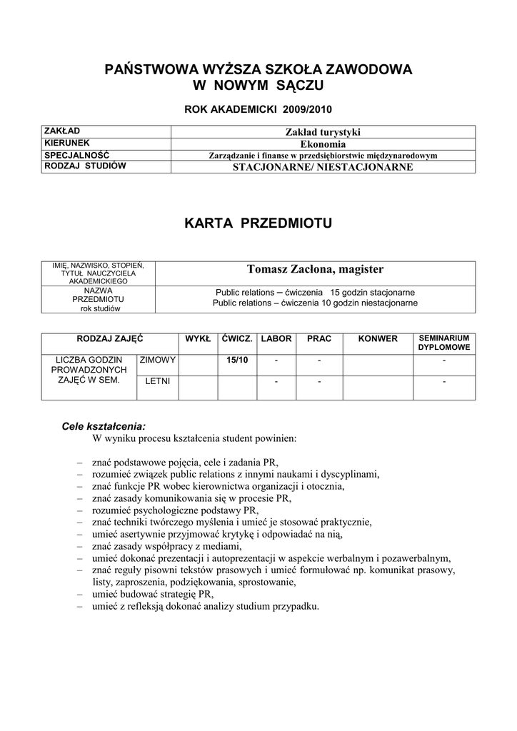 PAŃSTWOWA WYŻSZA SZKOŁA ZAWODOWA W NOWYM SĄCZU ROK AKADEMICKI 2009/2010 ZAKŁAD KIERUNEK SPECJALNOŚĆ RODZAJ STUDIÓW Zakład turystyki Ekonomia Zarządzanie i finanse w przedsiębiorstwie międzynarodowym STACJONARNE/ NIESTACJONARNE KARTA PRZEDMIOTU IMIĘ, NAZWISKO, STOPIEŃ, TYTUŁ NAUCZYCIELA AKADEMICKIEGO Tomasz Zacłona, magister NAZWA PRZEDMIOTU rok studiów Public relations – ćwiczenia 15 godzin stacjonarne Public relations – ćwiczenia 10 godzin niestacjonarne RODZAJ ZAJĘĆ LICZBA GODZIN PROWADZONYCH ZAJĘĆ W SEM. WYKŁ ZIMOWY LETNI ĆWICZ. LABOR 15/10 PRAC KONWER SEMINARIUM DYPLOMOWE - - - - - - Cele kształcenia: W wyniku procesu kształcenia student powinien: – – – – – – – – – – znać podstawowe pojęcia, cele i zadania PR, rozumieć związek public relations z innymi naukami i dyscyplinami, znać funkcje PR wobec kierownictwa organizacji i otocznia, znać zasady komunikowania się w procesie PR, rozumieć psychologiczne podstawy PR, znać techniki twórczego myślenia i umieć je stosować praktycznie, umieć asertywnie przyjmować krytykę i odpowiadać na nią, znać zasady współpracy z mediami, umieć dokonać prezentacji i autoprezentacji w aspekcie werbalnym i pozawerbalnym, znać reguły pisowni tekstów prasowych i umieć formułować np. komunikat prasowy, listy, zaproszenia, podziękowania, sprostowanie, – umieć budować strategię PR, – umieć z refleksją dokonać analizy studium przypadku. Treści kształcenia: Przedmioty (grup A, B i C, D), dla których treści standardowe są określone w standardach nauczania MENiS musza być uwzględnione (w niezmienionej treści) w danym programie autorskim. TEMATYKA ZAJĘĆ (WG. PROWADZONYCH RODZAJÓW ZAJĘĆ) LICZBA GODZIN S LICZBA GODZIN NS 2 2 TEMATYKA ĆWICZEŃ: 1. Public relations – podstawowe pojęcia, definicje, zadania. Public relations w strukturze nauk. Otoczenie organizacji. Ogólne, pośrednie i bieżące cele działalności PR. Funkcje public relations. 2. Psychologia komunikacji masowej i reklamy. 2 3. Kampanie społeczne. 2 2 2 4 2 1 1 4. Prezentacja i autoprezentacja, wystąpienia publiczne (aspekt werbalny i niewerbalny). 5. Środki masowego przekazu. Rynek mediów w Polsce. Zasady współpracy z mediami. Wywiad prasowy – prawo prasowe. 6. Reguły pisania sprostowanie). tekstów Informacja prasowych bezpośrednia (komunikat (listy, prasowy, zaproszenia, 1 podziękowania). Konferencja prasowa. 7. Sytuacja kryzysowa. Reakcja na krytykę. Techniki twórczego 2 myślenia. Studium przypadku. 1 8. Etyka PR. Metody zbierania informacji o otoczeniu. Uzyskane umiejętności – – – – – – budowania strategii komunikacyjnych przedsiębiorstw, budowania wizerunku organizacji i osób, współpracy z mediami, pisania notatki prasowej, organizowania konferencji prasowej, prawidłowego reagowania w sytuacjach kryzysowych. Forma oceny uzyskanej wiedzy: – – – – – – zaliczenie pisemne, aktywność na zajęciach, prezentacja projektu kampanii społecznej, autoprezentacja (wystąpienie indywidualne studenta), symulacja konferencji prasowej. RAZEM max 20 pkt. max 5 pkt. max 10 pkt. max 10 pkt. max 5 pkt. max 50 pkt. 1 Literatura: WYKAZ ZALECANEJ LITERATURY A/ Podstawowa: 1. S. Black, Public Relations, Oficyna Ekonomiczna Kraków 2003. 2. E. M. Cenker, Public Relations, Wyższa Szkoła Bankowa, Poznań 2000. 3. K. Wójcik, Public Relations, Wiarygodny dialog z otoczeniem, Placet, Warszawa 2005. B/ Uzupełniająca: 1. J. Altkorn, Wizerunek firmy, Wyższa Szkoła Biznesu w Dąbrowie Górniczej, Dąbrowa Górnicza 2004. 2. Public relations. Znaczenie społeczne i kierunki rozwoju, [red.:] J. Olędzki, D. Tworzydło, PWN, Warszawa 2006. 3. Rozwadowska B. Public Relations. Teoria, praktyka, perspektywy, Studio Emka, Warszawa 2002. ......................................... Kierownik Zakładu ........................................ Dyrektor Instytutu Zacłona Tomasz ............................................ Prowadzący