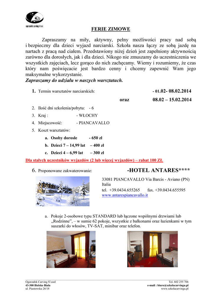 FERIE ZIMOWE Zapraszamy na miły, aktywny, pełny możliwości pracy nad sobą i bezpieczny dla dzieci wyjazd narciarski. Szkoła nasza łączy ze sobą jazdę na nartach z pracą nad ciałem. Przedstawiony niżej dzień jest zapełniony aktywnością zarówno dla dorosłych, jak i dla dzieci. Nikogo nie zmuszamy do uczestniczenia we wszystkich zajęciach, lecz gorąco do nich zachęcamy. Wiemy i rozumiemy, że czas który nam poświęcacie jest bardzo cenny i chcemy zapewnić Wam jego maksymalne wykorzystanie. Zapraszamy do udziału w naszych warsztatach. 1. Termin warsztatów narciarskich: - 01.02- 08.02.2014 oraz 08.02 – 15.02.2014 2. Ilość dni szkolenia/pobytu: - 6 3. Kraj : - WŁOCHY 4. Miejscowość: - PIANCAVALLO 5. Koszt warsztatów: a. Osoby dorosłe - 650 zł b. Dzieci 7 – 14,99 lat – 400 zł c. Dzieci 4 – 6,99 lat – 300 zł Dla stałych uczestników wyjazdów (2 lub więcej wyjazdów) – rabat 100 ZŁ 6. Proponowane zakwaterowanie: -HOTEL ANTARES**** 33081 PIANCAVALLO Via Barcis - Aviano (PN) Italia tel. +39.0434.655265 fax. +39.0434.655595 www.antarespiancavallo.it a. Pokoje 2-osobowe typu STANDARD lub łączone wspólnymi drzwiami lub „Rodzinne”, – w sumie 62 pokoje, wszystkie z balkonami oraz łazienkami w tym suszarki do włosów, TV-SAT, minibar oraz telefon. _________________________________________________________________________________________________________________ Ogorzałek Carving S’cool Tel. 602 255 706 43-300 Bielsko Biała e-mail : [email protected] ul. Piastowska 26/18 www.szkolacarvingu.pl 7. Koszt zakwaterowania wraz ze skipassami: a. - 450 euro - osoba dorosła b. Ulgi dla dzieci do lat 15 (jako 3osoba w pokoju) 8. Koszt zawiera: a. 7 x nocleg z wyżywieniem HB b. Skipass – 6 dni 9. Koszt nie zawiera: - dojazdu - warsztatów narciarskich - ubezpieczenia (zaleca się wykupienie ubezpieczenia turystycznego wraz z opcją amatorskie uprawianie narciarstwa i snowbordingu oraz ubezpieczenia OC) - napoje do kolacji za dodatkową opłatą Materiały szkoleniowe: www.szkolacarvingu.pl/technika SKIPOL – ciekawa maszynka do pracy nad techniką jazdy. OPIS Ośrodek narciarski w Piancavallo jest położony w górskiej dolinie na wysokości 1300 m n.p.m., w odległości 70 km na od Wenecji. Jest to pierwszy masyw górski, Monte Cavallo, na północ od Adriatyku. To cicha i spokojna stacja narciarska nie zatłoczona turystami. Jest to miejsce wręcz wymarzone do narciarskiego szkolenia i zimowego wypoczynku. Oprócz licznych tras zjazdowych dostępne są tutaj trasy biegowe, lodowisko a nawet trasy przygotowane pod jazdę psimi zaprzęgami, nocna jazda na nartach z pochodniami i wiele innych atrakcji. Wyjazdy w okresie ferii zimowych to wyjazdy dla rodzin z dziećmi i młodzieży. Usytuowanie Hotelu pozwala na wygodne dojście do stoku szkoleniowego (150 m), gdzie dzieci, pod okiem instruktora będą się bezpiecznie bawić w narciarstwo a wszystkie osoby chcące popracować nad swoją techniką jazdy uczestniczyć mogą w prowadzonych przez nas zajęciach. Po przeciwnej stronie Hotelu (300 m) znajduje się kompleks wyciągów narciarskich, gdzie jeździć można bez żadnych ograniczeń. 2 PROGRAM WARSZTATÓW: Sobota: 17.00 - przyjazd i zakwaterowanie 19.00 - kolacja 20.30 - spotkanie organizacyjna Niedziela: 7.00 - powitanie słońca, ćwiczenia oddechowe, poranna medytacja. 8.00 - śniadanie 9.30 - 12.00 - warsztaty na stoku. 12.00 - 13.00 - przerwa na posiłek. 13.00 - 14.00 - kamera na stoku. 14.00 - 16.00 - jazda po trasach. 15.00 - 19.00 - dla dzieci zajęcia z animatorem 18.00 - 18.45 - bodycarving, ćwiczenia rozciągające bazujące na hatajoga. 19.00 - kolacja 20.00 - wideoanaliza, wykład "balans, nie tylko w narciarstwie" Poniedziałek: 7.00 - powitanie słońca, ćwiczenia oddechowe, poranna medytacja. 8.00 - śniadanie 9.30 - 12.00 - warsztaty na stoku. 12.00 - 12.30 - kamera na stoku 12.30 - 13.30 - przerwa na posiłek. 13.30 - 15.00 - rozjeżdżenie. 15.00 - 19.00 - dla dzieci zajęcia z animatorem 18.00 - 18.45 - bodycarving, ćwiczenia rozciągające bazujące na hatajoga. 19.00 - kolacja 20.00 - wideoanaliza, wykład "teoria punktu zero" Wtorek: 7.00 - powitanie słońca, ćwiczenia oddechowe, poranna medytacja. 8.00 - śniadanie 9.30 - 12.00 - warsztaty na stoku. 12.00 - 12.30 - kamera na stoku 12.30 - 13.30 - przerwa na posiłek. 13.30 - 15.00 - rozjeżdżenie. 15.00 - 19.00 - dla dzieci zajęcia z animatorem 18.00 - 18.45 - lodowisko 19.00 - kolacja 20.00 - czas wolny, odpoczynek. Środa: 7.00 - powitanie słońca, ćwiczenia oddechowe, poranna medytacja. 8.00 - śniadanie 9.30 - 12.00 - warsztaty na stoku. 12.00 - 12.30 - kamera na stoku 12.30 - 13.30 - przerwa na posiłek. 3 13.30 - 15.00 - rozjeżdżenie. 15.00 - 19.00 - dla dzieci zajęcia z animatorem 18.00 - 18.45 - bodycarving, ćwiczenia rozciągające bazujące na hatajoga. 19.00 - kolacja 20.00 - wideoanaliza, dyskusja i przemyślenia. Czwartek: 7.00 - powitanie słońca, ćwiczenia oddechowe, poranna medytacja. 8.00 - śniadanie 9.30 - 12.00 - warsztaty na stoku. 12.00 - 12.30 - kamera na stoku 12.30 - 13.30 - przerwa na posiłek. 13.30 - 15.00 - rozjeżdżenie. 15.00 - 19.00 - dla dzieci zajęcia z animatorem 18.00 - 18.45 - bodycarving, ćwiczenia rozciągające bazujące na hatajoga. 19.00 - kolacja 20.00 - wideoanaliza, własna korekta. Piątek: 7.00 - powitanie słońca, ćwiczenia oddechowe, poranna medytacja. 8.00 - śniadanie 9.30 - 12.00 - warsztaty na stoku. 12.00 - 12.30 - kamera na stoku 12.30 - 13.30 - przerwa na posiłek. 13.30 - 15.00 - rozjeżdżenie. 15.00 - 19.00 - dla dzieci zajęcia z animatorem 18.00 - 18.45 - bodycarving, ćwiczenia rozciągające bazujące na hatajoga. 19.00 - kolacja 20.00 - zakończenie warsztatów. Wnioski i sugestie. Sobota 7.00 -śniadanie 10.00 - powrót do domu. Szkoła odpowiada za część warsztatową wyjazdu. Udział we wszystkich zajęciach dozwolony – nieobowiązkowy 4
