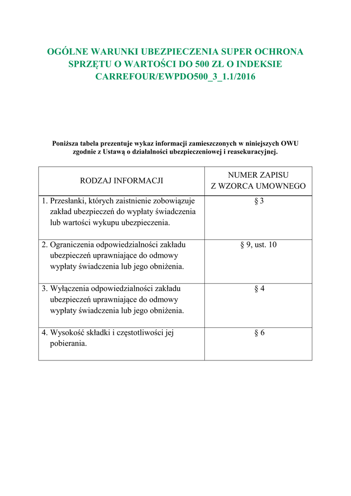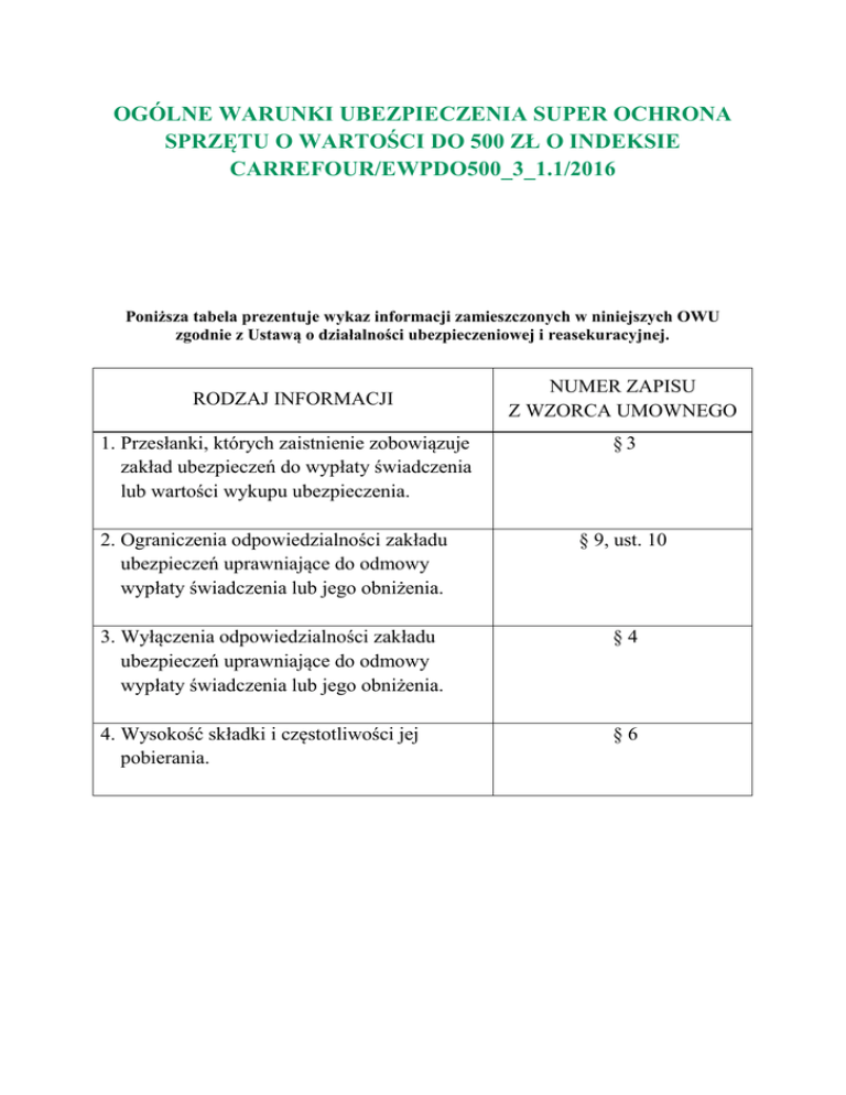 OGÓLNE WARUNKI UBEZPIECZENIA SUPER OCHRONA SPRZĘTU O WARTOŚCI DO 500 ZŁ O INDEKSIE CARREFOUR/EWPDO500_3_1.1/2016 Poniższa tabela prezentuje wykaz informacji zamieszczonych w niniejszych OWU zgodnie z Ustawą o działalności ubezpieczeniowej i reasekuracyjnej. RODZAJ INFORMACJI 1. Przesłanki, których zaistnienie zobowiązuje zakład ubezpieczeń do wypłaty świadczenia lub wartości wykupu ubezpieczenia. NUMER ZAPISU Z WZORCA UMOWNEGO §3 2. Ograniczenia odpowiedzialności zakładu ubezpieczeń uprawniające do odmowy wypłaty świadczenia lub jego obniżenia. § 9, ust. 10 3. Wyłączenia odpowiedzialności zakładu ubezpieczeń uprawniające do odmowy wypłaty świadczenia lub jego obniżenia. §4 4. Wysokość składki i częstotliwości jej pobierania. §6 §1 POSTANOWIENIA OGÓLNE 1. 2. 3. Ogólne Warunki Ubezpieczenia Sprzętu o wartości do 500 zł (dalej „OWU”) stosuje się w Umowach ubezpieczenia zawieranych pomiędzy Cardif Assurances Risques Divers S.A. Oddział w Polsce, z siedzibą w Warszawie przy pl. Piłsudskiego 2 (dalej: „Ubezpieczyciel”) a Ubezpieczającymi, które dotyczą ubezpieczenia Sprzętu o wartości do 500 zł, zakupionego w sieci marketów firmy Carrefour Polska sp. z o. o z siedzibą w Warszawie, ulica Targowa 72 (dalej: „Carrefour”). Do realizacji postanowień OWU w imieniu i na rzecz Ubezpieczyciela uprawnione jest SPB Polska Sp. z o.o. z siedzibą w Warszawie, ul. Grzybowska 45 (dalej: „Centrum Autoryzacji Szkód” lub „CAS”). Do zakresu uprawnień CAS należy: a) weryfikacja ważności uprawnień wynikających z Umowy ubezpieczenia na warunkach określonych w OWU, b) przyjmowanie zgłoszenia szkody, c) przyznawanie lub odmowa odszkodowania wynikającego z Umowy ubezpieczenia w imieniu Ubezpieczyciela, d) przyjmowanie odstąpień od Umowy ubezpieczenia, e) przyjmowanie wniosków o zmianę danych osobowych. §2 DEFINICJE Terminom użytym w OWU oraz we wszelkich innych dokumentach składających się na treść Umowy ubezpieczenia nadano następujące znaczenia: 1) Akcesoria dodatkowe: zdefiniowane przez producenta doposażenie niestanowiące kompletu eksploatacyjnego z ubezpieczonym Sprzętem. 2) Awaria: nagłe uszkodzenie Sprzętu w wyniku wewnętrznych czynników typu mechanicznego, elektrycznego, elektronicznego, pneumatycznego lub hydraulicznego, powstałe podczas jego użytkowania zgodnie z instrukcją producenta, zakłócające prawidłowe funkcjonowanie lub powodujące unieruchomienie ubezpieczonego Sprzętu, skutkujące koniecznością naprawy, wymiany uszkodzonych części lub całego Sprzętu. 3) Cena zakupu: kwota brutto (wraz z podatkiem VAT), za którą Konsumentowi jest oferowany Sprzęt, nieuwzględniająca rabatu przyznanego przez Carrefour. 4) Centrum Autoryzacji Szkód („CAS”): SPB Polska Sp. z o.o. z siedzibą w Warszawie, ul. Grzybowska 45, podmiot współpracujący z Ubezpieczycielem wskazany do kontaktu z Ubezpieczonymi w celu przyjęcia zgłoszenia szkody, przeprowadzenia procesu likwidacji szkody i/lub udzielenia świadczenia według OWU. 5) Karta upominkowa Carrefour: plastikowa karta typu pre-paid lub bon papierowy, wystawiane na okaziciela, o równowartości odpowiadającej Wartości wymiany, umożliwiające dokonywanie zakupu towarów z oferty handlowej sklepu Carrefour. 6) Konsument: osoba fizyczna dokonująca czynności prawnej niezwiązanej bezpośrednio z jej działalnością gospodarczą lub zawodową, w rozumieniu art. 221 Kodeksu cywilnego. 7) Materiały eksploatacyjne: materiały zdefiniowane przez producenta jako materiał eksploatacyjny lub zużywająca się część, podlegająca okresowej wymianie, niezbędne do funkcjonowania Sprzętu. 8) Nieszczęśliwy wypadek: nagłe zdarzenie, które nastąpiło w okresie odpowiedzialności Ubezpieczyciela, wywołane wyłącznie i bezpośrednio przyczyną zewnętrzną, przypadkowe, niezależnego od woli i stanu zdrowia Ubezpieczonego, polegającego na nagłym działaniu mechanicznej siły zewnętrznej, powodującej przerwanie funkcji lub nieprawidłowe funkcjonowanie Sprzętu lub którejkolwiek z jego części, wymagające naprawy w celu przywrócenia prawidłowej funkcjonalności Sprzętu. 9) Osoby bliskie: osoby zamieszkałe na stałe z Ubezpieczającym i prowadzące z nim wspólne gospodarstwo domowe (współmałżonek lub konkubent, wstępni, zstępni, rodzeństwo, teściowie, zięciowie, synowe, przysposabiający i przysposobieni). 10) Osoba trzecia: uważa się wszystkie osoby pozostające poza stosunkiem ubezpieczeniowym, niewymienione w pkt. 9) powyżej. 11) Osoba składająca Skargę: Ubezpieczający, Ubezpieczony lub Uprawniony z Umowy ubezpieczenia. 12) Przepięcie prądu: wzrost napięcia w liniach energetycznych powstały na skutek wyładowań elektrycznych z atmosfery lub spięcia przewodów na linii przesyłowej w wyniku działania siły zewnętrznej. 13) Skarga: wystąpienie Osoby składającej Skargę dotyczące jakości usług świadczonych przez Ubezpieczyciela, w tym zawarcia i realizacji Umowy ubezpieczenia lub wykonywanej przez Ubezpieczyciela działalności. Przez Skargę należy również rozumieć reklamację, zażalenie lub odwołanie od decyzji Ubezpieczyciela. 14) Składka: kwota należna Ubezpieczycielowi od Ubezpieczającego z tytułu udzielania ochrony ubezpieczeniowej. 15) Sprzęt: fabrycznie nowy Sprzęt małe AGD, Sprzęt TV, Sprzęt RTV/Audio, Sprzęt komputerowy, Sprzęt przenośny, który został zakupiony przez Ubezpieczającego w sieci marketów Carrefour, którego dane figurują we Wnioskopolisie i w dokumencie zakupu potwierdzającym dokonanie opłaty za Sprzęt oraz uiszczenie Składki za jego ubezpieczenie. Ochroną ubezpieczeniową może być objęty sprzęt, którego Cena zakupu nie przekracza kwoty 500 zł. a) Sprzęt komputerowy: drukarki, urządzenia wielofunkcyjne, monitory, skanery, plotery, komputery stacjonarne, sprzęt komputerowy wchodzący w skład lub współpracujący z komputerami przenośny
