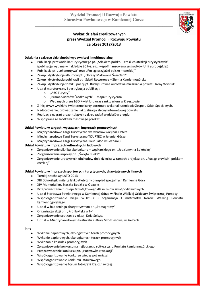 Wydział Promocji i Rozwoju Powiatu Starostwa Powiatowego w Kamiennej Górze __________________________________________________________________ Wykaz działań zrealizowanych przez Wydział Promocji i Rozwoju Powiatu za okres 2012/2013 Działania z zakresu działalności wydawniczej i multimedialnej Publikacja przewodnika turystycznego pt. „Szlakiem polsko – czeskich atrakcji turystycznych” (publikacja wydana w nakładzie 20 tys. egz. współfinansowana ze środków Unii europejskiej) Publikacja pt. „Lokomotywa” oraz „Pociąg przyjaźni polsko – czeskiej” Zakup i dystrybucja albumów pt. „Obrazy Malowane Światłem” Zakup i dystrybucja publikacji pt.: Szlaki Rowerowe – Ziemia Kamiennogórska Zakup i dystrybucja tomiku poezji pt. Ruchy Browna autorstwa mieszkanki powiatu Ireny Wyciślik Udział merytoryczny i dystrybucja publikacji: o „ABC Turysty” o „Brama Sudetów Środkowych” – mapa turystyczna o Wydanych przez LGD Kwiat Lnu oraz sanktuarium w Krzeszowie Z inicjatywy wydziału świąteczne karty pocztowe wykonali uczniowie Zespołu Szkół Specjalnych. Nadzorowanie, prowadzenie i aktualizacja strony internetowej powiatu Realizacja nagrań prezentujących zakres zadań wydziałów urzędu Współpraca ze środkami masowego przekazu. Udział Powiatu w targach, wystawach, imprezach promocyjnych Międzynarodowe Targi Turystyczne we wrocławskiej hali Orbita Międzynarodowe Targi Turystyczne TOURTEC w Jeleniej Górze Międzynarodowe Targi Turystyczne Tour Salon w Poznaniu Udział Powiatu w imprezach kulturalnych i ludowych Zorganizowanie pikniku ekologiczno – wędkarskiego pn. „Jedziemy na Bukówkę” Zorganizowanie imprezy pn. „Święto mleka” Zorganizowanie uroczystych obchodów dnia dziecka w ramach projektu pn. „Pociąg przyjaźni polsko – czeskiej” Udział Powiatu w imprezach sportowych, turystycznych, charytatywnych i innych Turniej szachowy LATO 2013 XIII Dolnośląski mityng lekkoatletyczny olimpiad specjalnych Kamienna Góra XIV Memoriał im. Staszka Bodzka w Opawie Przeprowadzenie turnieju Mikołajkowego dla uczniów szkół podstawowych Udział Starostwa Powiatowego w Kamiennej Górze w Finale Wielkiej Orkiestry Świątecznej Pomocy Współorganizowanie biegu WOPISTY i organizacja I mistrzostw Nordic Walking Powiatu kamiennogórskiego Udział w happeningu charytatywnym pr. „Pomagramy” Organizacja akcji pn. „Profilaktyka a Ty” Zorganizowanie spotkania z okazji Dnia Sołtysa Udział w Międzynarodowym Festiwalu Kultury Młodzieżowej w Kielcach Inne Wykonie papierowych, ekologicznych toreb promocyjnych Wykonie papierowych, ekologicznych teczek promocyjnych Wykonanie koszulek promocyjnych Zorganizowanie konkursu na najlepszego sołtysa wsi z Powiatu kamiennogórskiego Przeprowadzenie konkursu pn. „Pocztówka z wakacji” Współorganizowanie konkursu wiedzy pożarniczej Współorganizowanie konkursu latawcowego Współorganizowanie Forum fotografii Krajoznawczej Wydział Promocji i Rozwoju Powiatu Starostwa Powiatowego w Kamiennej Górze __________________________________________________________________ Zainicjowanie i koordynacja spotkań przedstawicieli samorządów z powiatu ws. działań promocyjnych Opracowanie sprawozdania z realizacji Strategii Zrównoważonego Rozwoju Powiatu Kamiennogórskiego na lata 2012-2020 Przeprowadzenie ankiety pn. „Kolej – czy jest nam potrzebna?” Współpraca z organizacjami pozarządowymi wynikająca z ustawy o pożytku publicznym i wolontariacie Współpraca ze Stowarzyszeniem Lokalna Grupa Działania „Kwiat Lnu” Współpraca z organizacjami pozarządowymi w formie zlecania lub wspierania zadań publicznych. Zlecenie zadań odbyło się po przeprowadzeniu otwartych konkursów lub w trybie pozakonkursowym zgodnie z art. 19a Pozyskiwanie środków i realizacja projektów współfinansowanych ze źródeł zewnętrznych: Pozyskanie środków oraz realizacja projektów współfinansowanych ze źródeł zewnętrznych pn.: „Szlakiem polsko – czeskich atrakcji turystycznych” współfinansowany ze środków Unii Europejskiej w ramach PO EWT Czechy – Polska na lata 2007-2013, „Rewitalizacja systemu szlaków rowerowych na terenie powiatu kamiennogórskiego” współfinansowany ze środków Unii Europejskiej w ramach PROW, „Poprawa jakości powietrza poprzez wymianę źródła ciepła w kompleksie budynków Domu Pomocy Społecznej w Szarocinie z zastosowaniem geotermii” współfinansowany ze środków Unii Europejskiej w ramach RPO WD na lata 2007-2013, „Jedziemy na bukówkę”, współfinansowany ze środków Wojewódzkiego Funduszu Ochrony Środowiska i Gospodarki Wodnej we Wrocławiu, „Poznajmy się. Zajęcia edukacyjne dla uczniów szkół specjalnych polsko – czeskiego pogranicza” współfinansowany ze środków Unii Europejskiej w ramach PO EWT Czechy – Polska na lata 2007-2013, „Pociąg przyjaźni polsko – czeskiej” współfinansowany ze środków Unii Europejskiej w ramach PO EWT Czechy – Polska na lata 2007-2013, „Równać szanse” współfinansowany ze środków Unii Europejskiej w ramach PO KL na lata 2007-2013, „Nowa jakość zarządzania w partnerstwie 6 jst” współfinansowany ze środków Unii Europejskiej w ramach PO KL na lata 2007-2013, Aplikowanie o dofinansowanie projektu pn.: „Nasze tradycje. Transgraniczne zajęcia edukacyjne dla uczniów szkół specjalnych polsko-czeskiego pogranicza.