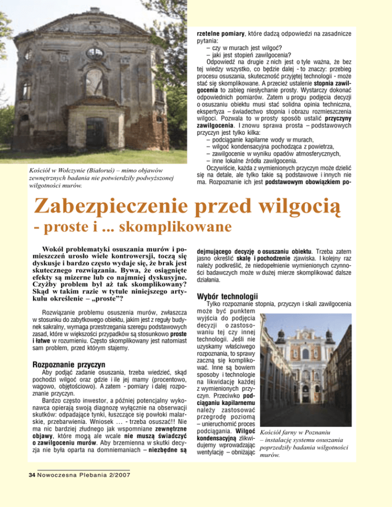 Kościół w Wołczynie (Białoruś) – mimo objawów zewnętrznych badania nie potwierdziły podwyższonej wilgotności murów. rzetelne pomiary, które dadzą odpowiedzi na zasadnicze pytania: – czy w murach jest wilgoć? – jaki jest stopień zawilgocenia? Odpowiedź na drugie z nich jest o tyle ważna, że bez tej wiedzy wszystko, co będzie dalej - to znaczy: przebieg procesu osuszania, skuteczność przyjętej technologii - może stać się skomplikowane. A przecież ustalenie stopnia zawilgocenia to zabieg niesłychanie prosty. Wystarczy dokonać odpowiednich pomiarów. Zatem u progu podjęcia decyzji o osuszaniu obiektu musi stać solidna opinia techniczna, ekspertyza – świadectwo stopnia i obrazu rozmieszczenia wilgoci. Pozwala to w prosty sposób ustalić przyczyny zawilgocenia. I znowu sprawa prosta – podstawowych przyczyn jest tylko kilka: – podciąganie kapilarne wody w murach, – wilgoć kondensacyjna pochodząca z powietrza, – zawilgocenie w wyniku opadów atmosferycznych, – inne lokalne źródła zawilgocenia. Oczywiście, każda z wymienionych przyczyn może dzielić się na detale, ale tylko takie są podstawowe i innych nie ma. Rozpoznanie ich jest podstawowym obowiązkiem po- Zabezpieczenie przed wilgocią - proste i ... skomplikowane Wokół problematyki osuszania murów i pomieszczeń urosło wiele kontrowersji, toczą się dyskusje i bardzo często wydaje się, że brak jest skutecznego rozwiązania. Bywa, że osiągnięte efekty są mizerne lub co najmniej dyskusyjne. Czyżby problem był aż tak skomplikowany? Skąd w takim razie w tytule niniejszego artykułu określenie – „proste”? Rozwiązanie problemu osuszenia murów, zwłaszcza w stosunku do zabytkowego obiektu, jakim jest z reguły budynek sakralny, wymaga przestrzegania szeregu podstawowych zasad, które w większości przypadków są stosunkowo proste i łatwe w rozumieniu. Często skomplikowany jest natomiast sam problem, przed którym stajemy. Rozpoznanie przyczyn Aby podjąć zadanie osuszania, trzeba wiedzieć, skąd pochodzi wilgoć oraz gdzie i ile jej mamy (procentowo, wagowo, objętościowo). A zatem - pomiary i dalej rozpoznanie przyczyn. Bardzo często inwestor, a później potencjalny wykonawca opierają swoją diagnozę wyłącznie na obserwacji skutków: odpadające tynki, łuszczące się powłoki malarskie, przebarwienia. Wniosek … - trzeba osuszać!! Nie ma nic bardziej złudnego jak wspomniane zewnętrzne objawy, które mogą ale wcale nie muszą świadczyć o zawilgoceniu murów. Aby brzemienna w skutki decyzja nie była oparta na domniemaniach – niezbędne są 34 N o w oc z e s n a P l e b a n i a 2/2007 dejmującego decyzję o osuszaniu obiektu. Trzeba zatem jasno określić skalę i pochodzenie zjawiska. I kolejny raz należy podkreślić, że niedopełnienie wymienionych czynności badawczych może w dużej mierze skomplikować dalsze działania. Wybór technologii Tylko rozpoznanie stopnia, przyczyn i skali zawilgocenia może być punktem wyjścia do podjęcia decyzji o zastosowaniu tej czy innej technologii. Jeśli nie uzyskamy właściwego rozpoznania, to sprawy zaczną się komplikować. Inne są bowiem sposoby i technologie na likwidację każdej z wymienionych przyczyn. Przeciwko podciąganiu kapilarnemu należy zastosować przegrodę poziomą – unieruchomić proces podciągania. Wilgoć Kościół farny w Poznaniu kondensacyjną zlikwi- – instalację systemu osuszania dujemy wprowadzając poprzedziły badania wilgotności wentylację – obniżając murów. wilgotność powietrza. Przeciwko opadom atmosferycznym wprowadzimy właściwe odpływy bądź uszczelnimy powierzchnię. Oczywiście, w rzeczywistości sprawa jest znacznie bardziej złożona. Niektóre z przyczyn mogą występować równocześnie, a wtedy obraz zawilgoconego obiektu staje się mniej czytelny. Potwierdza to jednak, że im więcej informacji o zawilgoceniu posiadamy, tym prościej będzie rozwiązać problem. Podciąganie kapilarne wilgoci w murach jest jedną z bardzo często spotykanych przyczyn, a zatem znalezienie właściwego rozwiązania pozwala w wielu przypadkach na likwidację zagrożenia. Bezpośrednią przyczyną występowania tego zjawiska jest brak izolacji poziomej bądź jej Kościół w Drohobyczu (Ukraina) – instalacji systemu osuszania towarzyszyły prace w zakresie odwodnienia uszkodzenie. powierzchniowego Kościoły jako budowle wznoszone przed wieloma laty mogą też na przestrzeni czasu podlegać rozmaitym modyfi- w murach. Jest nim elektroniczny system osuszania mukacjom, które zmieniają zamysły pierwotnych budowniczych rów pozwalający na skuteczne zabezpieczenie muru przed na przykład w zakresie zabezpieczeń przeciwwilgociowych. podciąganiem kapilarnym. Opis tej metody można znaleźć Jest też wiadome, że w przeszłości, zwłaszcza odległej, nie w nr 3/2006 Nowoczesnej Plebani lub na stronie www.budstosowano izolacji poziomej, a koncentrowano się raczej na media.com.pl/plebania/ w zakładce archiwum. Zastosowanie wykonaniu sprawnego systemu odprowadzania wód, który tego systemu nie prowadzi do ingerencji w mur, nie stwarza z biegiem czasu uległ degradacji lub uszkodzeniu. W wa- wspomnianych kontrowersji odnośnie materiału, z którego runkach współczesnych pojawia się zatem konieczność jest zbudowany ani odnośnie jego konstrukcji - na przykład wprowadzenia izolacji poziomej. grubości. System działa wszędzie tam, gdzie powstaje Istnieje kilka technologii, które pozwalają na realizację zjawisko kapilarnego podciągania wody. Istnieje jeszcze takiego rozwiązania. Jedną z nich, stosunkowo dobrze znajedno znaczące uproszczenie w tym przypadku. Ewentualna ną, jest metoda iniekcji, tzn. wprowadzenia pod ciśnieniem ograniczona skuteczność wybranej technologii pozwala środków chemicznych wytwarzających przegrodę poziomą. w sposób najprostszy na jej wymianę. W przypadku braku Sama idea tego rozwiązania wydaje się b