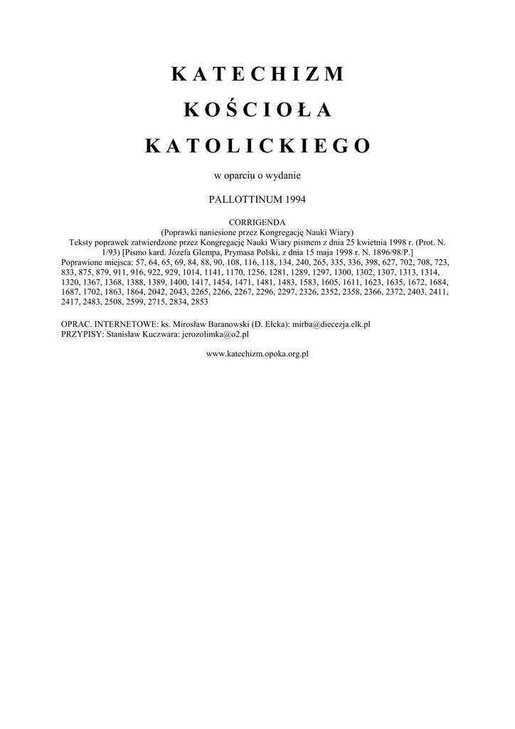 KATECHIZM KOŚCIOŁA KATOLICKIEGO w oparciu o wydanie PALLOTTINUM 1994 CORRIGENDA (Poprawki naniesione przez Kongregację Nauki Wiary) Teksty poprawek zatwierdzone przez Kongregację Nauki Wiary pismem z dnia 25 kwietnia 1998 r. (Prot. N. 1/93) [Pismo kard. Józefa Glempa, Prymasa Polski, z dnia 15 maja 1998 r. N. 1896/98/P.] Poprawione miejsca: 57, 64, 65, 69, 84, 88, 90, 108, 116, 118, 134, 240, 265, 335, 336, 398, 627, 702, 708, 723, 833, 875, 879, 911, 916, 922, 929, 1014, 1141, 1170, 1256, 1281, 1289, 1297, 1300, 1302, 1307, 1313, 1314, 1320, 1367, 1368, 1388, 1389, 1400, 1417, 1454, 1471, 1481, 1483, 1583, 1605, 1611, 1623, 1635, 1672, 1684, 1687, 1702, 1863, 1864, 2042, 2043, 2265, 2266, 2267, 2296, 2297, 2326, 2352, 2358, 2366, 2372, 2403, 2411, 2417, 2483, 2508, 2599, 2715, 2834, 2853 OPRAC. INTERNETOWE: ks. Mirosław Baranowski (D. Ełcka): [email protected] PRZYPISY: Stanisław Kuczwara: [email protected] www.katechizm.opoka.org.pl SPIS TREŚCI Konstytucja Apostolska "Fidei depositum" Wstęp (1-25) Część pierwsza (26-1065) WYZNANIE WIARY Dział pierwszy: "WIERZĘ" - "WIERZYMY" (26-184) Wprowadzenie (26) Rozdział pierwszy: CZŁOWIEK JEST "OTWARTY" NA BOGA (27-49) Rozdział drugi: BÓG WYCHODZI NAPRZECIW CZŁOWIEKOWI (50-141) Rozdział trzeci: CZŁOWIEK ODPOWIADA BOGU (142-184) Dział drugi: WYZNANIE WIARY CHRZEŚCIJAŃSKIEJ (185-1065) Symbole wiary (185 -197) Rozdział pierwszy: WIERZĘ W BOGA OJCA (198-421) Rozdział drugi: WIERZĘ W JEZUSA CHRYSTUSA, SYNA BOśEGO JEDNORODZONEGO (422-682) Rozdział trzeci: WIERZĘ W DUCHA ŚWIĘTEGO (683-1065) Część druga (1066-1690) CELEBRACJA MISTERIUM CHRZEŚCIJAŃSKIEGO Dlaczego liturgia? - Co znaczy pojęcie "liturgia"? - Liturgia jako źródło śycia - Modlitwa i liturgia - Katecheza i liturgia (1066-1075) Dział pierwszy: EKONOMIA SAKRAMENTALNA (1076-1209) Wprowadzenie (1076) Rozdział pierwszy: MISTERIUM PASCHALNE W CZASIE KOŚCIOŁA (1077-1134) Rozdział drugi: CELEBRACJA SAKRAMENTALNA MISTERIUM PASCHALNEGO (1135-1209) Dział drugi: SIEDEM SAKRAMENTÓW KOŚCIOŁA (1210-1690) Wprowadzenie (1210-1211) Rozdział pierwszy: SAKRAMENTY WTAJEMNICZENIA CHRZEŚCIJAŃSKIEGO (1212-1419) Rozdział drugi: SAKRAMENTY UZDROWIENIA (1420-1532) Rozdział trzeci: SAKRAMENTY W SŁUśBIE KOMUNII (1533-1666) Rozdział czwarty: INNE CELEBRACJE LITURGICZNE (1667-1690) Część trzecia (1691-2557) śYCIE W CHRYSTUSIE Wprowadzenie (1691-1698) Dział pierwszy: POWOŁANIE CZŁOWIEKA: śYCIE W DUCHU ŚWIĘTYM (1699-2051) Wprowadzenie (1699) Rozdział pierwszy: GODNOŚĆ OSOBY LUDZKIEJ (1700-1876) Rozdział drugi: WSPÓLNOTA LUDZKA (1877-1948) Rozdział trzeci: ZBAWIENIE BOśE: PRAWO I ŁASKA (1949-2051) Dział drugi: DZIESIĘĆ PRZYKAZAŃ (2052-2557) Wprowadzenie (2052-2082) Rozdział pierwszy: "BĘDZIESZ MIŁOWAŁ PANA BOGA SWEGO CAŁYM SWOIM SERCEM, CAŁĄ SWOJĄ DUSZĄ I CAŁYM SWOIM UMYSŁEM" (2083-2195) Rozdział drugi: "BĘDZIESZ MIŁOWAŁ SWEGO BLIŹNIEGO JAK SIEBIE SAMEGO" (2196-2557) Część czwarta (2558-2865) MODLITWA CHRZEŚCIJAŃSKA Dział pierwszy: MODLITWA W śYCIU CHRZEŚCIJAŃSKIM (2558-2758) Wprowadzenie (2558) Czym jest modlitwa? (2559-2565) Rozdział pierwszy: OBJAWIENIE MODLITWY. POWSZECHNE POWOŁANIE DO MODLITWY (25662649) Rozdział drugi: TRADYCJA MODLITWY (2650-2696) Rozdział trzeci: śYCIE MODLITWY (2697-2758) Dział drugi: MODLITWA PAŃSKA "OJCZE NASZ" (2759-2865) Konstytucja Apostolska FIDEI DEPOSITUM mocą której publikuje się KATECHIZM KOŚCIOŁA KATOLICKIEGO opracowany po Soborze Powszechnym Watykańskim II JAN PAWEŁ II BISKUP SŁUGA SŁUG BOśYCH NA WIECZNĄ RZECZY PAMIĄTKĘ Do Czcigodnych Braci Kardynałów, Patriarchów, Arcybiskupów, Biskupów, Kapłanów, Diakonów i wszystkich członków Ludu BoŜego Pan zlecił swemu Kościołowi zadanie strzeŜenia depozytu wiary, którą wypełnia on w kaŜdej epoce. Intencją i celem Soboru Powszechnego Watykańskiego II, uroczyście otwartego trzydzieści lat temu przez mego czcigodnej pamięci poprzednika, PapieŜa Jana XXIII, było ukazanie w pełnym świetle apostolskiej i pasterskiej misji Kościoła, tak, aby blask prawdy ewangelicznej skłonił wszystkich ludzi do poszukiwania i przyjęcia miłości Chrystusa, która przewyŜsza wszelką wiedzę (por. Ef 3, 19). Głównym zadaniem, jakie PapieŜ Jan XXIII powierzył sesjom soborowym, było lepsze ujęcie i przedstawienie cennego depozytu nauki chrześcijańskiej, by stała się ona bardziej przystępna dla wierzących w Chrystusa i dla wszystkich ludzi dobrej woli. Dlatego Sobór nie miał więc potępiać błędów epoki, ale w sposób jasny ukazać moc i piękno nauki wiary. "Dzięki światłu tego Soboru - mówił PapieŜ - Kościół... jak ufamy, pomnoŜy swoje duchowe bogactwo i czerpiąc z niego nową energię, będzie mógł śmiało patrzeć w przyszłość. Musimy dziś poświęcić się ochoczo i bez lęku tak bardzo potrzebnemu w naszych czasach dziełu, idąc drogą, którą Kościół przemierza prawie od dwudziestu stuleci"1. Dzięki BoŜej pomocy owocem czteroletnich obrad Ojców Soborowych stał się bogaty zbiór wypowiedzi doktrynalnych i zaleceń duszpasterskich, które ofiarowali oni całemu Kościołowi. Pasterze i wierni znajdują w nich wskazania dla owej "odnowy myślenia, działania, obyczajów i siły moralnej, radości i nadziei, która była celem samego Soboru"2. TakŜe po zakończeniu obrad Sobór pozostał źródłem inspiracji dla Ŝycia kościelnego. W 1985 r. mogłem stwierdzić, Ŝe "dla mnie, który doznałem owej niezwykłej łaski uczestniczenia w Soborze i czynnego zaangaŜowania w jego przebiegu, Vaticanum II zawsze, a w sposób szczególny w latach pontyfikatu, stanowi stały punkt odniesienia dla wszystkich moich poczynań duszpasterskich, w świadomym wysiłku przekładania jego wskazań na język konkretnych i wiernych zastosowań na terenie kaŜdego Kościoła lokalnego i całego Kościoła katolickiego. WciąŜ naleŜy do tego źródła powracać"3. W tym duchu 25 stycznia