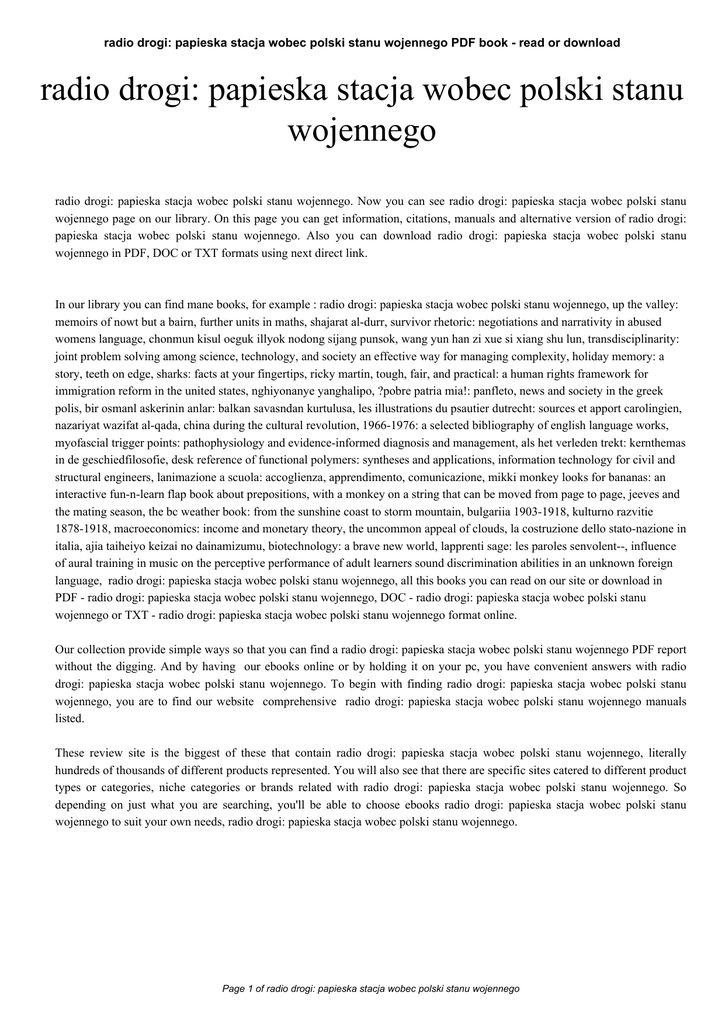 radio drogi: papieska stacja wobec polski stanu wojennego PDF book - read or download radio drogi: papieska stacja wobec polski stanu wojennego radio drogi: papieska stacja wobec polski stanu wojennego. Now you can see radio drogi: papieska stacja wobec polski stanu wojennego page on our library. On this page you can get information, citations, manuals and alternative version of radio drogi: papieska stacja wobec polski stanu wojennego. Also you can download radio drogi: papieska stacja wobec polski stanu wojennego in PDF, DOC or TXT formats using next direct link. In our library you can find mane books, for example : radio drogi: papieska stacja wobec polski stanu wojennego, up the valley: memoirs of nowt but a bairn, further units in maths, shajarat al-durr, survivor rhetoric: negotiations and narrativity in abused womens language, chonmun kisul oeguk illyok nodong sijang punsok, wang yun han zi xue si xiang shu lun, transdisciplinarity: joint problem solving among science, technology, and society an effective way for managing complexity, holiday memory: a story, teeth on edge, sharks: facts at your fingertips, ricky martin, tough, fair, and practical: a human rights framework for immigration reform in the united states, nghiyonanye yanghalipo, ?pobre patria mia!: panfleto, news and society in the greek polis, bir osmanl askerinin anlar: balkan savasndan kurtulusa, les illustrations du psautier dutrecht: sources et apport carolingien, nazariyat wazifat al-qada, china during the cultural revolution, 1966-1976: a selected bibliography of english language works, myofascial trigger points: pathophysiology and evidence-informed diagnosis and management, als het verleden trekt: kernthemas in de geschiedfilosofie, desk reference of functional polymers: syntheses and applications, information technology for civil and structural engineers, lanimazione a scuola: accoglienza, apprendimento, comunicazione, mikki monkey looks for bananas: an interactive fun-n-learn flap book about prepositions, with a monkey on a string that can be moved from page to page, jeeves and the mating season, the bc weather book: from the sunshine coast to storm mountain, bulgariia 1903-1918, kulturno razvitie 1878-1918, macroeconomics: income and monetary theory, the uncommon appeal of clouds, la costruzione dello stato-nazione in italia, ajia taiheiyo keizai no dainamizumu, biotechnology: a brave new world, lapprenti sage: les paroles senvolent--, influence of aural training in music on the perceptive performance of adult learners sound discrimination abilities in an unknown foreign language, radio drogi: papieska stacja wobec polski stanu wojennego, all this books you can read on our site or download in PDF - radio drogi: papieska stacja wobec polski stanu wojennego, DOC - radio drogi: papieska stacja wobec polski stanu wojennego or TXT - radio drogi: papieska stacja wobec polski stanu wojennego format online. Our collection provide simple ways so that you can find a radio drogi: papieska stacja wobec polski stanu wojennego PDF report without the digging. And by having our ebooks online or by holding it on your pc, you have convenient answers with radio drogi: papieska stacja wobec polski stanu wojennego. To begin with finding radio drogi: papieska stacja wobec polski stanu wojennego, you are to find our website comprehensive radio drogi: papieska stacja wobec polski stanu wojennego manuals listed. These review site is the biggest of these that contain radio drogi: papieska stacja wobec polski stanu wojennego, literally hundreds of thousands of different products represented. You will also see that there are specific sites catered to different product types or categories, niche categories or brands related with radio drogi: papieska stacja wobec polski stanu wojennego. So depending on just what you are searching, you'll be able to choose ebooks radio drogi: papieska stacja wobec polski stanu wojennego to suit your own needs, radio drogi: papieska stacja wobec polski stanu wojennego. Page 1 of radio drogi: papieska stacja wobec polski stanu wojennego