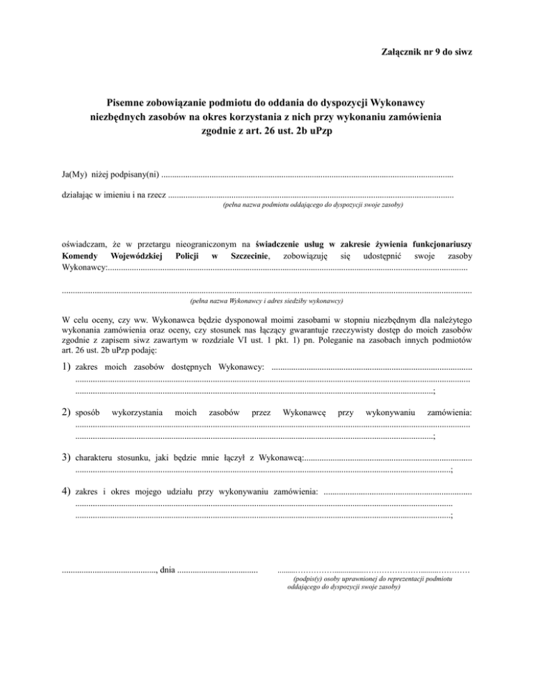 Załącznik nr 9 do siwz Pisemne zobowiązanie podmiotu do oddania do dyspozycji Wykonawcy niezbędnych zasobów na okres korzystania z nich przy wykonaniu zamówienia zgodnie z art. 26 ust. 2b uPzp Ja(My) niżej podpisany(ni) ...................................................................................................................................... działając w imieniu i na rzecz ................................................................................................................................... (pełna nazwa podmiotu oddającego do dyspozycji swoje zasoby) oświadczam, że w przetargu nieograniczonym na świadczenie usług w zakresie żywienia funkcjonariuszy Komendy Wojewódzkiej Policji w Szczecinie, zobowiązuję się udostępnić swoje zasoby Wykonawcy:..................................................................................................................................................................... ............................................................................................................................................................................................ (pełna nazwa Wykonawcy i adres siedziby wykonawcy) W celu oceny, czy ww. Wykonawca będzie dysponował moimi zasobami w stopniu niezbędnym dla należytego wykonania zamówienia oraz oceny, czy stosunek nas łączący gwarantuje rzeczywisty dostęp do moich zasobów zgodnie z zapisem siwz zawartym w rozdziale VI ust. 1 pkt. 1) pn. Poleganie na zasobach innych podmiotów art. 26 ust. 2b uPzp podaję: 1) zakres moich zasobów dostępnych Wykonawcy: ............................................................................................ ..................................................................................................................................................................................... ....................................................................................................................................................................; 2) sposób wykorzystania moich zasobów przez Wykonawcę przy wykonywaniu zamówienia: ..................................................................................................................................................................................... ....................................................................................................................................................................; 3) charakteru stosunku, jaki będzie mnie łączył z Wykonawcą:............................................................................. ............................................................................................................................................................................; 4) zakres i okres mojego udziału przy wykonywaniu zamówienia: .................................................................... ............................................................................................................................................................................. ............................................................................................................................................................................; ..........................................., dnia ..................................... .........……………................………………….........………… (podpis(y) osoby uprawnionej do reprezentacji podmiotu oddającego do dyspozycji swoje zasoby)