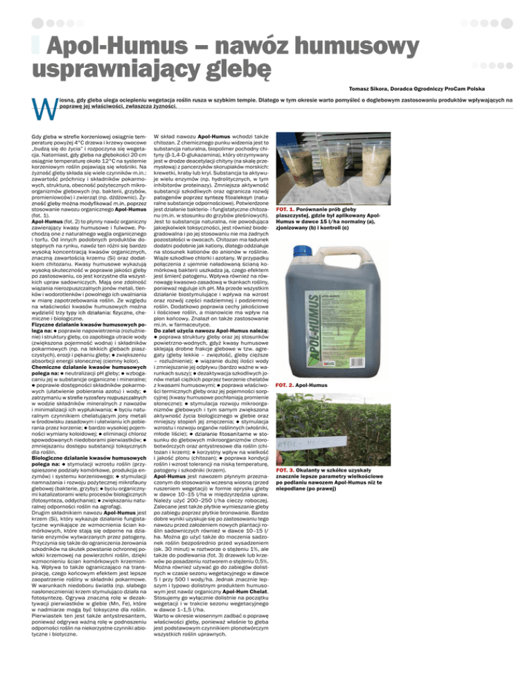 Apol-Humus – nawóz humusowy usprawniający glebę W Tomasz Sikora, Doradca Ogrodniczy ProCam Polska iosną, gdy gleba ulega ociepleniu wegetacja roślin rusza w szybkim tempie. Dlatego w tym okresie warto pomyśleć o doglebowym zastosowaniu produktów wpływających na poprawę jej właściwości, zwłaszcza żyzności. peraturę powyżej 4°C drzewa i krzewy owocowe „budzą się do życia” i rozpoczyna się wegetacja. Natomiast, gdy gleba na głębokości 20 cm osiągnie temperaturę około 12°C na systemie korzeniowym roślin pojawiają się włośniki. Na żyzność gleby składa się wiele czynników m.in.: zawartość próchnicy i składników pokarmowych, struktura, obecność pożytecznych mikroorganizmów glebowych (np. bakterii, grzybów, promieniowców) i zwierząt (np. dżdżownic). Żystosowanie nawozu organicznego Apol-Humus (fot. 1). Apol-Humus (fot. 2) to płynny nawóz organiczny zawierający kwasy humusowe i fulwowe. Pochodzą one z naturalnego węgla organicznego i torfu. Od innych podobnych produktów dostępnych na rynku, nawóz ten różni się bardzo wysoką koncentracją kwasów organicznych, znaczną zawartością krzemu (Si) oraz dodatkiem chitozanu. Kwasy humusowe wykazują wysoką skuteczność w poprawie jakości gleby po zastosowaniu, co jest korzystne dla wszystkich upraw sadowniczych. Mają one zdolność wiązania nierozpuszczalnych jonów metali, tlenków i wodorotlenków i powolnego ich uwalniania w miarę zapotrzebowania roślin. Ze względu na właściwości kwasów humusowych można miczne i biologiczne. Fizyczne działanie kwasów humusowych polega na: poprawie napowietrzenia (rozluźnienie) i struktury gleby, co zapobiega utracie wody (zwiększona pojemność wodna) i składników pokarmowych (np. na lekkich glebach piaszczystych), erozji i pękaniu gleby; zwiększeniu absorbcji energii słonecznej (ciemny kolor). Chemiczne działanie kwasów humusowych polega na: neutralizacji pH gleby; wzbogacaniu jej w substancje organiczne i mineralne; poprawie dostępności składników pokarmowych (ułatwienie pobierania azotu) i wody; w wodzie składników mineralnych z nawozów i minimalizacji ich wypłukiwania; byciu naturalnym czynnikiem chelatującym jony metali w środowisku zasadowym i ułatwianiu ich pobierania przez korzenie; bardzo wysokiej pojemności wymiany koloidowej; eliminacji chloroz spowodowanych niedoborami pierwiastków; zmniejszaniu dostępu substancji toksycznych dla roślin. Biologiczne działanie kwasów humusowych polega na: stymulacji wzrostu roślin (przyspieszone podziały komórkowe, produkcja enzymów) i systemu korzeniowego; stymulacji namnażania i rozwoju pożytecznej mikrofauny glebowej (bakterie, grzyby); byciu organicznymi katalizatorami wielu procesów biologicznych (fotosynteza, oddychanie); zwiększaniu naturalnej odporności roślin na agrofagi. Drugim składnikiem nawozu Apol-Humus jest krzem (Si), który wykazuje działanie fungistatyczne wynikające ze wzmocnienia ścian komórkowych, które stają się odporne na działanie enzymów wytwarzanych przez patogeny. Przyczynia się także do ograniczenia żerowania szkodników na skutek powstanie ochronnej powłoki krzemowej na powierzchni roślin, dzięki wzmocnieniu ścian komórkowych krzemionką. Wpływa to także ograniczająco na transpirację, czego końcowym efektem jest lepsze zaopatrzenie rośliny w składniki pokarmowe. W warunkach niedoboru światła (np. słabego nasłonecznienia) krzem stymulująco działa na fotosyntezę. Ogrywa znaczną rolę w dezaktywacji pierwiastków w glebie (Mn, Fe), które w nadmiarze mogą być toksyczne dla roślin. Pierwiastek ten jest także antystresantem, ponieważ odgrywa ważną rolę w podnoszeniu odporności roślin na niekorzystne czynniki abiotyczne i biotyczne. W skład nawozu Apol-Humus wchodzi także chitozan. Z chemicznego punku widzenia jest to substancja naturalna, biopolimer pochodny chityny (β-1,4-D-glukazamina), który otrzymywany jest w drodze deacetylacji chityny (na skalę przemysłową) z pancerzyków skorupiaków morskich: krewetki, kraby lub kryl. Substancja ta aktywuje wielu enzymów (np. hydrolitycznych, w tym inhibitorów proteinazy). Zmniejsza aktywność substancji szkodliwych oraz ogranicza rozwój ralne substancje odpornościowe). Potwierdzone jest działanie bakterio- i fungistatyczne chitozanu (m.in. w stosunku do grzybów pleśniowych). Jest to substancja naturalna, nie powodująca jakiejkolwiek toksyczności, jest również biodegradowalna i po jej stosowaniu nie ma żadnych pozostałości w owocach. Chitozan ma ładunek dodatni podobnie jak kationy, dlatego oddziałuje na stosunek kationów do anionów w roślinie. Wiąże szkodliwe chlorki i azotany. W przypadku połączenia z ujemnie naładowaną ścianą komórkową bakterii uszkadza ją, czego efektem jest śmierć patogenu. Wpływa również na równowagę kwasowo-zasadową w tkankach rośliny, ponieważ reguluje ich pH. Ma przede wszystkim działanie biostymulujące i wpływa na wzrost oraz rozwój części nadziemnej i podziemnej roślin. Dodatkowo poprawia cechy jakościowe i ilościowe roślin, a mianowicie ma wpływ na plon końcowy. Znalazł on także zastosowanie mi.in. w farmaceutyce. Do zalet użycia nawozu Apol-Humus należą: poprawa struktury gleby oraz jej stosunków powietrzno-wodnych, gdyż kwasy humusowe sklejają drobne frakcje glebowe w tzw. agregaty (gleby lekkie – zwięzłość, gleby cięższe – rozluźnienie); wiązanie dużej ilości wody i zmniejszanie jej odpływu (bardzo ważne w warunkach suszy); dezaktywacja szkodliwych jonów metali ciężkich poprzez tworzenie chelatów z kwasami humusowymi; poprawa właściwości termicznych gleby oraz jej pojemności sorpcyjnej (kwasy humusowe pochłaniają promienie słoneczne); stymulacja rozwoju mikroorganizmów glebowych i tym samym zwiększona aktywność życia biologicznego w glebie oraz mniejszy stopień jej zmęczenia; stymulacja wzrostu i rozwoju orga