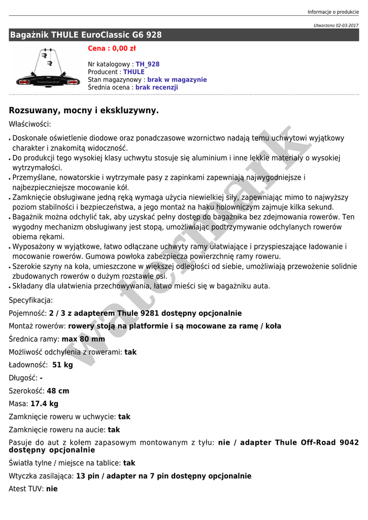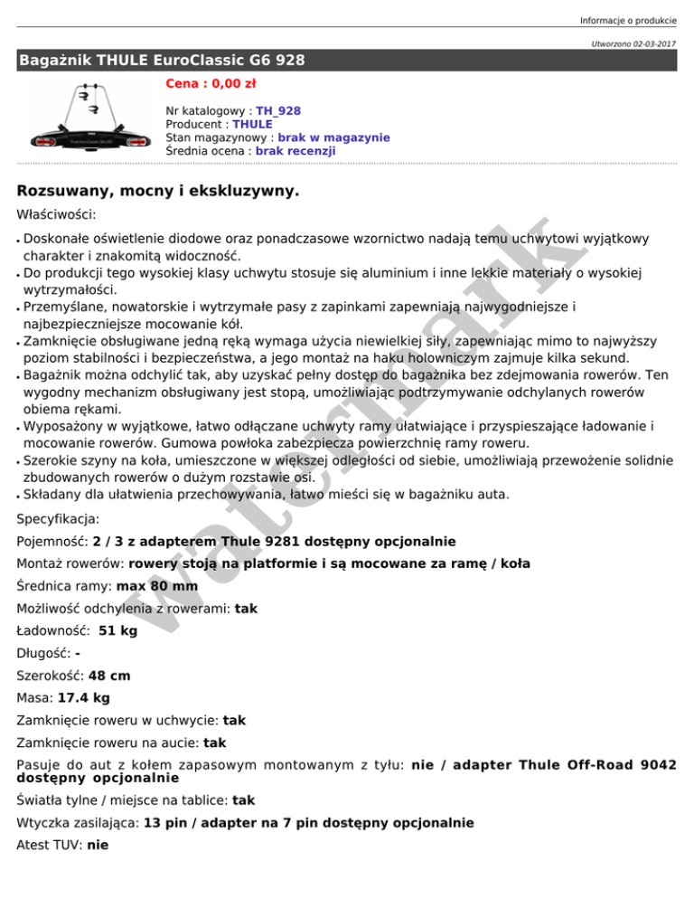 Informacje o produkcie Utworzono 02-03-2017 Bagażnik THULE EuroClassic G6 928 Cena : 0,00 zł Nr katalogowy : TH_928 Producent : THULE Stan magazynowy : brak w magazynie Średnia ocena : brak recenzji Rozsuwany, mocny i ekskluzywny. Właściwości: ● ● ● ● ● ● Specyfikacja: er m ar k ● Doskonałe oświetlenie diodowe oraz ponadczasowe wzornictwo nadają temu uchwytowi wyjątkowy charakter i znakomitą widoczność. Do produkcji tego wysokiej klasy uchwytu stosuje się aluminium i inne lekkie materiały o wysokiej wytrzymałości. Przemyślane, nowatorskie i wytrzymałe pasy z zapinkami zapewniają najwygodniejsze i najbezpieczniejsze mocowanie kół. Zamknięcie obsługiwane jedną ręką wymaga użycia niewielkiej siły, zapewniając mimo to najwyższy poziom stabilności i bezpieczeństwa, a jego montaż na haku holowniczym zajmuje kilka sekund. Bagażnik można odchylić tak, aby uzyskać pełny dostęp do bagażnika bez zdejmowania rowerów. Ten wygodny mechanizm obsługiwany jest stopą, umożliwiając podtrzymywanie odchylanych rowerów obiema rękami. Wyposażony w wyjątkowe, łatwo odłączane uchwyty ramy ułatwiające i przyspieszające ładowanie i mocowanie rowerów. Gumowa powłoka zabezpiecza powierzchnię ramy roweru. Szerokie szyny na koła, umieszczone w większej odległości od siebie, umożliwiają przewożenie solidnie zbudowanych rowerów o dużym rozstawie osi. Składany dla ułatwienia przechowywania, łatwo mieści się w bagażniku auta. at ● Pojemność: 2 / 3 z adapterem Thule 9281 dostępny opcjonalnie Montaż rowerów: rowery stoją na platformie i są mocowane za ramę / koła w Średnica ramy: max 80 mm Możliwość odchylenia z rowerami: tak Ładowność: 51 kg Długość: - Szerokość: 48 cm Masa: 17.4 kg Zamknięcie roweru w uchwycie: tak Zamknięcie roweru na aucie: tak Pasuje do aut z kołem zapasowym montowanym z tyłu: nie / adapter Thule Off-Road 9042 dostępny opcjonalnie Światła tylne / miejsce na tablice: tak Wtyczka zasilająca: 13 pin / adapter na 7 pin dostępny opcjonalnie Atest TUV: nie w at er m ar k City Crash: tak