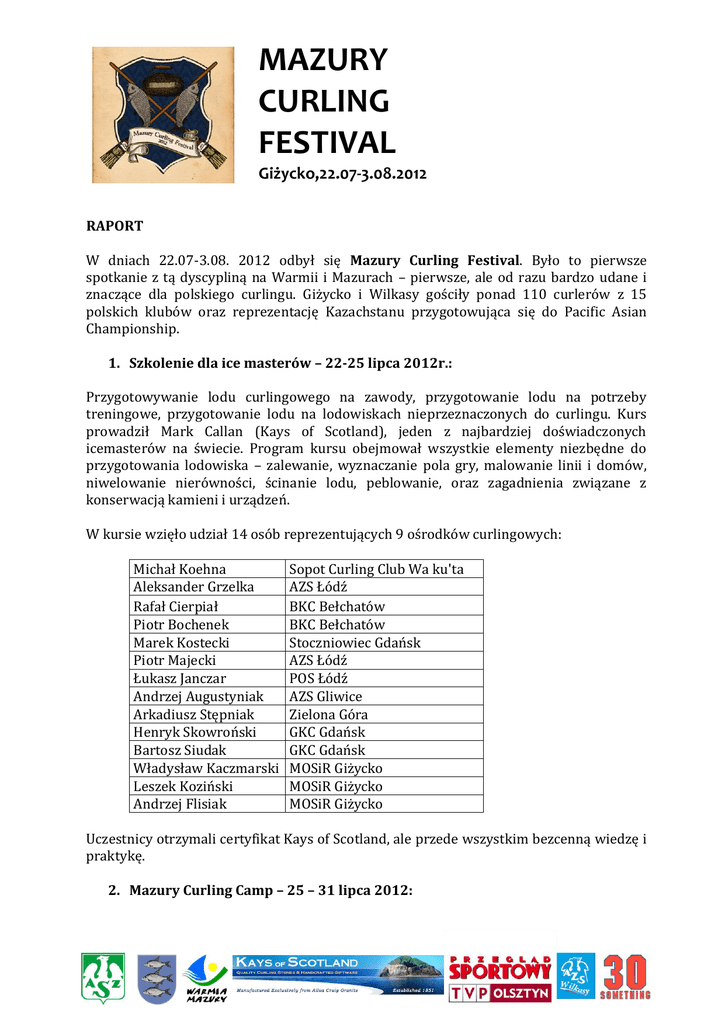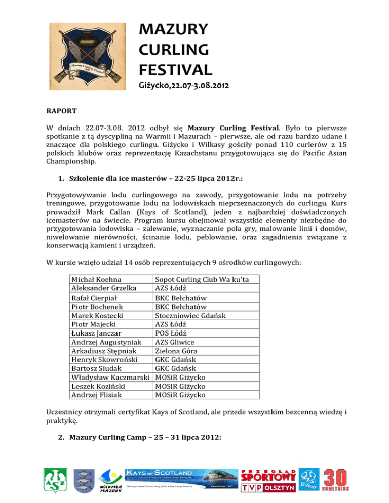 MAZURY CURLING FESTIVAL Giżycko,22.07-3.08.2012 RAPORT W dniach 22.07-3.08. 2012 odbył się Mazury Curling Festival. Było to pierwsze spotkanie z tą dyscypliną na Warmii i Mazurach – pierwsze, ale od razu bardzo udane i znaczące dla polskiego curlingu. Giżycko i Wilkasy gościły ponad 110 curlerów z 15 polskich klubów oraz reprezentację Kazachstanu przygotowująca się do Pacific Asian Championship. 1. Szkolenie dla ice masterów – 22-25 lipca 2012r.: Przygotowywanie lodu curlingowego na zawody, przygotowanie lodu na potrzeby treningowe, przygotowanie lodu na lodowiskach nieprzeznaczonych do curlingu. Kurs prowadził Mark Callan (Kays of Scotland), jeden z najbardziej doświadczonych icemasterów na świecie. Program kursu obejmował wszystkie elementy niezbędne do przygotowania lodowiska – zalewanie, wyznaczanie pola gry, malowanie linii i domów, niwelowanie nierówności, ścinanie lodu, peblowanie, oraz zagadnienia związane z konserwacją kamieni i urządzeń. W kursie wzięło udział 14 osób reprezentujących 9 ośrodków curlingowych: Michał Koehna Aleksander Grzelka Rafał Cierpiał Piotr Bochenek Marek Kostecki Piotr Majecki Łukasz Janczar Andrzej Augustyniak Arkadiusz Stępniak Henryk Skowroński Bartosz Siudak Władysław Kaczmarski Leszek Koziński Andrzej Flisiak Sopot Curling Club Wa ku'ta AZS Łódź BKC Bełchatów BKC Bełchatów Stoczniowiec Gdańsk AZS Łódź POS Łódź AZS Gliwice Zielona Góra GKC Gdańsk GKC Gdańsk MOSiR Giżycko MOSiR Giżycko MOSiR Giżycko Uczestnicy otrzymali certyfikat Kays of Scotland, ale przede wszystkim bezcenną wiedzę i praktykę. 2. Mazury Curling Camp – 25 – 31 lipca 2012: 1 MAZURY CURLING FESTIVAL Giżycko,22.07-3.08.2012 Camp obejmował 6 dni zajęć z minimum 4h zajęć na lodzie i 2h zajęć poza lodowiskiem każdego dnia (z wykorzystaniem obiektów Centralnego Ośrodka Sportu Akademickiego w Wilkasach). Uczestnicy po pierwszym dniu zostali podzieleni na cztery grupy z zależności od stopnia zaawansowania. Dodatkowo odbywały się konsultacje indywidualne i drużynowe. Zajęcia poprowadzili: Stewart Sturrock (Inverness) Gordon MacIntyre (Greenacres) Mark Callan (Szkocja) Andrzej Augustyniak (Gliwice) Damian Herman (Warszowice) polscy trenerzy klubowi Każdego dnia odbywały się 4 sesje obowiązkowe (1.45h) i jedna sesja popołudniowa poświęcona na zajęcia klubowe i sparingi. Godziny wieczorne zostały poświęcone na analizy materiału video i zajęcia teoretyczne (2 dni), zajęcia sportowe – siatkówka plażowa i piłka nożna (2 dni), spotkanie koleżeńskie (1 dzień) i odnowa biologiczna (1 dzień). W czasie wolnym uczestnicy mieli możliwość skorzystania z bazy sportowej ośrodka w Wilkasach (korty tenisowe, boiska i hala sportowa, żaglówki i windsurfing, kajaki i rowery) a także z zabiegów rehabilitacyjnych i kriokomory. Szczegółowy program campu znajduje się w załączniku. W trakcie campu dr D. Herman przeprowadzał testy z zakresu równowagi statycznej i dynamicznej – ich wyniki zostaną przedstawione w większym opracowaniu. Podczas festiwalu odbyły się także trzy oficjalne otwarte treningi dla mieszkańców Giżycka i okolic oraz turystów, w których wzięło udział ponad 100 osób. W campie wzięło udział 95 osób z 14 polskich klubów oraz reprezentacja Kazachstanu: lp. 1 2 3 4 5 6 7 8 9 10 Imię i nazwisko Magda Strączek Ela Ran Anna Fijałkowska Adam Rosa Agnieszka Handzlik Agata Musik Magdalena Muskus Magdalena Dumanowska Agnieszka Dudek Katarzyna Kowalska Klub ŚKC Katowice AZS Gliwice MKS Axel Toruń Media CC Plan B ŚKC Katowice ŚKC Katowice Rudzki Klub Curlingowy AZS Gliwice AZS Łódź AZS Łódź 2 MAZURY CURLING FESTIVAL Giżycko,22.07-3.08.2012 11 12 13 14 15 16 17 18 19 20 21 22 23 24 25 26 27 28 29 30 31 32 33 34 35 36 37 38 39 40 41 42 43 44 45 46 47 48 49 50 Bartosz Łobaza Kamil Suchożebski Patrycja Fastyn Dariusz Bendowski Michał Koehna Dorota Sokołowska Mirosław Cholewa Zuzanna Rybicka Zuzanna Śliwińska Katarzyna Wójcik Marta Walczak Aleksander Grzelka Mateusz Kulik Bartosz Dzikowski Maciej Turek Damian Cebula Krzysztof Bąk Mateusz Marcinkowski Jeremi Telak Marcin Łopatka Michał Ostrowski Justyna Wojtas Krzysztof Mańkowski Tomasz Dyderski Krystian Pokusiński Jakub Głowania Tomasz Zioło Michał Kozioł Marta Pluta Adam Pauszek Radosław Pisarek Krzysztof Świątek Tomasz Pluta Tomasz Bosek Krzysztof Niewiński Joanna Benet Konrad Stych Julia Malinowska Martyna Wilczak Ewa Stych Brak Media CC Plan B Media CC Plan B Media CC Plan B Sopot Curling Club Wa ku'ta AZS Łódź AZS Gliwice AZS Łódź AZS Łódź AZS Łódź AZS Łódź AZS Łódź MKS Axel Toruń MKS Axel Toruń MKS Axel Toruń MKS Axel Toruń ŚKC Katowice AZS Łódź MKS Axel Toruń AZS Łódź AZS Łódź AZS Gliwice ŚKC Katowice BKC Bełchatów BKC Bełchatów ŚKC Katowice ŚKC Katowice ŚKC Katowice AZS KŚ PŚ Gliwice KS Warszowice KS Warszowice KS Warszowice AZS KŚ PŚ Gliwice AZS KŚ PŚ Gliwice AZS KŚ PŚ Gliwice AZS KŚ PŚ Gliwice AZS KŚ PŚ Gliwice AZS KŚ PŚ Gliwice AZS KŚ PŚ Gliwice AZS KŚ PŚ Gliwice 3 MAZURY CURLING FESTIVAL Giżycko,22.07-3.08.2012 51 52 53 54 55 56 57 58 59 60 61 62 63 64 65 66 67 68 69 70 71 72 73 74 75 76 77 78 79 80 81 82 83 84 85 86 87 88 89 90 Aleksander Kolano Agnieszka Marzęcka Magda Kołodziej Agnieszka Hamera Aleksandra Serba Daria Wyrzykowska Joanna Bruzda Wojciech Gubański Kamil Bułakowski Marcin Loryński Krzysztof Moczyński Sylwia Nowak Eugeniusz Błaszczak Jarosław Gosz Maciej Karaś Krystyna Beniger Tomasz Majorek Aleksandra Bigosińska Karolina Startek Łukasz Pryczkat Marcin Klos Piotr Majecki Ola Majecka Paweł Włodarczyk Grzegorz Labecki Andrzej Augustyniak Artur Niewola Kacper Jędrzejczak Mariusz Jędrzejczak Aleksandra Przybyt Borys Jasiecki Maria Stefańska Magdalena Dobiszewska Justyna Matusiak Mateusz Jadczyk Kim Viktor Kazimirchik Roman Smailov Marat Kim Daniel Kudaibergenov Muzdybay KS Warszowice MK