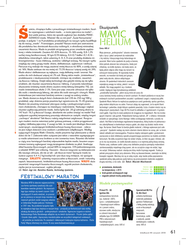 Ś wieża, chrupiąca bułka z prawdziwym śmietankowym masłem, fasolka szparagowa z wiórkami masła… a może jajecznica na maśle?… Jest wiele potraw, które nie sposób wykonać bez dodatku PRAWDZIWEGO masła. Właśnie! Ale co nim jest? „Świat Konsumenta” podaje, iż jedynie 1 na 9 produktów przebadanych na naszym rynku kwalifikuje się do nazwy „masło”. Przerażające, prawda? Nazwa masło jest zastrzeżona dla produktów bez domieszek tłuszczów roślinnych, o określonej minimalnej zawartości tłuszczu. Masło to produkt otrzymywany przez zmaślenie wydzielonej z mleka śmietanki. Zawiera 82-83% tłuszczu, 15-16% wody, 0,8-1,3% suchej masy beztłuszczowej. W tym 0,5% laktozy, 0,4-0,7 białka i 0,1-0,16 składników mineralnych, także witaminy A, D, E, K oraz produkty działania mikroorganizmów - kwas mlekowy, acetoina i aldehyd octowy. Na naszym rynku znajdują się cztery grupy masła: ekstra, delikatesowe, wyborowe i stołowe. Pierwsze trzy rodzaje nie mogą zawierać mniej tłuszczu niż 80%, a wody więcej niż 16%. Masło stołowe nie ma mniej niż 73,5% tłuszczu i więcej wody niż 24%. Masło ekstra i delikatesowe są najlepsze, mają delikatny smak i aromat. Nie wolno do nich dodawać więcej niż 2% soli. Mamy także masło „śmietankowe”, produkowane z nieukwaszonej śmietanki, różniące się smakiem, zawartością tłuszczu i laktozy. Dzięki takiej technologii oba gatunki różnią się nie tylko smakiem, ale również zawartością tłuszczu i laktozy. Z powodu naturalnego ukwaszenia śmietany masło ekstra zawiera mniej laktozy (niespełna 1%), zaś masło śmietankowe około 2-3%. Extra jest więc znacznie zdrowsze nie tylko dla osób z nietolerancją laktozy, ale także dla osób starszych i chorych. Masło śmietankowe jest natomiast bardziej cenione z uwagi na walory smakowe. Masło dostarcza dużych ilości cholesterolu (od 220 do 250 mg/100 g produktu), więc dzienna porcja powinna być ograniczona do 15-20 gramów. Masłem nie powinny smarować pieczywa osoby z podwyższonym poziomem cholesterolu, chorujące na miażdżycę i nadciśnienie. Nadwaga i otyłość również wykluczają jedzenie masła. Jedna łyżka (ok. 20 g) odmiany ekstra to 147 kcal i 16,5 g tłuszczu! Uwaga, absolutnie nie wolno smażyć na maśle! Pod wpływem wysokiej temperatury powstają rakotwórcze związki, między innymi „cuchnąca” akroleina! Taki tłuszcz należy natychmiast zutylizować. Rozgrzanym masłem można natomiast polać gotową potrawę, a także przygotować szybką i delikatną jajecznicę. Z uwagi na fakt, że masło jest idealnym tłuszczem zwierzęcym, zawierającym krótkołańcuchowe kwasy tłuszczowe - zalecane jest małym dzieciom oraz osobom z problemami żołądkowymi. Według wytycznych Instytutu Matki i Dziecka, masło powinno być planowane w diecie dzieci do lat 7. Zalecenie takie związane jest także z naturalnie występującymi w maśle witaminami oraz brakiem w nim izomerów trans. Również dla kobiet w ciąży oraz karmiących bardziej odpowiednie będzie masło, bowiem wspomniane izomery wykazywać mogą teratogenne działanie na płód. Analizując skład kwasów tłuszczowych, ponad 60% to nasycone, 33% jednonienasycone, a odsetek WNKT jest znikomy. Owszem - tłuszcze nasycone są niebezpieczne dla naszego zdrowia, ale nie aż tak - jak tłuszcze trans! Spożycie masła na świece wynosi 4,4-4,2 kg/osobę/rok i jest dwa razy mniejsze, niż spożycie margaryn. ZALETY: witaminy rozpuszczalne w tłuszczach, smak i naturalny zapach, łatwostrawność, krótkołańcuchowe kwasy tłuszczowe. WADY: duża zawartość nasyconych kwasów tłuszczowych, wysoki poziom cholesterolu, ciężko jest je rozsmarować, szybko jełczeje. Tekst: mgr inż. Karolina Kozela, technolog żywienia. fot. Jacek Niemiec Maratony MTB to obecnie najpowszechniejsza forma sportowej rywalizacji dla użytkowników rowerów górskich. Na imprezach tego typu melduje się nawet czasem 1500 startujących! A warto wiedzieć, że przecież po raz pierwszy w naszym kraju maraton na rowerach górskich został rozegrany właśnie w Szklarskiej Porębie podczas I festiwalu w 1997 roku. Na przełomie tysiącleci była to największa tego typu impreza w naszym kraju - przejazdy po Karkonoszach były wielką atrakcją dla kolarzy górskich - profesjonalnych i amatorów. Tegoroczne ściganie w otulinie Karkonoskiego Parku Narodowego odbędzie się na dwóch dystansach - Piccolo (jedna pętla) i Grande (dwie pętle). Zapraszamy maratończyków we wszystkich kategoriach wiekowych - od juniorów po mastersów. Po zawodach i dekoracjach tradycyjna impreza kulinarna - Pasta Party! Więcej informacji na stronie 76 oraz www.festiwalrowerowy.pl. Ekwipunek MAVIC HELIUM Cena: 489 zł Moje pierwsze „profesjonalne” ubranie rowerowe było z lycry i jakoś sentyment do materiałów z tej rodziny i klasycznego kroju kolarskiego mi pozostał. Mam luźne spodenki do jazdy w terenie, które jednak ubieram bez entuzjazmu, kiedy jest chłodniej, na krótki dystans, lub kiedy wiem, że będą jakieś zdjęcia albo mogę się narazić na ostracyzm towarzystwa. W naprawdę trudne warunki, na maraton lub kiedy jest gorąco, jakoś wolę obcisłe, dobrze oddychające ubrania. W spodenkach kolarskich zwracam największą uwagę na rodzaj, jakość i wszycie wkładki. Nie mogę pogodzić się z brakiem szelek i będącym tego konsekwencją widokiem „przedziałka hydraulika”, jakim raczą mnie od czasu do czasu bardziej trendy osobnicy w tanich szortach. Po latach jeżdżenia w raczej lowendowych ciuchach postanowiłem zaszaleć i spróbować czegoś z najwyższej półki. Spodenki Mavic Helium to najdroższa pojedyncza cześć garderoby, oprócz garnituru, jaką miałem dotychczas na sobie. Francuzi zdają się sugerować, że to wynik litanii technologii i patentów, dzięki którym spodenki powstały. Lista z trudem mieści się na dołączonych zawieszkach. Ergo 3D Pro Insert to wk