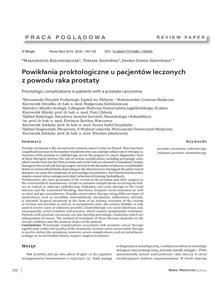 PRACA POGLĄDOWA Borgis © Borgis Nowa Med 2015; 22(4): 120-123 R E V I E W PA P E R DOI: 10.5604/17312485.1193555 *Małgorzata Kołodziejczak1, Tomasz Szopiński2, Iwona Sudoł-Szopińska3, 4 Powikłania proktologiczne u pacjentów leczonych z powodu raka prostaty Proctologic complications in patients with a prostate carcinoma Warszawski Ośrodek Proktologii, Szpital św. Elżbiety – Mokotowskie Centrum Medyczne Kierownik Ośrodka: dr hab. n. med. Małgorzata Kołodziejczak 2 Katedra i Klinika Urologii, Collegium Medicum Uniwersytetu Jagiellońskiego, Kraków Kierownik Kliniki: prof. dr hab. n. med. Piotr Chłosta 3 Zakład Radiologii, Narodowy Instytut Geriatrii, Reumatologii i Rehabilitacji im. prof. dr hab. n. med. Eleonory Reicher, Warszawa Kierownik Zakładu: prof. dr hab. n. med. Iwona Sudoł-Szopińska 4 Zakład Diagnostyki Obrazowej, II Wydział Lekarski, Warszawski Uniwersytet Medyczny Kierownik Zakładu: prof. dr hab. n. med. Wiesław Jakubowski 1 Summary Prostate carcinoma is the second most common cancer in men in Poland. There has been a significant increase in the number of patients who can undergo radical cancer therapy, i.e. resection of the prostate or radiotherapy, due to the progress in cancer diagnostics. Each of these therapies involves the risk of various complications, including proctologic ones, which results from the fact that prostate and rectal wall are situated in immediate vicinity. Damage to the rectal wall during surgery can lead to the formation of abscess, rectal bladder fistula or rectourethral fistula, depending on the clinical course. Damage to the pelvic neural plexuses can cause the symptoms of stool and gas incontinence. Such functional disorders require conservative management (diet, behavioural training, biofeedback). Furthermore, the close proximity of the rectum to the prostate and, after surgery, to the vesicourethral anastomosis, results in common complications occurring secondary to radical or adjuvant radiotherapy. Radiation can cause damage to the rectal mucosa and the associated bleeding, diarrhoea, frequent rectal tenesmus as well as stool and gas incontinence. Usually conservative therapy using different types of medications, such as sucralfate, metronidazole, mesalazine, sulfasalazin, steroids, is initiated. Surgical treatment in the form of an ostomy, resection of the rectum or rectum and prostate as well as, in exceptional cases, the urinary bladder, is only used in severe cases of radiation proctitis. Chemotherapy can cause diarrhoea and, consequently, rectal irritation and pruritus, which require symptomatic treatment. Patients with prostate carcinoma can also develop proctologic conditions which are independent of cancer. The method of treatment of these diseases depends on the overall condition and the immune status of the patient. Conclusions. Proctologic complications associated with prostate cancer therapy significantly reduce the quality of life of patients. In most cases conservative therapy is used to reduce the symptoms, however, severe complications, such as rectal haemorrhage or rectal bladder fistula, require surgical treatment. Wstęp Rak prostaty jest po raku płuca drugim co do częstości występowania nowotworem u mężczyzn (1). Stały postęp 120 Key wo rd s prostate carcinoma, radiotherapy, radiation proctitis, chemotherapy w diagnostyce onkologicznej, a zwłaszcza odkrycie swoistego antygenu sterczowego (ang. prostate specific antygen – PSA) spowodowały wzrost wykrywalności raka stercza w coraz wcześniejszym stadium zaawansowania. W chwili obecnej Nowa Medycyna 4/2015 Powikłania proktologiczne u pacjentów leczonych z powodu raka prostaty ponad 60% pacjentów z rakiem prostaty zostaje zdiagnozowanych we wczesnym stadium choroby ograniczonej do narządu. Spowodowało to zwiększenie liczby chorych z rakiem stercza poddawanych leczeniu radykalnemu, tj. radykalnej prostatektomii i radioterapii. Pomimo znaczącego postępu technologicznego w zakresie obu tych metod leczenia, jak również niewątpliwych korzyści terapeutycznych, ryzyko powikłań związanych z leczeniem raka prostaty nadal stanowi ważny problem kliniczny. Możliwe powikłania to problemy natury ogólnej, powikłania ze strony układu moczowego, np. nietrzymanie moczu, oraz ze strony narządów sąsiednich, w tym również proktologiczne. Odbytnica ze względu na położenie w bezpośredniej bliskości ze sterczem lub (po operacji) z zespoleniem pęcherzowo-cewkowym jest w tym przypadku narządem szczególnie narażonym na uszkodzenie. Skomplikowanym zagadnieniem są powikłania związane z uszkodzeniem odbytnicy w trakcie operacji, tzn. przetoki odbytniczo-pęcherzowe i odbytniczo-cewkowe. Podobnie radioterapia nie jest wolna od powikłań proktologicznych i powoduje stany zapalne odbytnicy i związane z tym obfite krwawienia. W przypadku popromiennego uszkodzenia odbytnicy prowadzącego do wystąpienia martwicy może dojść do powstania przetoki sterczowo-odbytniczej. Także leczenie paliatywne w postaci hormono- i chemioterapii niesie ryzyko wystąpienia działań ubocznych dotyczących odbytu i odbytnicy. Leczenie dolegliwości proktologicznych wymaga niejednokrotnie interdyscyplinarnego podejścia (urolog, proktolog, onkolog). Problemy proktologiczne jako następstwo leczenia chirurgicznego Zasadniczym sposobem leczenia raka stercza ograniczonego do narządu jest prostatektomia radykalna. Zabieg ten wykonuje się z kilku dostępów: przezkroczowego, załonowego otwartego oraz laparoskopowego przez- i pozaotrzewnowego. W każdym przypadku kluczowym elementem operacji jest całkowite usunięcie stercza i odtworzenie ciągłości dróg moczowych. Dzięki znaczącemu postępowi techniki operacyjnej i dobrej znajomości anatomii, odsetek powikłań pooperacyjnych stale się obniża. W chwili obecnej metodą wiodącą, która niewątpliwie stanowi przyszłość tej operacji, jest dostęp laparoskopowy. Bezpośrednie sąsiedztwo odbytnicy s
