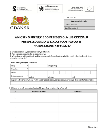 Nr wniosku Wypełnia jednostka Data złożenia Godzina złożenia WNIOSEK O PRZYJĘCIE DO PRZEDSZKOLA LUB ODDZIAŁU PRZEDSZKOLNEGO W SZKOLE PODSTAWOWEJ NA ROK SZKOLNY 2016/2017 1. Wniosek należy wypełnić drukowanymi literami. 2. Pola zaznaczone gwiazdką są obowiązkowe. 3. We wniosku rodzic deklaruje wybór maksymalnie 3 placówek (a w każdej z nich tylko i wyłącznie jeden oddział przedszkolny). I. Dane identyfikacyjne kandydata Imię * Nazwisko * PESEL * Data urodzenia * Drugie imię dzień miesiąc rok W przypadku braku numeru PESEL należy podać rodzaj, serię oraz numer innego dokumentu tożsamości: II. Lista wybranych jednostek i oddziałów, według kolejności preferencji Lp. Nazwa jednostki* Oddział* 1 2 3 Strona 1 z 4 III. Pozostałe informacje o kandydacie Adres zamieszkania kandydata Województwo * Ulica Powiat * Nr budynku * Gmina * Kod poczty * Miejscowość * Poczta Nr lokalu * Dodatkowe informacje o kandydacie Orzeczenie o potrzebie kształcenia specjalnego* Numer orzeczenia Numer(y) PESEL rodzeństwa IV. Dane osobowe rodziców/opiekunów prawnych Rodzic ** Rodzic** Imię i nazwisko * Telefon Adres e-mail Zgodnie z art. 25-28ustawy z dnia 23 kwietnia 1964 r. kodeks cywilny (Dz.U z 2014 r. poz. 121 ze zm.) miejscem zamieszkania osoby fizycznej jest miejscowość, w której osoba ta przebywa z zamiarem stałego pobytu. Miejscem zamieszkania dziecka pozostającego pod władzą rodzicielską jest miejsce zamieszkania rodziców albo tego z rodziców, któremu wyłącznie przysługuje władza rodzicielska lub któremu zostało powierzone wykonywanie władzy rodzicielskiej. Jeżeli władza rodzicielska przysługuje na równi obojgu rodzicom mającym osobne miejsce zamieszkania, miejsce zamieszkania dziecka jest u tego z rodziców, u którego dziecko stale przebywa. Jeżeli dziecko nie przebywa stale u żadnego z rodziców, jego miejsce zamieszkania określa sąd opiekuńczy. Miejscem zamieszkania osoby pozostającej pod opieką jest miejsce zamieszkania opiekuna. Można mieć tylko jedno miejsce zamieszkania. Województwo * Powiat * Gmina * Miejscowość * Ulica Nr budynku * Nr lokalu Kod pocztowy * Poczta * Strona 2 z 4 V. Kryteria przyjęcia W poniższej tabeli należy zakreślić wybrane odpowiedzi. Odpowiedzi dla kryteriów automatycznych zostaną uzupełnione na podstawie podanych informacji. Kryteria ustawowe Wielodzietność rodziny kandydata (3 i więcej dzieci) Tak / Nie / Odmowa odpowiedzi Niepełnosprawność kandydata Tak / Nie / Odmowa odpowiedzi Niepełnosprawność jednego z rodziców kandydata Tak / Nie / Odmowa odpowiedzi Niepełnosprawność obojga rodziców kandydata Tak / Nie / Odmowa odpowiedzi Niepełnosprawność rodzeństwa kandydata Tak / Nie / Odmowa odpowiedzi Samotne wychowywanie kandydata w rodzinie Tak / Nie / Odmowa odpowiedzi Objęcie kandydata pieczą zastępczą Tak / Nie / Odmowa odpowiedzi Kryteria gminne Dziecko zamieszkujące w obwodzie szkoły z oddziałami przedszkolnymi do której składany jest wniosek Dziecko zamieszkujące w obwodzie szkoły podstawowej aplikujące do przedszkola położonego w obwodzie tej szkoły - kryterium dotyczy dzieci realizujących obowiązek rocznego przygotowania przedszkolnego Dziecko którego oboje rodziców pracują / studiują /uczą się w syste mie dziennym Dziecko, którego rodzeństwo już uczęszcza do przedszkola do którego składany jest wniosek Dziecko, dla którego rodzeństwa składany jest wniosek do tego samego przedszkola/ oddziału przedszkolnego w szkole podstawowej Tak / Nie / Odmawiam odpowiedzi Tak / Nie / Odmawiam odpowiedzi Tak / Nie / Odmowa odpowiedzi Tak / Nie / Odmowa odpowiedzi Tak / Nie / Odmowa odpowiedzi VI. Oświadczenie dotyczące treści zgłoszenia Oświadczam, iż wszystkie podane w niniejszym wniosku dane są zgodne ze stanem faktycznym. Jestem świadomy(a) odpowiedzialności karnej za złożenie fałszywego oświadczenia. Oświadczam, iż zapoznałem(am) się z przepisami ustawy z dnia 7 września 1991 roku o systemie oświaty (Dz.U.2015 poz. 2156 ze zm.) obejmującymi zasady rekrutacji do przedszkoli i szkół oraz zasadami wprowadzonymi przez gminę jako organ prowadzący. W szczególności mam świadomość przysługujących komisji rekrutacyjnej, rozpatrującej niniejszy niosek, uprawnień do potwierdzenia okoliczności wskazanych w powyższych oświadczeniach. Strona 3 z 4 Przyjmuję do wiadomości, że w przypadku zakwalifikowania dziecka do placówki będę zobowiązany(a) potwierdzić wolę korzystania z usług placówki poprzez podpisanie umowy z przedszkolem w terminie wskazanym w harmonogramie postępowania rekrutacyjnego. Mam świadomość, że brak podpisania umowy we wskazanym terminie oznacza wykreślenie dziecka z listy zakwalifikowanych i utratę miejsca w placówce. (podpis rodzica / opiekuna prawnego 1) i/lub (podpis rodzica / opiekuna prawnego 2) VII. Oświadczenie dotyczące danych osobowych Przyjmuję do wiadomości, iż zgodnie z przepisami ustawy z dnia 29 sierpnia 1997 roku o ochronie danych osobowych (Dz.U.2015 poz. 2135 ze zm.) administratorem danych osobowych są przedszkola/szkoły, których pełne nazwy są wskazane we wniosku. Mam świadomość przysługującego mi prawa wglądu do treści danych oraz ich poprawiania. Podstawą prawną przetwarzania danych przez placówkę jest art. 23 ust. 1 pkt 2 ustawy z dnia 29 sierpnia 1997 r. o ochronie danych osobowych (t.j. Dz.U.2015 poz. 2135 ze zm.) w związku z art. 20s, 20t, 20z, i 20 ze ustawy z dnia 7 września 1991 roku o systemie oświaty (tj. Dz. U. z 2015 poz. 2156 ze zm.) Zakres danych określony jest w przepisach ustawy z dnia 7 września 1991 roku o systemie oświaty (tj. Dz. U. z 2015 poz. 2156 ze zm.). Rodzic ma prawo odmówić podania określonych informacji, przy czym może to skutkować brakiem możliwości udziału w procesie rekrutacji do placówki lub brakiem możliwości skorzystania z uprawnienia do pierwszeństwa w kwalifikacji. (podpis rodzica / opiekuna prawnego