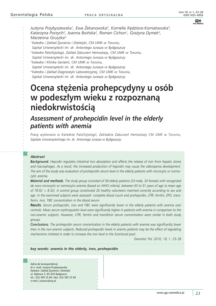 Gerontologia Polska tom 18, nr 1, 23–28 ISSN 1425–4956 PRACA ORYGINALNA Justyna Przybyszewska1, Ewa Żekanowska2, Kornelia Kędziora-Kornatowska3, Katarzyna Porzych3, Joanna Boińska2, Roman Cichon1, Grażyna Dymek4, Marzenna Gruszka4 1 Katedra i Zakład Żywienia i Dietetyki, CM UMK w Toruniu, Szpital Uniwersytecki im. dr. Antoniego Jurasza w Bydgoszczy 2 Katedra Patofizjologii, Zakład Zaburzeń Hemostazy, CM UMK w Toruniu, Szpital Uniwersytecki im. dr. Antoniego Jurasza w Bydgoszczy 3 Katedra i Klinika Geriatrii, CM UMK w Toruniu, Szpital Uniwersytecki im. dr. Antoniego Jurasza w Bydgoszczy 4 Katedra i Zakład Diagnostyki Laboratoryjnej, CM UMK w Toruniu, Szpital Uniwersytecki im. dr. Antoniego Jurasza w Bydgoszczy Ocena stężenia prohepcydyny u osób w podeszłym wieku z rozpoznaną niedokrwistością Assessment of prohepcidin level in the elderly patients with anemia Pracę wykonano w Katedrze Patofizjologii, Zakładzie Zaburzeń Hemostazy CM UMK w Toruniu, Szpitala Uniwersyteckiego im. dr. Antoniego Jurasza w Bydgoszczy Abstract Background. Hepcidin regulates intestinal iron absorption and affects the release of iron from hepatic stores and macrophages. As a result, the increased production of hepcidin may cause the sideropenia development. The aim of the study was evaluation of prohepcidin serum level in the elderly patients with microcytic or normocytic anemia. Material and methods. The study group consisted of 58 elderly patients (24 male, 34 female) with recognized de novo microcytic or normocytic anemia (based on WHO criteria), between 65 to 91 years of age (a mean age of 78.92 ± 8.32). A control group constituted 26 healthy volunteers matched correctly according to sex and age. In the examined subjects were assessed: complete blood count and prohepcidin, sTfR, ferritin, EPO, transferrin, iron, TIBC concentration in the blood serum. Results. Serum prohepcidin, iron and TIBC were significantly lower in the elderly patients with anemia over controls. Mean serum erythropoietin level were significantly higher in patients with anemia in comparison to the non-anemic subjects. However, sTfR, ferritin and transferrin serum concentration were similar in both study groups. Conclusions. The prohepcidin serum concentration in the elderly patients with anemia was significantly lower than in the non-anemic subjects. Reduced prohepcidin levels in anemic patients may be the effect of regulating mechanisms initiated in order to increase the iron level in the functional pool. Gerontol. Pol. 2010; 18, 1: 23–28 key words: anemia in the elderly, iron, prohepcidin Adres do korespondencji: dr n. med. Justyna Przybyszewska Katedra i Zakład Żywienia i Dietetyki ul. Dębowa 3, 85–626 Bydgoszcz tel.: (52) 585 25 86, faks: (52) 585 25 84 e-mail: [email protected] www.gp.viamedica.pl 23 Gerontologia Polska 2010, tom 18, nr 1 Wstęp Niedokrwistość u osób w podeszłym wieku stanowi istotny problem opieki zdrowotnej. Częstość występowania niedokrwistości w populacji osób powyżej 60. roku życia waha się w szerokim zakresie (3–61%) i dotyczy szczególnie pacjentów hospitalizowanych oraz podopiecznych domów opieki społecznej [1– –3]. Niedokrwistość u starszych osób znacząco wpływa na pogorszenie jakości życia i dodatkowo stanowi niezależny czynnik ryzyka zwiększonej śmiertelności, zaburzeń naczyniowo-mózgowych oraz sercowo-naczyniowych [3–5]. W badaniu Third National Health and Nutrition Examination Study (NHANES III) wykazano 3 główne przyczyny występowania anemii w populacji geriatrycznej [6] obserwowane w prawie jednakowym odsetku: — utrata krwi i/lub niedobory pokarmowe obejmujące żelazo, kobalaminę, kwas foliowy (ok. 34%); — przewlekły proces zapalny (ok. 32%) towarzyszący wielu jednostkom klinicznym, w tym chorobom nerek, reumatycznym oraz nowotworowym; — tło niewyjaśnione (ok. 34%) [6]. W dotychczasowych badaniach biologicznych oraz nielicznych doniesieniach klinicznych wskazuje się na istotną rolę hepcydyny w patomechanizmie niedokrwistości wtórnych. Hepcydyna jest krótkim, bogatym w cysteinę peptydem o masie cząsteczkowej około 3 kDa, wyizolowanym po raz pierwszy w 2000 roku przez 2 niezależne zespoły. Krause i wsp. [7] wyizolowali peptyd z ultrafiltratu krwi, nazywając go LEAP-1 (liver-expressed antimicrobial peptide) ze względu na zaobserwowane w trakcie badań właściwości antybakteryjne i przeciwgrzybicze oraz najsilniej wyrażoną ekspresję genu dla LEAP-1 w wątrobie. Park i wsp. [8] udało się wyizolować opisywany hormon z ludzkiego moczu. W tym przypadku dla nowo odkrytego hormonu zaproponowano określenie hepcydyna, wywodzące się od hepatocyte (czyli głównego miejsca syntezy), bactericidal (czyli działania bakteriobójczego) oraz budowy chemicznej, czyli protein [8]. W najnowszych badaniach wykazano, że synteza hepcydyny zachodzi także w aktywowanych bakteriami granulocytach obojętnochłonnych oraz makrofagach [9]. Oprócz wątroby ekspresję genu dla hepcydyny obserwuje się także w sercu, mózgu, płucach, migdałkach, tchawicy, śliniankach, prostacie, tarczycy, pęcherzu moczowym, żołądku oraz nerkach, jednak w tych narządach, w warunkach fizjologicznych jest ona nieporównywalnie niższa [7, 10, 11]. Hepcydyna syntetyzowana jest pierwotnie jako prepropeptyd o długości 84 aminokwasów, w którego strukturze wyróżnia się: złożoną z 24 reszt 24 www.gp.viamedica.pl aminokwasowych sekwencję sygnałową (N-koniec), 35-aminokwasowy proregion oraz w części C-końcowej, obejmujący 25 reszt aminokwasowych, peptyd właściwy [7, 8, 12, 13]. Zaangażowanie hepcydyny w ogólnoustrojową homeostazę żelaza obejmuje hamowanie absorpcji żelaza pokarmowego ze światła enterocytów absorpcyjnych oraz hamowanie uwalniania żelaza zapasowego z komórek układu siateczkowo-śródbłonkowego. Hepcydyna wpływa na gospodarkę żelazową poprzez oddziaływanie z ferroportyną (Fpn) [14]. Ferroportyna jes