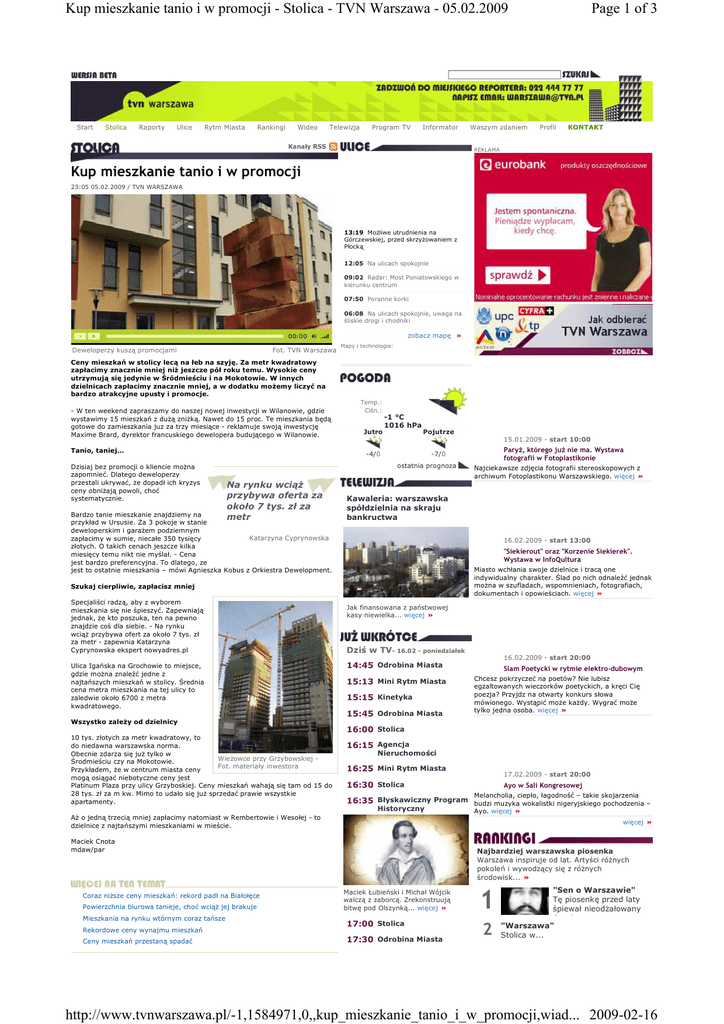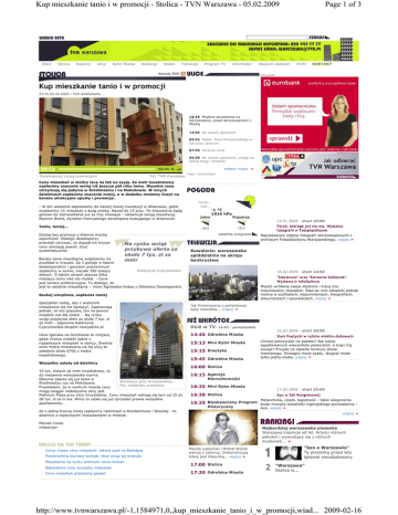 Kup mieszkanie tanio i w promocji - Stolica - TVN Warszawa - 05.02.2009 Start Stolica Raporty Ulice Rytm Miasta Rankingi Wideo Telewizja Program TV Informator Kanały RSS Waszym zdaniem Page 1 of 3 Profil KONTAKT REKLAMA Kup mieszkanie tanio i w promocji 23:05 05.02.2009 / TVN WARSZAWA 13:19 MoŜliwe utrudnienia na Górczewskiej, przed skrzyŜowaniem z Płocką 12:05 Na ulicach spokojnie 09:02 Radar: Most Poniatowskiego w kierunku centrum 07:50 Poranne korki 06:08 Na ulicach spokojnie, uwaga na śliskie drogi i chodniki zobacz mapę » Deweloperzy kuszą promocjami Fot. TVN Warszawa Mapy i technologia: Ceny mieszkań w stolicy lecą na łeb na szyję. Za metr kwadratowy zapłacimy znacznie mniej niŜ jeszcze pół roku temu. Wysokie ceny utrzymują się jedynie w Śródmieściu i na Mokotowie. W innych dzielnicach zapłacimy znacznie mniej, a w dodatku moŜemy liczyć na bardzo atrakcyjne upusty i promocje. - W ten weekend zapraszamy do naszej nowej inwestycji w Wilanowie, gdzie wystawimy 15 mieszkań z duŜą zniŜką. Nawet do 15 proc. Te mieszkania będą gotowe do zamieszkania juz za trzy miesiące - reklamuje swoją inwestycję Maxime Brard, dyrektor francuskiego dewelopera budującego w Wilanowie. Tanio, taniej… Dzisiaj bez promocji o kliencie moŜna zapomnieć. Dlatego deweloperzy przestali ukrywać, Ŝe dopadł ich kryzys i ceny obniŜają powoli, choć systematycznie. Temp.: Ciśn.: Jutro -1 °C 1016 hPa Pojutrze 15.01.2009 - start 10:00 -4/0 ostatnia prognoza Na rynku wciąŜ przybywa oferta za około 7 tys. zł za metr Bardzo tanie mieszkanie znajdziemy na przykład w Ursusie. Za 3 pokoje w stanie deweloperskim i garaŜem podziemnym Katarzyna Cyprynowska zapłacimy w sumie, niecałe 350 tysięcy złotych. O takich cenach jeszcze kilka miesięcy temu nikt nie myślał. - Cena jest bardzo preferencyjna. To dlatego, ze jest to ostatnie mieszkania – mówi Agnieszka Kobus z Orkiestra Dewelopment. Najciekawsze zdjęcia fotografii stereoskopowych z archiwum Fotoplastikonu Warszawskiego. więcej » Kawaleria: warszawska spółdzielnia na skraju bankructwa 16.02.2009 - start 13:00 "Siekierout" oraz "Korzenie Siekierek". Wystawa w InfoQultura Miasto wchłania swoje dzielnice i tracą one indywidualny charakter. Ślad po nich odnaleźć jednak moŜna w szufladach, wspomnieniach, fotografiach, dokumentach i opowieściach. więcej » Szukaj cierpliwie, zapłacisz mniej Specjaliści radzą, aby z wyborem mieszkania się nie śpieszyć. Zapewniają jednak, Ŝe kto poszuka, ten na pewno znajdzie coś dla siebie. - Na rynku wciąŜ przybywa ofert za około 7 tys. zł za metr - zapewnia Katarzyna Cyprynowska ekspert nowyadres.pl ParyŜ, którego juŜ nie ma. Wystawa fotografii w Fotoplastikonie -7/0 Jak finansowana z państwowej kasy niewielka... więcej » Dziś w TV - 16.02 - poniedziałek 16.02.2009 - start 20:00 Ulica Igańska na Grochowie to miejsce, gdzie moŜna znaleźć jedne z najtańszych mieszkań w stolicy. Średnia cena metra mieszkania na tej ulicy to zaledwie około 6700 z metra kwadratowego. 14:45 Odrobina Miasta 15:13 Mini Rytm Miasta 15:15 Kinetyka 15:45 Odrobina Miasta Slam Poetycki w rytmie elektro-dubowym Chcesz pokrzyczeć na poetów? Nie lubisz egzaltowanych wieczorków poetyckich, a kręci Cię poezja? Przyjdz na otwarty konkurs słowa mówionego. Wystąpić moŜe kaŜdy. Wygrać moŜe tylko jedna osoba. więcej » Wszystko zaleŜy od dzielnicy 16:00 Stolica 10 tys. złotych za metr kwadratowy, to do niedawna warszawska norma. Obecnie zdarza się juŜ tylko w WieŜowce przy Grzybowskiej Środmieściu czy na Mokotowie. Fot. materiały inwestora Przykładem, Ŝe w centrum miasta ceny mogą osiągać niebotyczne ceny jest Platinum Plaza przy ulicy Grzyboskiej. Ceny mieszkań wahają się tam od 15 do 28 tys. zł za m kw. Mimo to udało się juŜ sprzedać prawie wszystkie apartamenty. 16:15 Agencja Nieruchomości 16:25 Mini Rytm Miasta 16:35 Błyskawiczny Program Historyczny AŜ o jedną trzecią mniej zapłacimy natomiast w Rembertowie i Wesołej - to dzielnice z najtańszymi mieszkaniami w mieście. Powierzchnia biurowa tanieje, choć wciąŜ jej brakuje Mieszkania na rynku wtórnym coraz tańsze Rekordowe ceny wynajmu mieszkań Ceny mieszkań przestaną spadać Ayo w Sali Kongresowej Melancholia, ciepło, łagodność – takie skojarzenia budzi muzyka wokalistki nigeryjskiego pochodzenia – Ayo. więcej » więcej » Maciek Cnota mdaw/par Coraz niŜsze ceny mieszkań: rekord padł na Białołęce 17.02.2009 - start 20:00 16:30 Stolica Najbardziej warszawska piosenka Warszawa inspiruje od lat. Artyści róŜnych pokoleń i wywodzący się z róŜnych środowisk... » Maciek Łubieński i Michał Wójcik walczą z zaborcą. Zrekonstruują bitwę pod Olszynką... więcej » 17:00 Stolica 17:30 Odrobina Miasta 1 2 "Sen o Warszawie" Tę piosenkę przed laty śpiewał nieodŜałowany Czesław... "Warszawa" Stolica w... http://www.tvnwarszawa.pl/-1,1584971,0,,kup_mieszkanie_tanio_i_w_promocji,wiad... 2009-02-16 Kup mieszkanie tanio i w promocji - Stolica - TVN Warszawa - 05.02.2009 Wyślij znajomemu Drukuj artykuł Komentarze (0) Dodaj wątek Codziennie inne spojrzenie na Warszawę, spojrzenie przenikliwego oka dziennikarza... więcej » Page 2 of 3 3 4 "Warszawa da się lubić" Teksty tej piosenki napisał... 5 "Piosenka o mojej Warszawie" Najbardziej znana z... "Nie masz cwaniaka nad Warszawiaka" "MoŜesz mnie chamem... więcej » Nie ma jeszcze wątków na tym forum. Zacznij własny Zasady forum Publikowane komentarze są prywatnymi opiniami uŜytkowników portalu. TVN Warszawa.pl nie ponosi odpowiedzialności za treść opinii. 17:45 Stolica Wasze zdjęcia Wreszcie dowiesz się co dzieje się w Twoim mieście. Twoja codzienna droga, Twoje... więcej » 30 lat katastrofy w Rotundzie @danieluk 18:10 Rytm Miasta 30 lat katastrofy w Rotundzie @danieluk Wasze wideo file:///ameryka Co, gdzie, kiedy i za ile? Co warto zobaczyć a czego lepiej unikać? Codziennie... więcej 