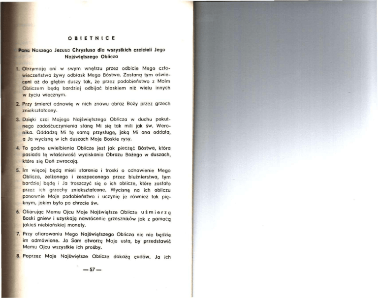 O B I E T N I C E Pana Naszego Jezusa Chrystusa dla wszystkich czcicieli Jego Najświętszego Oblicza Otrzymajg oni w swym wnętrzu przez odbicie Mego czło wieczeństwa żywy odblask M e g o Bóstwa. Zostang t y m o ś w i e ceni aż do głębin duszy tak, że przez podobieństwo z M o i m Obliczem będg bardziej odbijać blaskiem niż wielu innych w życiu w i e c z n y m . 7. Przy śmierci o d n o w i ę w nich znowu obraz Boży przez grzech zniekształcony. 3. Dzięki czci Mojego Najświętszego Oblicza w duchu pokut nego zadośćuczynienia stang Mi się tak mili jak św. W e r o nika. Oddadzg Mi tę samq przysługę, jakg Mi ono o d d a ł a , a Ja wycisnę w ich duszach Moje Boskie rysy. A. To g o d n e uwielbienia Oblicze jest jak pieczęć Bóstwa, która posiada tę właściwość wyciskania Obrazu Bożego w duszach, które się Doń z w r a c a j g . 5. Im więcej będg mieli Oblicza, zelżonego starania i troski o o d n o w i e n i e i zeszpeconego przez Mego blużnierstwa, tym bardziej będę i Ja troszczyć się o ich oblicze, które zostało przez ich ponownie grzechy zniekształcone. Wycisnę na ich obliczu Moje p o d o b i e ń s t w o i uczynię je również tak p i ę k n y m , j a k i m b y ł o po chrzcie św. 6. Ofiarujgc M e m u O j c u Moje Najświętsze Oblicze u ś m i e r z g Boski gniew i uzyskajg nawrócenie grzeszników jak z p o m o c g jakieś niebiańskiej monety. 7. Przy o f i a r o w a n i u M e g o Najświętszego Oblicza nic nie będzie im o d m ó w i o n e . Ja S a m otworzę Moje usta, by przedstawić M e m u O j c u wszystkie ich prośby. a Poprzez Moje Najświętsze Oblicze — 57 — dokażg cudów. Ja ich oświecę M o i m S w i o t t e m , ogarnę ich Mojg Mifościg, utwierdzę ich w d o b r e m . 9. N i g d y ich nie opuszczę. 10. Wszystkich t y c h , którzy poprzez s ł o w a , m o d l i t w y albo poprzez pisma wspierają Mojg Sprawę w t y m p o k u t n y m dziele, będę bronił u Ojca Mojego. W godzinie ich śmierci oblicze ich duszy i wrócę im jej pierwotng oczyszczę piękność. U w n g a l Sq to wyjgtki z życia św. Gertrudy, św. M a t y l d y i W i e lebnej Siostry Marii od św. Piotra, karmelitanki w Tours. Te obietnice majg Imprimatur: Friburgi Helv, z dnia 31 października 1961 r. Th. Perroud, vic. g e n . M o d l i t w a Pozdrawiam Cię, wielbię Cię, k o c h a m Cię, o Jezu, mój Z b a wicielu, na nowo zelżonego bluźnierstwami, jakie sq nieustannie popełniane. Ofiaruję Ci w N i e p o k a l a n y m Sercu Twojej tszej Matki hołdy A n i o ł ó w Nojświę- i wszystkich Świętych j a k o w o ń ka dzidła i proszę Cię najpokorniej poprzez Moc Twego Najświętsze go Oblicza, byś raczył przywrócić i odnowić we mnie i we wszy stkich ludziach Twoje Oblicze, Twój Obraz, który przez nasze zostcł tak zeszpecony. O niepojęta skończone Dobroci Miłosierdzie, grzechy Amen. Boga, o ufam niewysławiona Tobie Miłości Miłości, o nie Ukrzyżowana bez granic. Ojcze Przedwieczny, ofiaruję Ci zbolałe Najśw. Oblicze Twego U k o c h a n e g o Syna jako nieskończone zadośćuczynienie i o k u p za nasze winy. Ojcze E.Yięły Przedwieczny, ofiaruję Je Tobie, aby złagodzić Twój gniew względem nas grzeszników. W s p o m n i j , że to Oblicze cierpiało niewypowiedzianie i nosiło ciernie naszych grzechów, b y zadośćuczynić Twojej S p r a w i e d l i w o ś c i . — Spójrz na 1e Boskie Rany! One wotajg nieustannie, a wraz z nimi pragnę i ja w o ł o ć : miłosierdzia, miłosierdzia, miłosierdzia dla grzeszników. Amen.