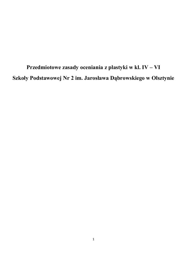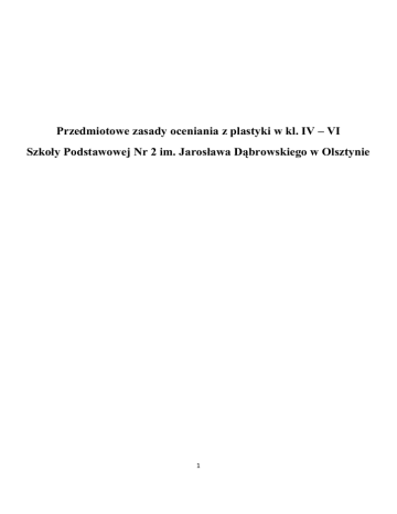 Przedmiotowe zasady oceniania z plastyki w kl. IV – VI Szkoły Podstawowej Nr 2 im. Jarosława Dąbrowskiego w Olsztynie 1 1. Wstęp Zasady oceniania wynikają z założeń Statutu Szkoły Podstawowej nr 2 im. Jarosława Dąbrowskiego w Olsztynie i jest jego integralną częścią. Wymagania edukacyjne w stosunku do uczniów wynikają z realizacji podstawy programowej poprzez wybrany program . 2. Słowniczek pojęć aktywność pracy na lekcji praca domowa praca dodatkowa (projekty, plakat, pomoce dydaktyczne) konkursy – udział w konkursach szkolnych, międzyszkolnych, ogólnopolskich odpowiedź ustna – obejmuje materiał programowy z ostatniej lekcji test – przeprowadzony jest po podsumowanym dziale dotyczącym epoki, stylu bądź danej dziedziny plastycznej rysunek – praca ołówkiem, kredkami ,flamastrami malarstwo – praca wykonana farbami praca przestrzenna (indywidualna) makieta – praca przestrzenna (grupowa) techniki mieszane (college) 3. Cele oceniania Ocenianie przedmiotowe ma na celu: • poinformowanie ucznia o poziomie jego osiągnięć edukacyjnych i postępach w tym zakresie, • pomoc uczniowi w samodzielnym planowaniu swojego rozwoju, • motywowanie ucznia do dalszej pracy, • dostarczenie rodzicom (prawnym opiekunom) informacji o postępach, trudnościach i specjalnych uzdolnieniach ucznia. Ocena wyników nauczania na zajęciach edukacyjnych – plastyka jest szczególnie utrudniona ze względu na duże różnice uzdolnień uczniów. Działania nauczyciela powinny zmierzać w kierunku życzliwego angażowania wszystkich uczniów do aktywnego udziału w zajęciach w miarę ich indywidualnych możliwości. Należy w szczególności brać pod uwagę zaangażowanie i wysiłek wkładany przez ucznia w wywiązywanie się z obowiązków wynikających ze specyfiki tych zajęć. 4. Obszary podlegające ocenie w całym etapie edukacyjnym. Podstawa programowa z plastyki na II etapie edukacyjnym określa kryteria, jakimi należy kierować się, oceniając wiedzę i umiejętności uczniów. Ocena powinna uwzględniać: – stosunek ucznia do przedmiotu – aktywność ucznia podczas pracy na lekcjach – zaangażowanie w realizację ćwiczeń plastycznych – estetykę wykonywanych prac – biegłość w posługiwaniu się technikami plastycznymi – znajomość terminologii plastycznej – wykorzystanie posiadanej wiedzy w praktycznym działaniu – znajomość zastosowania technologii informacyjno-komunikacyjnej do poszerzania wiedzy i umiejętności z plastyki – podstawową umiejętność analizy dzieła sztuki – uczestnictwo w życiu kulturalnym szkoły, regionu, np. udział w imprezach artystycznych, wystawach - wysiłek wkładany w realizację wymagań. Uzdolnienia plastyczne ucznia nie są podstawowym kryterium oceniania. 2 5. Wymagania na poszczególne oceny Klasa IV Wymagania ogólne ujęte w Podstawie programowej I. Odbiór wypowiedzi i wykorzystanie zawartych w nich informacji – percepcja sztuki. II. Tworzenie wypowiedzi – ekspresja przez sztukę. Treści nauczania ujęte w Podstawie programowej Wymagania na poszczególne oceny oraz zakres wiedzy i umiejętności 1. Percepcja sztuki. Uczeń: 1.1) określa swoją przynależność kulturową poprzez kontakt z wybranymi dziełami sztuki, zabytkami i tradycją w swoim środowisku lokalnym i regionalnym, a także uczestniczy w życiu kulturalnym tego środowiska (zna placówki kultury działające na jego rzecz); 1.2) korzysta z przekazów medialnych oraz stosuje ich wytwory w swojej działalności twórczej zgodnie z elementarnymi zasadami prawa autorskiego dotyczącymi ochrony własności intelektualnej. 2. Ekspresja przez sztukę. Uczeń: 2.1. podejmuje działalność twórczą, posługując się podstawowymi środkami wyrazu plastycznego i innych dziedzin sztuki (fotografiki, filmu) w kompozycji na płaszczyźnie i w przestrzeni (stosując określone materiały, narzędzia i techniki właściwe dla tych dziedzin sztuki); 2.2. realizuje projekty w zakresie form użytkowych, w tym służące kształtowaniu wizerunku i otoczenia człowieka oraz upowszechnianiu kultury w społecznościach szkolnej i lokalnej (stosując także narzędzia i wytwory Ocena celująca – 6 Wykazywanie zainteresowania sztuką. Aktywny udział w lekcjach. Staranne wykonywanie ćwiczeń plastycznych i zaangażowanie w ich realizację. Oryginalne rozwiązania tematów ćwiczeń. Wykazywanie się ponadprogramową wiedzą z zakresu terminologii plastycznej, a także z historii sztuki. Biegłe posługiwanie się w swoich działaniach plastycznych technikami plastycznymi. Umiejętność analizy dzieła sztuki wraz z elementami własnej interpretacji. Wykonywanie zadań i ćwiczeń ponadprogramowych. Uczestnictwo w konkursach plastycznych o różnym zasięgu: szkolne, regionalne, ogólnopolskie, międzynarodowe. Umiejętność posługiwania się technologią informacyjno-komunikacyjną w wyszukiwaniu wskazanych informacji oraz w twórczych działaniach plastycznych. Prezentowanie swojej twórczości w klasie, szkole, np. w formie wystaw, prezentacji. Ocena bardzo dobra – 5 Staranne wykonywanie ćwiczeń plastycznych. Przyswojenie wiadomości objętych programem. Zaangażowany udział w lekcji. Umiejętność posługiwania się technologią informacyjno-komunikacyjną w wyszukiwaniu wskazanych informacji oraz w twórczych działaniach plastycznych. Umiejętność analizy dzieła sztuki. Wykonywanie zadań dodatkowych po zachęceniu przez nauczyciela. Ocena dobra – 4 Poprawne wykonywanie ćwiczeń plastycznych. Przyswojenie wiadomości objętych programem. Skupiony udział w lekcjach. Sprawne posługiwanie się technikami plastycznymi. Umiejętność posługiwania się technologią informacyjno-komunikacyjną w wyszukiwaniu wskazanych informacji oraz w twórczych działaniach plastycznych. Podstawowa umiejętność analizy dzieła sztuki. 3 III. Analiza i interpretacja tekstów kultury – recepcja sztuki. multimedialne). 3. Recepcj