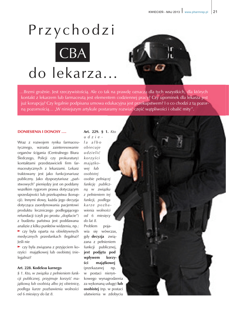 .:,(&,(ē0$- www.pharmrep.pl Przychodzi CBA do lekarza... …Brzmi groźnie. Jest rzeczywistością. Ale co tak na prawdę oznacza dla tych wszystkich, dla których kontakt z lekarzem lub farmaceutą jest elementem codziennej pracy? Czy upominek dla lekarza jest już korupcją? Czy legalnie podpisana umowa edukacyjna jest przekupstwem? I o co chodzi z tą pozorną pozornością… „W niniejszym artykule postaramy rozwiać część wątpliwości i obalić mity”. DONIESIENIA I DONOSY …. Wraz z rozwojem rynku farmaceutycznego, wzrasta zainteresowanie organów ścigania (Centralnego Biura Śledczego, Policji czy prokuratury) kontaktami przedstawicieli firm farmaceutycznych z lekarzami. Lekarz traktowany jest jako funkcjonariusz publiczny. Jako dyspozytariusz „państwowych” pieniędzy jest on poddany wszelkim rygorom prawa dotyczącym sprzedajności lub przekupstwa (korupcji). Innymi słowy, każda jego decyzja dotycząca zaordynowania pacjentowi produktu leczniczego podlegającego refundacji (czyli po prostu „dopłacie”) z budżetu państwa jest poddawana analizie z kilku punktów widzenia, np.: ̶ czy była oparta na obiektywnych medycznych przesłankach (legalna)? Jeśli nie ̶ czy była związana z przyjęciem korzyści majątkowej lub osobistej (nielegalna)? Art. 228. Kodeksu karnego § 1. Kto, w związku z pełnieniem funkcji publicznej, przyjmuje korzyść majątkową lub osobistą albo jej obietnicę, podlega karze pozbawienia wolności od 6 miesięcy do lat 8. Art. 229. § 1. Kto u d z i e la albo obiecuje udzielić korzyści majątkowej lub osobistej osobie pełniącej funkcję publiczną w związku z pełnieniem tej funkcji, podlega karze pozbawienia wolności od 6 miesięcy do lat 8. Problem pojawia się wówczas, gdy decyzja związana z pełnieniem funkcji publicznej, jest podjęta pod wpływem korzyści majątkowej (przekazanej np. w postaci nierynkowego wynagrodzenia za wykonaną usługę) lub osobistej (np. w postaci ułatwienia w zdobyciu 21 22 PHARMACEUTICAL REPRESENTATIVE POLSKA punktów edukacyjnych). Ponieważ celem państwa jest ochrona obiektywizmu osób pełniących funkcje publiczne i zaufania społecznego do rzetelności instytucji państwoPrawo farmaceutyczne (zakaz obiecywania lub wręczania korzyści lekarzom i farmaceutom) - art. 58 w zw. art.128 Prawa farmaceutycznego Art. 58.1. Zabrania się kierowania do osób uprawnionych do wystawiania recept oraz osób prowadzących obrót produktami leczniczymi reklamy produktu leczniczego polegającej na wręczaniu, oferowaniu i obiecywaniu korzyści materialnych, prezentów i różnych ułatwień, nagród, wycieczek oraz organizowaniu i finansowaniu spotkań promocyjnych produktów leczniczych, podczas których przejawy gościnności wykraczają poza główny cel tego spotkania. 2. Zabrania się przyjmowania korzyści, o których mowa w ust. 1. 3. Przepisy ust. 1 i 2 nie dotyczą dawania lub przyjmowania przedmiotów o wartości materialnej nieprzekraczającej kwoty 100 złotych, związanych z praktyką medyczną lub farmaceutyczną, opatrzonych znakiem reklamującym daną firmę lub produkt leczniczy. Art. 128. Kto wbrew przepisom art. 58 w ramach reklamy produktu leczniczego daje lub obiecuje osobom uprawnionym do wystawiania recept lub osobom prowadzącym obrót produktami leczniczymi korzyści materialne lub przyjmuje takie korzyści, podlega grzywnie. Ustawa refundacyjna Art. 54. 1. Kto zajmując się wytwarzaniem lub obrotem lekami, podlegającymi refundacji ze środków publicznych, przyjmuje korzyść majątkową lub osobistą albo jej obietnicę lub takiej korzyści żąda w zamian za zachowanie wywierające wpływ na: 1. poziom obrotu lekami; 2. obrót lub powstrzymanie się od obrotu konkretnym lekiem; - podlega karze pozbawienia wolności od 6 miesięcy do 8 lat (w wypadku mniejszej wagi sprawca czynu podlega karze pozbawienia wolności do lat 3). 2. Tej samej karze podlega, kto udziela lub obiecuje udzielić korzyści majątkowej lub osobistej. wych, przyjęcie korzyści, która wpływa lub na stronnicze działanie zostało uznane za naruszenie norm prawa. W przypad- „Były wiceminister zdrowia [...] został ku rynku farmaceutycznego, ustawo- prawomocnie skazany za korupcję. Sąd dawca poszedł o krok dalej, ograni- Okręgowy w Kielcach wymierzył mu czając formy promocji i dozwolonych w poniedziałek (10 stycznia) karę roku korzyści, które mogą być kierowane i 10 miesięcy więzienia w zawieszeniu do lekarzy do wyraźnie wskazanych na cztery lata oraz 22,5 tys. zł grzywny. w Prawie farmaceutycznym. Wprowadził również kolejne przepisy dodatko- Sąd potwierdził winę [...] odnośnie wo ograniczające działania, jakie mogą siedmiu zarzutów Prokuratury Okręgobyć stosowane w relacji do produktów wej w Radomiu; czterech o charakterze korupcyjnym i trzech dotyczących refundowanych. poświadczenia nieprawdy w dokumenZasadniczym problemem jest roz- tach. różnienie pomiędzy tym co legalne i dozwolone a pomiędzy tym co nie- Zarzuty dotyczyły okresu od lipca 2001 legalne i niedozwolone. Czy każda roku do listopada 2003 roku, kiedy [...] korzyść jest zabroniona? Czy to co zo- był zastępcą dyrektora w skarżyskim stało dopuszczone jako korzyść, np. ZOZ. Przyjął wówczas od przedstatzw. dozwolone upominki w Prawie wicieli firmy [...] korzyści majątkowe farmaceutycznym (wartość do 100 zł, w kwocie ponad 22 tys. zł, w zamian związane z działalnością medyczną za preferowanie przy zakupie materialub farmaceutyczną, oznaczone logo łów medycznych tej firmy.” firmy lub logo produktu), jest korzyścią niedozwoloną w rozumieniu przepi- Źródło: PAP/rynekzdrowia.pl sów korupcyjnych? Gdzie jest granica 10.01.2011 r. między tym co wolno, a tym czego nie wolno? Jak mamy prawidłowo re- Płynność granicy między tym co legalagować na takie doniesienia medialne ne a tym co nielegalne, swoista medialna nagonka na firmy farmaceutyczjak: ne i ich rzekome lub faktyc