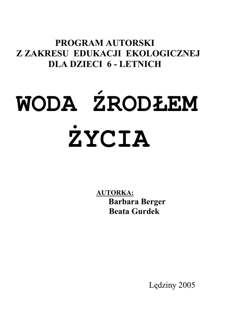 PROGRAM AUTORSKI Z ZAKRESU EDUKACJI EKOLOGICZNEJ DLA DZIECI 6 - LETNICH WODA ŹRODŁEM śYCIA AUTORKA: Barbara Berger Beata Gurdek Lędziny 2005 SPIS TREŚCI Wstęp ……………………………………………………..............................4 Cele ogólne …………………………………………….......................7 Cele szczegółowe………………………………….......................7 Obudowa dydaktyczna ……………………….......................8 Warunki wdroŜenia programu …….......................8 Materiał nauczania…………………………….......................9 Bibliografia…………………………………………….......................20 2 CELE OGÓLNE 1. Tworzenie warunków do poznania ekosystemu wodnego oraz znaczenia wody dla rozwoju Ŝycia na ziemi. 2. Poznanie niektórych przyczyn degradacji środowiska wodnego przez człowieka. 3. Pomaganie dzieciom w rozwijaniu i stosowaniu zachowań chroniących, oszczędzających wodę oraz środowisko wodne. 4. Kształtowanie podstawowych zasad ochrony przyrody przez uświadomienie, Ŝe jest ona niezbędna w Ŝyciu człowieka. 5. Wyrabianie umiejętności dostrzegania zjawisk w ekosystemach, przewidywania i oceny pewnych następstw obserwowanych zjawisk przyrodniczych i czynów człowieka. 6. Formowanie i umacnianie pozytywnych przekonań i postaw wobec określonych zjawisk i obiektów przyrodniczych. 7. Rozwijanie umiejętności zmysłowego poznania i artystycznego podejścia do wody. CELE SZCZEGÓŁOWE: 1. 2. 3. 4. 5. 6. 7. Dziecko zna ekosystem wodny. Dziecko zna i rozumie zasady ochrony przyrody. Dziecko wyraŜa się w mowie i sztuce. Dziecko rozumie potrzebę oszczędzania wody. Dziecko akceptuje działania ludzi na rzecz ochrony środowiska. Dziecko jest otwarte na poznanie naszej planety. Dziecko zdobywa doświadczenia badawcze w zakresie wód. 3 OBUDOWA DYDAKTYCZNA Podczas realizacji programu, będę opierała się na pracy: - indywidualnej - zespołowej - grupowej W pracy z dziećmi będę stosowała następujące metody: - aktywizujące - poszukujące WARUNKI WDROZENIA PROGRAMU Treści zawarte w programie autorskim będę wdraŜała w proces wychowawczo – dydaktyczny dwa razy w tygodniu. Realizacja programu będzie odbywać się w sali, w której zgromadzone będą wszelkie pomoce dydaktyczne związane z ekologią – między innymi mapy Polski i świata, kalendarz pogody z jego elementami, kasety i płyty z nagraniami /odgłosy wody / i kolorowa literatura. Zaproszeni zostaną goście zajmujący się ochroną środowiska. Przedszkole nawiąŜe współpracę ze Stowarzyszeniem Gospodarczo- Ekologicznym ,,Nasz region”. Działalność oparta będzie na bezpośrednim kontakcie z przyrodą ,,Na łonie natury”. 4 „PRZYSZŁOŚĆ LUDZKOŚCI ZALEśY BOWIEM OD TEGO CZY ZDĄśYMY ODPOWIEDNIO WYCHOWAĆ I NAUCZYĆ MŁODEGO CZŁOWIEKA śYĆ ZGODNIE Z NATURĄ, ZGODNIE Z WYMOGAMI WŁAŚCIWIE POJĘTEJ EKOLOGII” B. PIONTEK 5 WSTĘP Celem niniejszego programu autorskiego jest poszerzenie i wzbogacenie treści programowych z zakresu edukacji ekologicznej, a takŜe zaspokojenie narastającego zaciekawienia otaczającym nas środowiskiem wykazywanego przez dzieci przedszkolne, które są coraz baczniejszymi obserwatorami Ŝycia przyrodniczego. Pragniemy stworzyć dzieciom warunki do twórczego, odkrywczego działania, rozwijania własnej osobowości, umiejętności decydowania i dokonywania wyboru. Realizując program będziemy korzystać z Programu Wychowania Przedszkolnego. ABC…. Program Wychowania Przedszkolnego XXI wieku numer dopuszczenia DKW- 40013-1/00 autorstwa Anny Łady- Grochockiej, Ewy Bełczewskiej, Maryli Herde, ElŜbiety Kwiatkowskiej –Klarzak i Joanny Wasilewskiej. 6 W czasach współczesnych coraz częściej mówi się o skaŜonym środowisku przyrodniczym, które osiągnęło juŜ stopień niebezpieczny dla Ŝycia. Zanieczyszczenia i dewastacja przyrody przybrały alarmujące rozmiary. Giną lasy, umierają rzeki. Wobec tych zjawisk nie moŜemy być obojętni. Ziemia potrzebuje pomocy. Wszyscy oddychamy wspólnym powietrzem, czeka nas wspólna przyszłość. Dlatego naleŜy dąŜyć do powstrzymywania dalszej dewastacji przyrody. Ekologia w przedszkolu nie jest czymś nowym. Poznanie przyrody zawsze było obecne w planach i w pracy pedagogicznej. Nauczyciele kształcą u dzieci świadomość ekologiczną. Dziecko jest bardzo podatne na oddziaływanie najbliŜszego środowiska a zwłaszcza przyrodniczego. Przejawia zainteresowanie wieloma obiektami i zjawiskami świata zwierzęcego, duŜą zdolnością przyswajania nowych wiadomości i umiejętności, wyjątkową chęcią do ekspresji przeŜyć odniesionych podczas bezpośredniego kontaktu z przyrodą. „Dziecko kocha to, o co się troszczy, czemu poświęca swój czas o czym myśli, na rzecz czyjegoś działania” Kontakt dziecka z przyrodą wywołuje u niego Ŝywe i silne uczucia, a tym samym gotowość jej poznania i ochrony. Słowem kształtujemy w dzieciach postawę ekologiczną, która charakteryzuje się szeroką zdolnością percepcji wobec zjawisk przyrodniczych i społecznych, ciekawością świata i praw nim rządzących, świadomością i zrozumieniem powiązań, zaleŜności i praw panujących w przyrodzie, odpowiedzialnością wobec form Ŝycia, aktywnością, poczuciem więzi z przyrodą i ludźmi. Edukacja ekologiczna to świadomie zamierzona, celowa, planowa, systematyczna i stopniowa działalność nauczyciela wobec dzieci przy ich pozytywnej motywacji i wielostronnej działalności. Ochrona środowiska stała się wspólnym problemem i stymulatorem skupiającym całą społeczność przedszkolną. Wszyscy ci, którzy mają kontakt z dziećmi i młodzieŜą, powinni zdać sobie sprawę z tego, Ŝe są odpowiedzialni za kształtowanie właściwych postaw wobec przyrody. Nauczyciele i rodzice jako pierwsi wprowadzają dzieci w świat przyrody, jej praw i piękna. W trakcie zabaw,