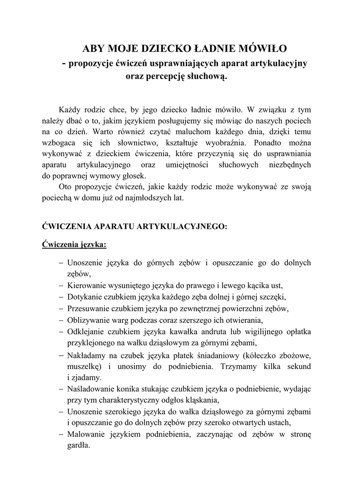 ABY MOJE DZIECKO ŁADNIE MÓWIŁO - propozycje ćwiczeń usprawniających aparat artykulacyjny oraz percepcję słuchową. Każdy rodzic chce, by jego dziecko ładnie mówiło. W związku z tym należy dbać o to, jakim językiem posługujemy się mówiąc do naszych pociech na co dzień. Warto również czytać maluchom każdego dnia, dzięki temu wzbogaca się ich słownictwo, kształtuje wyobraźnia. Ponadto można wykonywać z dzieckiem ćwiczenia, które przyczynią się do usprawniania aparatu artykulacyjnego oraz umiejętności słuchowych niezbędnych do poprawnej wymowy głosek. Oto propozycje ćwiczeń, jakie każdy rodzic może wykonywać ze swoją pociechą w domu już od najmłodszych lat. ĆWICZENIA APARATU ARTYKULACYJNEGO: Ćwiczenia języka: − Unoszenie języka do górnych zębów i opuszczanie go do dolnych zębów, − Kierowanie wysuniętego języka do prawego i lewego kącika ust, − Dotykanie czubkiem języka każdego zęba dolnej i górnej szczęki, − Przesuwanie czubkiem języka po zewnętrznej powierzchni zębów, − Oblizywanie warg podczas coraz szerszego ich otwierania, − Odklejanie czubkiem języka kawałka andruta lub wigilijnego opłatka przyklejonego na wałku dziąsłowym za górnymi zębami, − Nakładamy na czubek języka płatek śniadaniowy (kółeczko zbożowe, muszelkę) i unosimy do podniebienia. Trzymamy kilka sekund i zjadamy. − Naśladowanie konika stukając czubkiem języka o podniebienie, wydając przy tym charakterystyczny odgłos kląskania, − Unoszenie szerokiego języka do wałka dziąsłowego za górnymi zębami i opuszczanie go do dolnych zębów przy szeroko otwartych ustach, − Malowanie językiem podniebienia, zaczynając od zębów w stronę gardła. Ćwiczenia warg: − − − − − − − − − − − − Przesadnie wyraźne wymawianie samogłosek u – i, Wymawianie samogłosek a – o przy szeroko otwartych ustach, Naprzemienne zagryzanie górnej i dolnej wargi, Wysuwanie i spłaszczanie złączonych warg (układanie warg na kształt uśmiechu i „ryjka”), Cmokanie, Gwizdanie, Przesuwanie ściągniętych warg na prawo – na lewo, Parskanie wargami (jak konik), Naśladowanie poprzez wibrację warg warkotu motoru, helikoptera, itp. Przerzucanie powietrza z jednego policzka do drugiego, Nadymanie policzków i powolne wypuszczanie powietrza, Wciąganie wargami cukierka zawiązanego na nitce. Ćwiczenia podniebienia miękkiego: − − − − − Ziewanie przy nisko opuszczonej żuchwie, Chrapanie na wdechu i na wydechu, Kaszel z językiem wsuniętym między zęby, Chrząkanie, Wciąganie powietrza przez słomkę i jednoczesne przysysanie drobnych kawałków papieru oraz przenoszenie ich na inne miejsce, − Silne, powolne przełykanie śliny, − Głośne, energiczne i rytmiczne wymawianie samogłosek , − Wyrazista i energiczna wymowa zestawów sylabowych, w skład których wchodzą głoski k, g, np. uku, ugu, oko, ogo, ukku, uggu,okko, oggo. ĆWICZENIA ODDECHOWE: − Dmuchanie na piórko, piłeczkę ping-pongową, waciki, kawałki papieru (można dmuchać po gładkiej i po chropowatej powierzchni np. po papierze ściernym), − Dmuchanie na wstążki zawiązane na patyku, na waciki czy kokardki przywiązane do sznurka, itp. − − − − − − − − − − Chuchanie na „zmarznięte ręce” oraz „gorącą zupę”, Wąchanie kwiatków, napojów, Dmuchanie na wiatraczek, Dmuchanie na zapaloną świeczkę tak, aby płomień nie zgasł, tylko wygiął się, Nadmuchiwanie baloników, Gwizdanie, Puszczanie baniek mydlanych, Dmuchanie do naczynia z wodą przez rurkę, Przedmuchiwanie kropelki wody po stole, Gra na grzebieniu owiniętym bibułą. ĆWICZENIA SŁUCHOWE − „ Co słyszę?” – dzieci siedzą z zamkniętymi oczami i nasłuchują, − − − − − − − − rozpoznają odgłosy dochodzące z sąsiedztwa, ulicy. „ Zgadnij, co wydało dźwięk?” • Uderzanie łyżeczką w szkło, metal, kamień, drewno itp. • Toczenie różnych przedmiotów po podłodze, np. piłki, kasztana, kamienia, • Rozpoznawanie różnych przedmiotów w zamkniętym pudełku – groch, kamyki, gwoździe, cukier, kasza itp. • Uderzanie o siebie klockami, łyżeczkami, garnuszkami, Szukanie ukrytego zegarka, radia, dzwoniącego budzika. Rozróżnianie i naśladowanie głosów zwierząt: kota, psa, krowy, kury, koguta, kaczki, gęsi itp. Rozróżnianie odgłosów pojazdów: samochodu, pociągu, motoru, traktora itp. Rozpoznawanie po dźwięku różnych urządzeń domowych, np. odkurzacz, mikser, suszarka, pralka itp. Wyklaskiwanie rytmu piosenki, Powtarzanie rytmu wystukanego ołówkiem na stoliku, Wyróżnianie wyrazów w zdaniu (stawiamy tyle klocków, rysujemy tyle kółeczek, klaszczemy tyle razy, ile słów słyszy dziecko w wypowiadanym zdaniu), − − − − − Wydzielanie sylab w wyrazach poprzez wyklaskiwanie sylab, Wydzielanie głoski nagłosowej czy wygłosowej słów. Stwierdzanie obecności rymów, odnajdywanie rymów, Czytanie dziecku bajek, wierszyków, Zapamiętywanie sekwencji wypowiedzianych samogłosek (np. U – A – I, E – O – U), sylab (np, LA – ME, KO – WI – BA), słów (np, układamy przed dzieckiem kilkanaście obrazków, następnie wymieniamy dwa z nich, zadaniem dziecka jest ułożenie obrazków wymienionych przez rodzica zgodnie z kolejnością przez niego podaną, stopniowo zwiększamy ilość wymienianych obrazków). Opracowała Iwona Majka BIBLIOGRAFIA: Cieszyńska J., 2003, Metody wywoływania głosek. Kraków. Michalak – Widera I., Węsierska K., 2009, Będę wielkim mówcą. Poziom I – Zabawy buzi i języka dla każdego smyka. Katowice. Morkowska E., Żmuda – Trzebiatowska K., 2011, Język hop do góry! Ćwiczenia logopedyczne dla dzieci, Warszawa. Szłapa K., 2010, Cmokaj, dmuchaj, parskaj, chuchaj. Ćwiczenia oddechowe i artykulacyjne dla najmłodszych. Gdańsk.