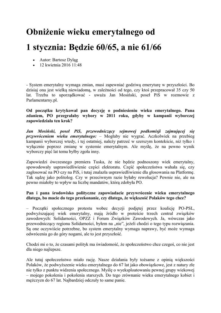 Obniżenie wieku emerytalnego od 1 stycznia: Będzie 60/65, a nie 61/66 Autor: Bartosz Dyląg 12 kwietnia 2016 11:48 - System emerytalny wymaga zmian, musi zapewniać godziwą emeryturę w przyszłości. Bo dzisiaj ona jest wielką niewiadomą, w zależności od tego, czy ktoś przepracował 35 czy 50 lat. Trzeba to uporządkować - uważa Jan Mosiński, poseł PiS w rozmowie z Parlamentarny.pl. Od początku krytykował pan decyzję o podniesieniu wieku emerytalnego. Pana zdaniem, PO przegrałaby wybory w 2011 roku, gdyby w kampanii wyborczej zapowiedziała ten krok? Jan Mosiński, poseł PiS, przewodniczący sejmowej podkomisji zajmującej się przywróceniem wieku emerytalnego: – Mogłaby nie wygrać. Aczkolwiek na przebieg kampanii wyborczej wtedy, i tej ostatniej, należy patrzeć w szerszym kontekście, niż tylko i wyłącznie poprzez zmianę w systemie emerytalnym. Ale myślę, że na pewno wynik wyborczy pięć lat temu byłby zgoła inny. Zapowiedzi ówczesnego premiera Tuska, że nie będzie podnoszony wiek emerytalny, spowodowały usprawiedliwienie części elektoratu. Część społeczeństwa wahała się, czy zagłosować na PO czy na PiS, i tutaj znalazła usprawiedliwienie dla głosowania na Platformę. Tak sądzę jako politolog. Czy w przeciwnym razie byłaby rewolucja? Pewnie nie, ale na pewno miałoby to wpływ na liczbę mandatów, którą zdobyła PO. Pan i pana środowisko polityczne zapowiadacie przywrócenie wieku emerytalnego dlatego, bo macie do tego przekonanie, czy dlatego, że większość Polaków tego chce? – Początki społecznego protestu wobec decyzji podjętej przez koalicję PO-PSL, podwyższającej wiek emerytalny, mają źródło w proteście trzech central związków zawodowych: Solidarności, OPZZ i Forum Związków Zawodowych. Ja, wówczas jako przewodniczący regionu Solidarności, byłem na „nie”, jeżeli chodzi o tego typu rozwiązania. Są one oczywiście potrzebne, bo system emerytalny wymaga naprawy, być może wymaga odwrócenia go do góry nogami, ale to jest przyszłość. Chodzi mi o to, że czasami polityk ma świadomość, że społeczeństwo chce czegoś, co nie jest dla niego najlepsze. Ale tutaj społeczeństwo miało rację. Nasze działania były tożsame z opinią większości Polaków, że podwyższenie wieku emerytalnego do 67 lat jako obowiązkowe, jest z natury złe nie tylko z punktu widzenia społecznego. Myślę o wyeksploatowaniu pewnej grupy wiekowej – mojego pokolenia i pokolenia starszych. Do tego zrównanie wieku emerytalnego kobiet i mężczyzn do 67 lat. Najbardziej odczuły to same panie. Ale średnia długość życia Polek rośnie. – To nie do końca tak jest, to są dane, które są zamazane. Kwestia modelu badawczego, który został przyjęty. Powtórzę – nasze stanowisko było o tyle ułatwione, bo bazowało na opinii społecznej. Jako politycy chcemy być wiarygodni, pracujemy nad przywracaniem wieku emerytalnego 60/65. Ale nie mówimy, że koniec wieńczy dzieło. Chcemy zmienić cały system emerytalny. W jakim kierunku? – Jestem świeżo po spotkaniu u prof. Gertrudy Uścińskiej, prezes ZUS z udziałem minister Rafalskiej, ministra Kowalczyka, władz komisji sejmowych. Rozmawialiśmy o różnego rodzaju dylematach, które w efekcie końcowym mają zmienić system na bardziej korzystny. Co ciekawego udało się ustalić? – Rozmawialiśmy m.in. o klinie podatkowym, o prognozie długoletniej funduszu emerytalnego. Projekcja całego programu będzie przedstawiona na Radzie Ministrów, następnie na sejmowej podkomisji nadzwyczajnej ds. emerytur i rent. Jest to element prac, których finałem będzie zmiana systemu emerytalnego. Ktoś musiał to rozpocząć. Proszę mnie jednak zwolnić z odpowiedzi na pytanie o szczegóły, za wcześnie, by o nich mówić. Jakie zatem są pańskie przemyślenia na temat zmian systemu emerytalnego? – Zasada generalna: w większości państw instytucje jak nasz ZUS są deficytowe, przynoszą wynik ujemny. Chodzi o to, by ujednolicić system, być może wprowadzić jakąś progresję przy oskładkowaniu umów – umowy o pracy czy umowy zlecenia obłożyć inną daniną. To wszystko przed nami. Musimy zmienić system tak, by pracownik w przypadku każdej formy umowy płacił składkę na ubezpieczenie społeczne pozwalającą na zaspokojenie starości pod względem materialnym. Może warto zastanowić się nad wzorcem niemieckim? – Być może. Nie wiem, na dzisiaj nie mam do końca sprecyzowanego poglądu. On na pewno wykrystalizuje się podczas spotkań na poziomie komisji nadzwyczajnej. System emerytalny wymaga zmian, musi zapewniać godziwą emeryturę w przyszłości. Bo dzisiaj ona jest wielką niewiadomą, w zależności od tego, czy ktoś przepracował 35 czy 50 lat. Trzeba to uporządkować. Kilka dni temu Rada Dialogu Społecznego zgodziła się, że potrzebne jest zatrzymanie zmian w wieku emerytalnym. W propozycji dla kobiet wiek emerytalny to ukończony 61. rok życia, a dla mężczyzn - ukończone 66 lat. To sygnał, że coś w podejściu do przywrócenia wieku emerytalnego 60/65 się zmienia? – W Sejmie mamy projekt prezydencki mówiący o wieku emerytalnym 60/65 lat. Dla mnie to jest dokument zobowiązujący do przygotowania harmonogramu prac podkomisji nadzwyczajnej. Oczywiście zapoznam się z każdym innym materiałem, ale nie będzie on objęty procesem legislacyjnym. Chcemy, by od 1 stycznia w życie weszły zmiany polegające na tym, że kobieta w wieku 60 lat i mężczyzna w wieku 65 lat, będą mogli przejść na emeryturę. Nie jest to obowiązkowe, będzie dobrowolność, mogą pracować dłużej. Pojawia się postulat, by na emeryturę można było przejść także po osiągnięciu 35 lat okresów składkowych dla kobiet i 40 dla mężczyzn. Już dzisiaj mam korespondencję, protesty od obywateli, którzy mówią, że nie mają takiego okresu składkowego. Gdyby to było główne kryterium, to oni na emeryturę przejdą w wieku 