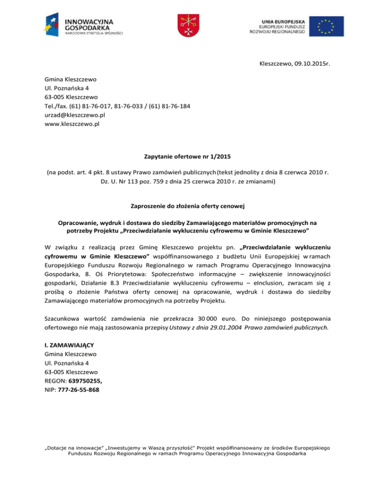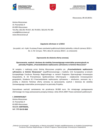 Kleszczewo, 09.10.2015r. Gmina Kleszczewo Ul. Poznańska 4 63-005 Kleszczewo Tel./fax. (61) 81-76-017, 81-76-033 / (61) 81-76-184 [email protected] www.kleszczewo.pl Zapytanie ofertowe nr 1/2015 (na podst. art. 4 pkt. 8 ustawy Prawo zamówień publicznych (tekst jednolity z dnia 8 czerwca 2010 r. Dz. U. Nr 113 poz. 759 z dnia 25 czerwca 2010 r. ze zmianami) Zaproszenie do złożenia oferty cenowej Opracowanie, wydruk i dostawa do siedziby Zamawiającego materiałów promocyjnych na potrzeby Projektu „Przeciwdziałanie wykluczeniu cyfrowemu w Gminie Kleszczewo” W związku z realizacją przez Gminę Kleszczewo projektu pn. „Przeciwdziałanie wykluczeniu cyfrowemu w Gminie Kleszczewo” współfinansowanego z budżetu Unii Europejskiej w ramach Europejskiego Funduszu Rozwoju Regionalnego w ramach Programu Operacyjnego Innowacyjna Gospodarka, 8. Oś Priorytetowa: Społeczeństwo informacyjne – zwiększenie innowacyjności gospodarki, Działanie 8.3 Przeciwdziałanie wykluczeniu cyfrowemu – eInclusion, zwracam się z prośbą o złożenie Państwa oferty cenowej na opracowanie, wydruk i dostawa do siedziby Zamawiającego materiałów promocyjnych na potrzeby Projektu. Szacunkowa wartość zamówienia nie przekracza 30 000 euro. Do niniejszego postępowania ofertowego nie mają zastosowania przepisy Ustawy z dnia 29.01.2004 Prawo zamówień publicznych. I. ZAMAWIAJĄCY Gmina Kleszczewo Ul. Poznańska 4 63-005 Kleszczewo REGON: 639750255, NIP: 777-26-55-868 „Dotacje na innowacje” „Inwestujemy w Waszą przyszłość” Projekt współfinansowany ze środków Europejskiego Funduszu Rozwoju Regionalnego w ramach Programu Operacyjnego Innowacyjna Gospodarka II. OPIS PRZEDMIOTU ZAMÓWIENIA Opracowanie, wydruk i dostawa do siedziby Zamawiającego materiałów promocyjnych na potrzeby Projektu zgodnie z „Przewodnikiem w zakresie promocji projektów finansowanych w ramach Programu Operacyjnego Innowacyjna Gospodarka, 2007-2013 dla Beneficjentów i Instytucji zaangażowanych we wdrażanie Programu”, dostępnym na stronie internetowej Władzy Wdrażającej Programy Europejskie http://www.wwpe.gov.pl/files/POIG/Przewodnik_dla_beneficjentow_dot_i_i_prom_proj_wersja_28. 06.2010_czysty.pdf • • • • projekt graficzny wraz z wykonaniem projekt graficzny wraz z wykonaniem informacyjnego, projekt graficzny wraz z wykonaniem (pamiątkowej), projekt graficzny wraz z wykonaniem wydruku oraz dostawa folderu informacyjnego, wydruku oraz dostawa roll-up (banera) wydruku oraz dostawa tablicy informacyjnej wydruku oraz dostawa naklejek informacyjnych. z uwzględnieniem: - logotypów zgodnych z wytycznymi Ministerstwa Rozwoju Regionalnego (MRR) dotyczącymi oznaczania projektów realizowanych w ramach PO IG, - informacji o współfinansowaniu projektu ze środków Unii Europejskiej w ramach Europejskiego Funduszu Rozwoju Regionalnego wraz hasłem promocyjnym określonym przez MRR: „Dotacje na innowacje. Inwestujemy w waszą przyszłość”. Projekt współfinansowany przez Unię Europejską ze środków Europejskiego Funduszu Rozwoju Regionalnego w ramach Programu Operacyjnego Innowacyjnego Gospodarka 2007 – 2013”, -herb zamawiającego – Gminy Kleszczewo. Warunek konieczny: wszystkie materiały promocyjne muszą odpowiadać kryteriom i wzorcom określonym w „Przewodniku w zakresie promocji projektów finansowanych w ramach Programu Operacyjnego Innowacyjna Gospodarka, 2007-2013 dla beneficjentów i instytucji zaangażowanych we wdrażanie Programu” opracowanym przez Ministerstwo Rozwoju Regionalnego. Szczegółowy opis przedmiotu zamówienia: 1. Przygotowanie projektu graficznego folderu informacyjnego według wskazówek Zamawiającego, wydruk folderów – 300 szt., folder składany na Z, format A4 (210mmx297mm) do DL (99mmx210mm), druk dwustronny, kolorowy (4/4 CMYK) na papierze kredowanym, błyszczącym, gramatura minimum 135 g. Układ folderu powinien zawierać: - logo Unii Europejskiej z podpisem „Unia Europejska. Europejski Fundusz Rozwoju Regionalnego”, - logo Programu Operacyjnego Innowacyjna Gospodarka, - herb Gminy Kleszczewo - poza ciągiem znaków, w dolnej części tablicy, zgodnie z przykładem nr 11, należy umieścić informację o współfinansowaniu projektu, - nazwę realizowanego projektu, jego łączny budżet i wysokość dofinansowania ze środków UE, - okres realizacji projektu, - hasło przeznaczone dla PO IG - Dotacje na innowacje Inwestujemy w Waszą przyszłość. „Dotacje na innowacje” „Inwestujemy w Waszą przyszłość” Projekt współfinansowany ze środków Europejskiego Funduszu Rozwoju Regionalnego w ramach Programu Operacyjnego Innowacyjna Gospodarka 2. Przygotowanie projektu graficznego roll-up (banera) według wskazówek Zamawiającego, wydruk banerów - 3 szt., - format planszy graficznej: szerokość 1200 mm x wysokość 2000 mm; - druk: pełnokolorowy (CMYK); - materiał: baner o gramaturze minimum 500 g/m2 bez efektu zawijania się boków lub falowania materiału; - konstrukcja: wersja wzmocniona - lux lub premium; kaseta aluminiowa z systemem rolującym, aluminiowa listwa zatrzaskowa; - roll-up blackout gładki, mat; - opakowanie: pokrowiec - torba transportowa; materiał: poliester 600D lub materiał o nie niższych właściwościach estetyczno-użytkowych; kolor: czarny. Układ roll-up powinien zawierać: - logo Unii Europejskiej z podpisem „Unia Europejska. Europejski Fundusz Rozwoju Regionalnego”, - logo Programu Operacyjnego Innowacyjna Gospodarka, - herb Gminy Kleszczewo - poza ciągiem znaków, w dolnej części tablicy, zgodnie z przykładem nr 11, należy umieścić informację o współfinansowaniu projektu, - nazwę realizowanego projektu, jego łączny budżet i wysokość dofinansowania ze środków UE, - okres realizacji projektu, - hasło przeznaczone dla PO IG - Dotacje na innowacje Inwestujemy w Waszą przyszłość. 3. Przygotowanie projektu graficznego oraz wykonanie tablicy pamiątkowej o wymiarach 40 c