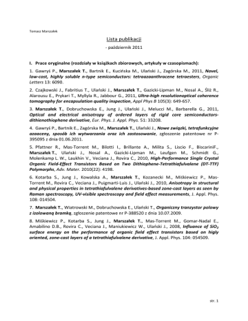 Tomasz Marszałek Lista publikacji - październik 2011 I. Prace oryginalne (rozdziały w książkach zbiorowych, artykuły w czasopismach): 1. Gawryś P., Marszałek T., Bartnik E., Kucińska M., Ulański J., Zagórska M., 2011, Novel, low-cost, highly soluble n-type semiconductors: tetraazaanthracene tetraesters, Organic Letters 13: 6090. 2. Czajkowski J., Fabritius T., Ulański J., Marszałek T., Gazicki-Lipman M., Nosal A., Śliż R., Alarousu E., Prykari T., Myllyla R., Jabbour G., 2011, Ultra-high resolutionoptical coherence tomography for encapsulation quality inspection, Appl Phys B 105(3): 649-657. 3. Marszałek T., Dobruchowska E., Jung J., Ulański J., Melucci M., Barbarella G., 2011, Optical and electrical anisotropy of ordered layers of rigid core semiconductorsdithienothiophene derivative, Eur. Phys. J. Appl. Phys. 51: 33208. 4. Gawryś P., Bartnik E., Zagórska M., Marszałek T., Ulański J., Nowe związki, tetrafunkcyjne azaaceny, sposób ich wytwarzania oraz ich zastosowanie, zgłoszenie patentowe nr P395095 z dnia 01.06.2011. 5. Pfattner R., Mas-Torrent M., Bilotti I., Brillante A., Milita S., Liscio F., BiscariniF., Marszałek T., Ulański J., Nosal A., Gazicki-Lipman M., Leufgen M., Schmidt G., Molenkamp L. W., Laukhin V., Veciana J., Rovira C., 2010, High-Performance Single Crystal Organic Field-Effect Transistors Based on Two Dithiophene-Tetrathiafulvalene (DT-TTF) Polymorphs, Adv. Mater. 2010(22): 4198. 6. Kotarba S., Jung J., Kowalska A., Marszałek T., Kozanecki M., Miśkiewicz P., MasTorrent M., Rovira C., Veciana J., Puigmarti-Luis J., Ulański J., 2010, Anisotropy in structural and physical properties in tetrathiafulvalene derivatives-based zone-cast layers as seen by Raman spectroscopy, UV-visible spectroscopy and field effect measurements, J. Appl. Phys. 108: 014504. 7. Marszałek T., Wiatrowski M., Dobruchowska E., Ulański T., Organiczny tranzystor polowy z izolowaną bramką, zgłoszenie patentowe nr P-388520 z dnia 10.07.2009. 8. Miśkiewicz P., Kotarba S., Jung J., Marszałek T., Mas-Torrent M., Gomar-Nadal E., Amabilino D.B., Rovira C., Veciana J., Maniukiewicz W., Ulański J., 2008, Influance of SiO2 surface energy on the performance of organic field effect transistors based on higly oriented, zone-cast layers of a tetrathiafulvalene derivative, J. Appl. Phys. 104: 054509. str. 1