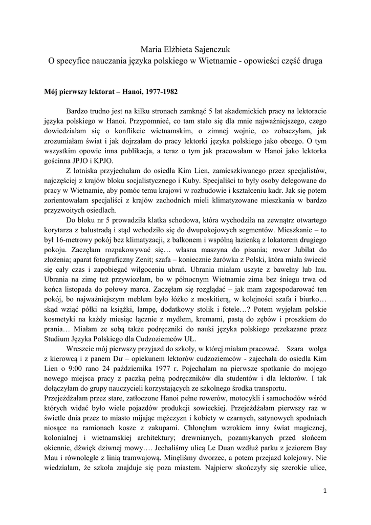 Maria Elżbieta Sajenczuk O specyfice nauczania języka polskiego w Wietnamie - opowieści część druga Mój pierwszy lektorat – Hanoi, 1977-1982 Bardzo trudno jest na kilku stronach zamknąć 5 lat akademickich pracy na lektoracie języka polskiego w Hanoi. Przypomnieć, co tam stało się dla mnie najważniejszego, czego dowiedziałam się o konflikcie wietnamskim, o zimnej wojnie, co zobaczyłam, jak zrozumiałam świat i jak dojrzałam do pracy lektorki języka polskiego jako obcego. O tym wszystkim opowie inna publikacja, a teraz o tym jak pracowałam w Hanoi jako lektorka gościnna JPJO i KPJO. Z lotniska przyjechałam do osiedla Kim Lien, zamieszkiwanego przez specjalistów, najczęściej z krajów bloku socjalistycznego i Kuby. Specjaliści to były osoby delegowane do pracy w Wietnamie, aby pomóc temu krajowi w rozbudowie i kształceniu kadr. Jak się potem zorientowałam specjaliści z krajów zachodnich mieli klimatyzowane mieszkania w bardzo przyzwoitych osiedlach. Do bloku nr 5 prowadziła klatka schodowa, która wychodziła na zewnątrz otwartego korytarza z balustradą i stąd wchodziło się do dwupokojowych segmentów. Mieszkanie – to był 16-metrowy pokój bez klimatyzacji, z balkonem i wspólną łazienką z lokatorem drugiego pokoju. Zaczęłam rozpakowywać się… własna maszyna do pisania; rower Jubilat do złożenia; aparat fotograficzny Zenit; szafa – koniecznie żarówka z Polski, która miała świecić się cały czas i zapobiegać wilgoceniu ubrań. Ubrania miałam uszyte z bawełny lub lnu. Ubrania na zimę też przywiozłam, bo w północnym Wietnamie zima bez śniegu trwa od końca listopada do połowy marca. Zaczęłam się rozglądać – jak mam zagospodarować ten pokój, bo najważniejszym meblem było łóżko z moskitierą, w kolejności szafa i biurko… skąd wziąć półki na książki, lampę, dodatkowy stolik i fotele…? Potem wyjęłam polskie kosmetyki na każdy miesiąc łącznie z mydłem, kremami, pastą do zębów i proszkiem do prania… Miałam ze sobą także podręczniki do nauki języka polskiego przekazane przez Studium Języka Polskiego dla Cudzoziemców UŁ. Wreszcie mój pierwszy przyjazd do szkoły, w której miałam pracować. Szara wołga z kierowcą i z panem Dư – opiekunem lektorów cudzoziemców - zajechała do osiedla Kim Lien o 9:00 rano 24 października 1977 r. Pojechałam na pierwsze spotkanie do mojego nowego miejsca pracy z paczką pełną podręczników dla studentów i dla lektorów. I tak dołączyłam do grupy nauczycieli korzystających ze szkolnego środka transportu. Przejeżdżałam przez stare, zatłoczone Hanoi pełne rowerów, motocykli i samochodów wśród których widać było wiele pojazdów produkcji sowieckiej. Przejeżdżałam pierwszy raz w świetle dnia przez to miasto mijając mężczyzn i kobiety w czarnych, satynowych spodniach niosące na ramionach kosze z zakupami. Chłonęłam wzrokiem inny świat magicznej, kolonialnej i wietnamskiej architektury; drewnianych, pozamykanych przed słońcem okiennic, dźwięk dziwnej mowy…. Jechaliśmy ulicą Le Duan wzdłuż parku z jeziorem Bay Mau i równolegle z linią tramwajową. Minęliśmy dworzec, a potem przejazd kolejowy. Nie wiedziałam, że szkoła znajduje się poza miastem. Najpierw skończyły się szerokie ulice, 1 pojawiła się droga utwardzona, a potem wzdłuż drogi pojawiły się małe domki kryte bambusową strzechą. I tak dojechaliśmy do Wyższej Szkoły Języków Obcych. Przed budynkiem w piaskowym kolorze z drewnianymi okiennicami czekali lektorzy języka polskiego Pani Hoang Thu Oanh, Pan Le Đinh Tư i Pan Dang Van Hien. Oanh i Tư ukończyli studia ze specjalizacją językoznawczą, tylko Hien był fizykiem i matematykiem. Przyszedł także dziekan Wydziału Przygotowawczego WSJO dr Pham Van Binh i rektor dr Trãng Ngoc Kim. Była przerwa w zajęciach, więc jako nowa polska lektorka mogłam przywitać się także z lektorami z krajów Wschodniego Bloku. Przy filiżance zielonej herbaty omówiliśmy pracę gościnnego lektora języka polskiego – czyli moją rolę, bo chociaż wszyscy byliśmy filologami polskimi, tylko ja byłam „native speaker`em”. Potem poszłam zapoznać się ze studentami i z doktorantami. Pamiętam, że byłam zaszokowana widokiem klas - szare, puste ściany, zamiast lamp - żarówki na przewodach pod sufitem, betonowa podłoga, tablica z kredą, drewniane ławki szkolne z pulpitami, brak okien, jedynie okiennice ze szparami wpuszczającymi promyki słońca i duszne powietrze, a w zimie – o czy miałam przekonać się niedługo - chłód. Był ciepły, ale już nie tropikalnie, październik, okna były otwarte, więc mogłam zobaczyć pola ryżowe, pasące się krowy i obok domy studenckie i inne, w których mieszkali nauczyciele i mieściła się administracja szkoły. I to był cały kampus. Kiedy popatrzyłam na studentów zobaczyłam małych, bladych, chudych, skośnookich chłopców w wieku 18-20 lat w jednakowych bawełnianych, jasnobrązowych mundurkach i w plastykowych sandałach. Wszyscy patrzyli na mnie z ciekawością. Kiedy studenci przywitali mnie głośnym „dzień dobry”, pomyślałam, że nic tu nie będzie łatwe. Podobnie było z grupą doktorantów - młodych dorosłych w wieku od 25 do 35 lat... Jeszcze tego samego dnia odbyłam kilka „zapoznawczych” lekcji z trzema grupami (75 osób) i wróciłam do Kim Lienu tą samą szarą wołgą. Cały czas miałam w myślach studentów, doktorantów, swoich nowych kolegów – wietnamskich nauczycieli, pracowników szkoły i te budynki… <i>My w Polsce narzekamy i patrzymy na Zachód, na tamten styl życia i kulturę. Tam wszystko jest… Oni są wolni i szczęśliwi… A jak jest u nas w Polsce? Jest siermiężnie, jest skromnie, ale nie jest aż tak źle, jak tutaj</i> – myślałam wiedząc niewiele o świecie. Im bardziej z czasem poznawałam i rozumiałam moich studentów, moich wietnamskich kolegów, histori