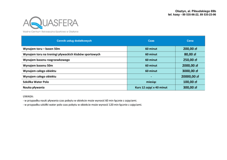 Olsztyn, al. Piłsudskiego 69b tel. kasy - 89 535-96-22, 89 535-23-96 Cennik usług dodatkowych Czas Cena Wynajem toru – basen 50m 60 minut Wynajem toru na treningi pływackich klubów sportowych 60 minut 200,00 zł 80,00 zł Wynajem basenu rozgrzewkowego 60 minut Wynajem basenu 50m 60 minut Wynajem całego obiektu 60 minut Wynajem całego obiektu - Szkółka Water Polo Nauka pływania miesiąc Kurs 12 zajęć x 40 minut 250,00 zł 2000,00 zł 3000,00 zł 20000,00 zł 100,00 zł 300,00 zł UWAGA: - w przypadku nauki pływania czas pobytu w obiekcie może wynosić 60 min łącznie z zajęciami. - w przypadku szkółki water polo czas pobytu w obiekcie może wynosić 120 min łącznie z zajęciami. Cennik obowiązuje od 01.01.2014