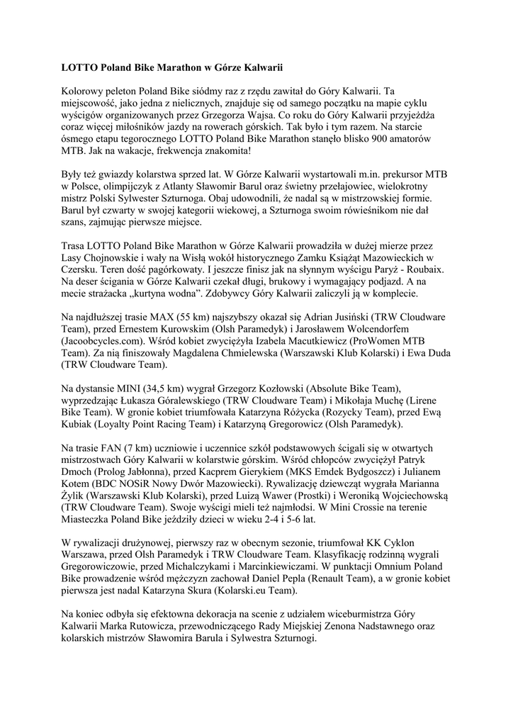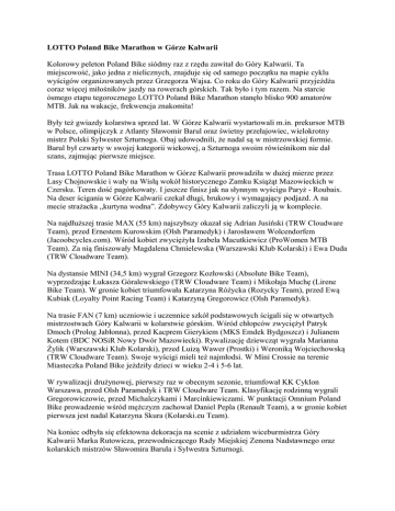 LOTTO Poland Bike Marathon w Górze Kalwarii Kolorowy peleton Poland Bike siódmy raz z rzędu zawitał do Góry Kalwarii. Ta miejscowość, jako jedna z nielicznych, znajduje się od samego początku na mapie cyklu wyścigów organizowanych przez Grzegorza Wajsa. Co roku do Góry Kalwarii przyjeżdża coraz więcej miłośników jazdy na rowerach górskich. Tak było i tym razem. Na starcie ósmego etapu tegorocznego LOTTO Poland Bike Marathon stanęło blisko 900 amatorów MTB. Jak na wakacje, frekwencja znakomita! Były też gwiazdy kolarstwa sprzed lat. W Górze Kalwarii wystartowali m.in. prekursor MTB w Polsce, olimpijczyk z Atlanty Sławomir Barul oraz świetny przełajowiec, wielokrotny mistrz Polski Sylwester Szturnoga. Obaj udowodnili, że nadal są w mistrzowskiej formie. Barul był czwarty w swojej kategorii wiekowej, a Szturnoga swoim rówieśnikom nie dał szans, zajmując pierwsze miejsce. Trasa LOTTO Poland Bike Marathon w Górze Kalwarii prowadziła w dużej mierze przez Lasy Chojnowskie i wały na Wisłą wokół historycznego Zamku Książąt Mazowieckich w Czersku. Teren dość pagórkowaty. I jeszcze finisz jak na słynnym wyścigu Paryż - Roubaix. Na deser ścigania w Górze Kalwarii czekał długi, brukowy i wymagający podjazd. A na mecie strażacka „kurtyna wodna”. Zdobywcy Góry Kalwarii zaliczyli ją w komplecie. Na najdłuższej trasie MAX (55 km) najszybszy okazał się Adrian Jusiński (TRW Cloudware Team), przed Ernestem Kurowskim (Olsh Paramedyk) i Jarosławem Wolcendorfem (Jacoobcycles.com). Wśród kobiet zwyciężyła Izabela Macutkiewicz (ProWomen MTB Team). Za nią finiszowały Magdalena Chmielewska (Warszawski Klub Kolarski) i Ewa Duda (TRW Cloudware Team). Na dystansie MINI (34,5 km) wygrał Grzegorz Kozłowski (Absolute Bike Team), wyprzedzając Łukasza Góralewskiego (TRW Cloudware Team) i Mikołaja Muchę (Lirene Bike Team). W gronie kobiet triumfowała Katarzyna Różycka (Rozycky Team), przed Ewą Kubiak (Loyalty Point Racing Team) i Katarzyną Gregorowicz (Olsh Paramedyk). Na trasie FAN (7 km) uczniowie i uczennice szkół podstawowych ścigali się w otwartych mistrzostwach Góry Kalwarii w kolarstwie górskim. Wśród chłopców zwyciężył Patryk Dmoch (Prolog Jabłonna), przed Kacprem Gierykiem (MKS Emdek Bydgoszcz) i Julianem Kotem (BDC NOSiR Nowy Dwór Mazowiecki). Rywalizację dziewcząt wygrała Marianna Żylik (Warszawski Klub Kolarski), przed Luizą Wawer (Prostki) i Weroniką Wojciechowską (TRW Cloudware Team). Swoje wyścigi mieli też najmłodsi. W Mini Crossie na terenie Miasteczka Poland Bike jeździły dzieci w wieku 2-4 i 5-6 lat. W rywalizacji drużynowej, pierwszy raz w obecnym sezonie, triumfował KK Cyklon Warszawa, przed Olsh Paramedyk i TRW Cloudware Team. Klasyfikację rodzinną wygrali Gregorowiczowie, przed Michalczykami i Marcinkiewiczami. W punktacji Omnium Poland Bike prowadzenie wśród mężczyzn zachował Daniel Pepla (Renault Team), a w gronie kobiet pierwsza jest nadal Katarzyna Skura (Kolarski.eu Team). Na koniec odbyła się efektowna dekoracja na scenie z udziałem wiceburmistrza Góry Kalwarii Marka Rutowicza, przewodniczącego Rady Miejskiej Zenona Nadstawnego oraz kolarskich mistrzów Sławomira Barula i Sylwestra Szturnogi. Teraz peleton Poland Bike uda się na ziemię świętokrzyską, gdzie obowiązuje zwiększona punktacja do cyklu. Najbliższe kolarskie emocje już w niedzielę 5 lipca w Wąchocku, gdzie zostanie rozegrany dziewiąty etap tegorocznego LOTTO Poland Bike Marathon. To będzie zarazem pierwszy etap zaliczany również do klasyfikacji górskiej „Korona Świętokrzyska”. Więcej na www.polandbike.pl i www.facebook.com/Poland.Bike.Marathon