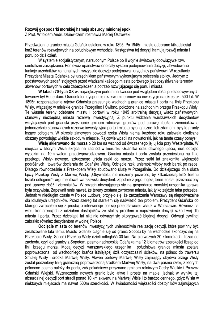 Rozwój gospodarki morskiej hamują absurdy minionej epoki Z Prof. Witoldem Andruszkiewiczem rozmawia Maciej Ostrowski Przedwojenne granice miasta Gdańsk ustalono w roku 1895. Po 1945r. miastu odebrano kilkadziesiąt km2 terenów rozwojowych na południowym wchodzie. Następstwa tej decyzji hamują rozwój miasta i portu po dziś dzień. W systemie socjalistycznym, narzuconym Polsce po II wojnie światowej obowiązywał tzw. centralizm zarządzania. Ponieważ upaństwowiono cały system podejmowania decyzji, zlikwidowano funkcje urzędników komunalnych, wszystkie decyzje podejmowali urzędnicy państwowi. W rezultacie Prezydent Miasta Gdańska był urzędnikiem państwowym wykonującym polecenia stolicy. Jednym z podstawowych zadań stojących przed władzami każdego miasta portowego jest pozyskiwanie terenów i akwenów portowych w celu zabezpieczenia potrzeb rozwijającego się portu i miasta. W latach 70-tych XX w. największym portem na świecie pod względem ilości przeładowywanych towarów był Rotterdam. Ośrodek ten dysponuje rezerwami terenów na inwestycje na okres ok. 500 lat. W 1895r. rozporządzenie rajców Gdańska przesunęło wschodnią granicę miasta i portu na linię Przekopu Wisły, włączając w miejskie granice Przegalino i Świbno, położone na zachodnim brzegu Przekopu Wisły. Te właśnie tereny odebrane miastu i portowi w roku 1945 arbitralną decyzją władz państwowych, stanowiły niezbędną miastu rezerwę inwestycyjną. Z punktu widzenia warszawskich decydentów wizytujących port gdański przyznanie gminom rolniczym gruntów pod uprawę zboża i ziemniaków a jednocześnie stanowiących rezerwę inwestycyjną portu i miasta było logiczne. Ich zdaniem były to grunty leżące odłogiem. W okresie zimowych powodzi rzeka Wisła niemal każdego roku zalewała okoliczne obszary powodując wielkie szkody w mieście. Rajcowie wpadli na nowatorski, jak na tamte czasy pomysł. Wisłę skierowano do morza o 20 km na wschód od ówczesnego jej ujścia przy Westerplatte. W miejscu w którym Wisła skręca na zachód w kierunku Gdańska oraz dawnego ujścia, nurt odcięto wysokim na 10m wałem przeciwpowodziowym. Granica miasta i portu została przeniesiona na linie przekopu Wisły- nowego, sztucznego ujścia rzeki do morza. Przez setki lat znakomita większość podróżnych i towarów docierała do Gdańska Wisłą. Odcięcie rzeki uniemożliwiłoby ruch barek po rzece. Dlatego równocześnie z Przekopem Wisły zbudowano śluzę w Przegalinie. Do dzisiejszego dnia śluza łączy Przekop Wisły z Martwą Wisłą. „Obywatelu, nie możemy pozwolić, by kilkadziesiąt km2 terenu leżało odłogiem”- argumentował warszawski decydent. Zgodnie z jego logiką teren został przeznaczony pod uprawę zbóż i ziemniaków. W oczach nieznającego się na gospodarce morskiej urzędnika sprawa była oczywista. Zapewnił mnie nawet, że tereny zostaną zwrócone miastu, jak tylko zajdzie taka potrzeba. Jednak w niedługim czasie w Polsce Ludowej przyjęło się, że zarządzenia Warszawy są niepodważalne dla lokalnych urzędników. Przez szereg lat starałem się naświetlić ten problem. Prezydent Gdańska do którego zwracałem się z prośbą o interwencję bał się przedstawicieli władz w Warszawie. Również na wielu konferencjach z udziałem dostojników ze stolicy prosiłem o naprawienie decyzji szkodliwej dla miasta i portu. Przez dziesiątki lat nikt nie odważył się skorygować błędnej decyzji. Odwagi cywilnej zabrakło również decydentom w wolnej Polsce. Odcięcie miasta od terenów inwestycyjnych uniemożliwia realizację decyzji, które powinny być zrealizowane lata temu. Miasto Gdańsk ciągnie się od granic Sopotu by na wschodzie skończyć się na Przekopie Wisły. Sopot i Przekop Wisły dzieli odległość 30 km. Na pierwszych 20 kilometrach, licząc od zachodu, czyli od granicy z Sopotem, pasmo nadmorskie Gdańska ma 12 kilometrów szerokości licząc od linii brzegu morza. Mocą decyzji warszawskiego urzędnika południowa granica miasta została poprowadzona od wschodniego krańca istniejącej dziś oczyszczalni ścieków, na północ do trawersu Śmiałej Wisły i środka Martwej Wisły. Akwen portowy Martwej Wisły zajmujący obydwa brzegi Wisły został podzielony linią graniczną poprowadzoną środkiem Martwej Wisły, na dwa pasma rzeki, z których północne pasmo należy do portu, zaś południowe przyznano gminom rolniczym Cedry Wielkie i Pruszcz Gdański Wiejski. Wyznaczenie nowych granic było łatwe i proste na mapie, jednak w wyniku tej absurdalnej decyzji port stracił ponad 10 km akwenu na Martwej Wiśle i to bardzo cennego, gdyż Wisła w niektórych miejscach ma nawet 500m szerokości. W świadomości większości dostojników zajmujących się gospodarką morską istniało przekonanie, że 500 km dostępu do morza oraz 54 porty i przystanie, to liczba zbyt duża jak na potrzeby naszego kraju. Praktyka zmniejszania obszarów inwestycyjnych miała miejsce także w innych portach kraju (w Szczecinie obszar portu zmniejszono o 10km). Rok 1972 przyniósł wielkie wydarzenie dla Polski i dla Gdańska. Organizacja Narodów Zjednoczonych i jej organ Europejska Komisja Gospodarcza w Genewie podjęła niezwykle cenną decyzję, niedocenianą do dzisiejszego dnia. Zatwierdzono trzeci transeuropejski korytarz transportowy północ-południe biegnący od Helsinek przez port Gdańsk, Stambuł w Turcji aż do portów Zatoki Perskiej. To jeden z trzech korytarzy transportowych, zatwierdzonych w tym czasie. Pierwszy Transeuropejski Korytarz Transportowy Północ- Południe wybiega z Londynu, na południe przecina kanał La Manche, Francję, Hiszpanię w rejonie Gibraltar- Morze Śródziemne i biegnie na południe zachodnim brzegiem Afryki nad Atlantykiem. Drugi Transeuropejski Korytarz Transportowy Północ- Południe wybiega z Kopenhagi w Danii, biegnie przez Niemcy, Włochy, w tym przez Sycylię, przecina Morze śródziemne i biegnie 