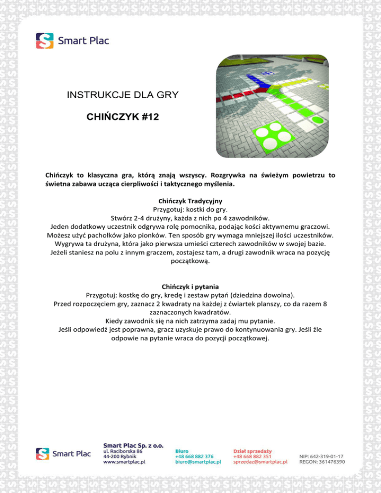 INSTRUKCJE DLA GRY CHIŃCZYK #12 Chioczyk to klasyczna gra, którą znają wszyscy. Rozgrywka na świeżym powietrzu to świetna zabawa ucząca cierpliwości i taktycznego myślenia. Chioczyk Tradycyjny Przygotuj: kostki do gry. Stwórz 2-4 drużyny, każda z nich po 4 zawodników. Jeden dodatkowy uczestnik odgrywa rolę pomocnika, podając kości aktywnemu graczowi. Możesz użyd pachołków jako pionków. Ten sposób gry wymaga mniejszej ilości uczestników. Wygrywa ta drużyna, która jako pierwsza umieści czterech zawodników w swojej bazie. Jeżeli staniesz na polu z innym graczem, zostajesz tam, a drugi zawodnik wraca na pozycję początkową. Chioczyk i pytania Przygotuj: kostkę do gry, kredę i zestaw pytao (dziedzina dowolna). Przed rozpoczęciem gry, zaznacz 2 kwadraty na każdej z dwiartek planszy, co da razem 8 zaznaczonych kwadratów. Kiedy zawodnik się na nich zatrzyma zadaj mu pytanie. Jeśli odpowiedź jest poprawna, gracz uzyskuje prawo do kontynuowania gry. Jeśli źle odpowie na pytanie wraca do pozycji początkowej.