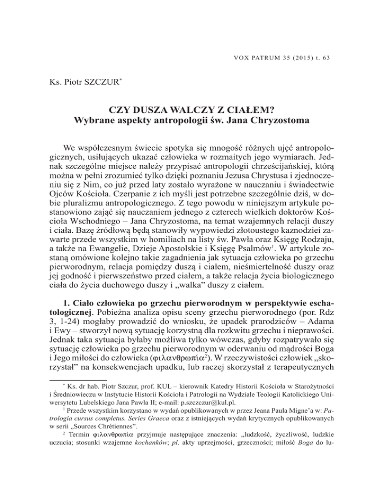 V O X PAT R U M 3 5 ( 2 0 1 5 ) t . 6 3 Ks. Piotr SZCZUR* CZY DUSZA WALCZY Z CIAŁEM? Wybrane aspekty antropologii św. Jana Chryzostoma We współczesnym świecie spotyka się mnogość różnych ujęć antropologicznych, usiłujących ukazać człowieka w rozmaitych jego wymiarach. Jednak szczególne miejsce należy przypisać antropologii chrześcijańskiej, którą można w pełni zrozumieć tylko dzięki poznaniu Jezusa Chrystusa i zjednoczeniu się z Nim, co już przed laty zostało wyrażone w nauczaniu i świadectwie Ojców Kościoła. Czerpanie z ich myśli jest potrzebne szczególnie dziś, w dobie pluralizmu antropologicznego. Z tego powodu w niniejszym artykule postanowiono zająć się nauczaniem jednego z czterech wielkich doktorów Kościoła Wschodniego – Jana Chryzostoma, na temat wzajemnych relacji duszy i ciała. Bazę źródłową będą stanowiły wypowiedzi złotoustego kaznodziei zawarte przede wszystkim w homiliach na listy św. Pawła oraz Księgę Rodzaju, a także na Ewangelie, Dzieje Apostolskie i Księgę Psalmów1. W artykule zostaną omówione kolejno takie zagadnienia jak sytuacja człowieka po grzechu pierworodnym, relacja pomiędzy duszą i ciałem, nieśmiertelność duszy oraz jej godność i pierwszeństwo przed ciałem, a także relacja życia biologicznego ciała do życia duchowego duszy i „walka” duszy z ciałem. 1. Ciało człowieka po grzechu pierworodnym w perspektywie eschatologicznej. Pobieżna analiza opisu sceny grzechu pierworodnego (por. Rdz 3, 1-24) mogłaby prowadzić do wniosku, że upadek prarodziców – Adama i Ewy – stworzył nową sytuację korzystną dla rozkwitu grzechu i nieprawości. Jednak taka sytuacja byłaby możliwa tylko wówczas, gdyby rozpatrywało się sytuację człowieka po grzechu pierworodnym w oderwaniu od mądrości Boga i Jego miłości do człowieka (filanqrwp…a2). W rzeczywistości człowiek „skorzystał” na konsekwencjach upadku, lub raczej skorzystał z terapeutycznych * Ks. dr hab. Piotr Szczur, prof. KUL – kierownik Katedry Historii Kościoła w Starożytności i Średniowieczu w Instytucie Historii Kościoła i Patrologii na Wydziale Teologii Katolickiego Uniwersytetu Lubelskiego Jana Pawła II; e-mail: [email protected]. 1 Przede wszystkim korzystano w wydań opublikowanych w przez Jeana Paula Migne’a w: Patrologia cursus completus. Series Graeca oraz z istniejących wydań krytycznych opublikowanych w serii „Sources Chrétiennes”. 2 Termin filanqrwp…a przyjmuje następujące znaczenia: „ludzkość, życzliwość, ludzkie uczucia; stosunki wzajemne kochanków; pl. akty uprzejmości, grzeczności; miłość Boga do lu- 130 KS. PIOTR SZCZUR środków, jakie Bóg dał po upadku prarodziców, aby zapewnić mu swego rodzaju środowisko pedagogiczne, w jakie miał wkroczyć i, co więcej, aby odnieść korzyść z istnienia i obecności w świecie. W rzeczywistości, rozpowszechnienie się zła i grzechu oraz królestwa szatana, nie tworzy samo w sobie formy nacisku zmuszającej człowieka do czynienia zła, gdyż grzech jest konsekwencją wolnego wyboru człowieka. Jan Chryzostom w swym nauczaniu przyjmuje tę właśnie perspektywę historiozbawczą i broni absolutnej wolności człowieka zarówno przed, jak i po upadku. Co więcej, podkreśla, że dzięki wolności człowiek może dążyć do doskonałości i jedności z Bogiem. Jan Chryzostom uważa, że ciało (sîma3) po upadku człowieka nie może być uważane za element skłaniający istotę ludzką do grzechu. Wprawdzie Apostoł Paweł opisuje ciało jako grzeszne (por. Rz 6, 6), śmiertelne (por. Rz 6, 12; 2 Kor 5, 4), itd. Jednak tych określeń nie należy rozumieć i interpretować jako rodzaj „zarzutów” wobec ciała, lecz należy je postrzegać przez pryzmat eschatologicznego tła wypowiedzi Apostoła Narodów. Przykładowo, kiedy św. Jan Chryzostom objaśnia wypowiedź św. Pawła: „Niechże więc grzech nie króluje w waszym śmiertelnym ciele” (Rz 6, 12), wyraźnie stwierdza, że Apostoł nie oskarża śmiertelnego ciała o to, że jest przyczyną grzechu, lecz stara się pocieszyć odbiorców listu, aby nie załamali się z powodu konieczności prowadzenia walki z grzechem, gdyż walka ta jest ograniczona do doczesności, a zwycięstwo w gruncie rzeczy jest łatwe. „Następnie, ponieważ trudno jest zwyciężać grzech, przypatrz się jak [Paweł] unaocznił łatwość tego i złagodził trud, mówiąc: «W waszym śmiertelnym ciele» (Rz 6, 12). Wyraża to, że walki są doczesne i wnet się skończą”4. Należy zwrócić uwagę na fakt, że św. Paweł w zacytowanej wypowiedzi używa terminu „śmiertelny” (qnhtÒj5) zarówno w jego konotacji doczesnej, jak i eschatologicznej. W rzeczywistości Paweł zamierzał powiedzieć: „ta śmiertelność, jako stan, osiągnie swój kres”. Jest to stwierdzenie, które dodaje odwagi, wznieca zapał oraz napełnia nadzieją człowieka gdy znosi trudy „doczesnej walki”, i tym samym sprawia, że zwycięstwo staje się łatwiejszym zadaniem6. Grzech panuje nie tylko przez śmiertelne ciało, ale także przez gnuśność. Wydaje się, że takie jest właściwe znaczenie słów Pawła: „poddając dzi” (Abramowiczówna IV 515-516, s.v. filanqrwp…a). Podobne znaczenia podają również inne słowniki, por. Lampe, s. 1475-1476, s.v. filanqrwp…a; Liddell – Scott, s. 1932, s.v. filanqrèpeuma (filaqrwp…a). 3 Por. Abramowiczówna IV 267, s.v. sîma; Lampe, s. 1362-1366, s.v. sîma; Liddell – Scott, s. 1749, s.v. sîma. 4 Joannes Chrysostomus, In epistulam ad Romanos hom. 11, 2, PG 60, 486, tłum. Sinko: Św. Jan Chryzostom, Homilie na List św. Pawła do Rzymian, oprac. A. Baron, t. 1, Kraków 1995, 164. 5 Por. Abramowiczówna II 467, s.v. qnhtÒj; Lampe, s. 653, s.v. qnhtÒj; Liddell – Scott, s. 802, s.v. qnhtÒj. 6 Por. Joannes Chrysostomus, In epistulam ad Romanos hom. 11, 2-3, PG 60, 486-487. CZY DUSZA WALCZY Z CIAŁEM? 131 was swoim pożądli