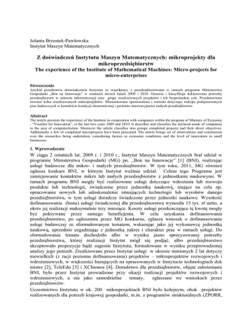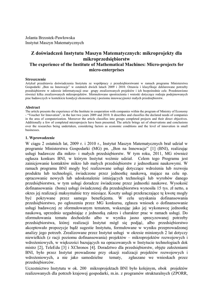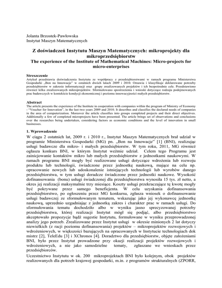 Jolanta Brzostek-Pawłowska Instytut Maszyn Matematycznych Z doświadczeń Instytutu Maszyn Matematycznych: mikroprojekty dla mikroprzedsiębiorstw The experience of the Institute of Mathematical Machines: Micro-projects for micro-enterprises Streszczenie Artykuł przedstawia doświadczenia Instytutu ze współpracy z przedsiębiorstwami w ramach programu Ministerstwa Gospodarki „Bon na Innowacje” w ostatnich dwóch latach 2009 i 2010. Omawia i klasyfikuje deklarowane potrzeby przedsiębiorstw w zakresie informatyzacji oraz grupy zrealizowanych projektów i ich bezpośrednie cele. Przedstawiono również kilka zrealizowanych mikroprojektów. Sformułowano spostrzeżenia i wnioski dotyczące rodzaju podejmowanych prac badawczych w kontekście kondycji ekonomicznej i poziomu innowacyjności małych przedsiębiorstw. Abstract The article presents the experience of the Institute in cooperation with companies within the program of Ministry of Economy - “Voucher for Innovation”, in the last two years 2009 and 2010. It describes and classifies the declared needs of companies in the area of computerization. Moreover the article classifies into groups completed projects and their direct objectives. Additionally a few of completed microprojects have been presented. The article brings set of observations and conclusions over the researches being undertaken, considering factors as economic conditions and the level of innovation in small businesses. 1. Wprowadzenie W ciągu 2 ostatnich lat, 2009 r. i 2010 r., Instytut Maszyn Matematycznych brał udział w programie Ministerstwa Gospodarki (MG) pn. „Bon na Innowacje” [1] (BNI), realizując usługi badawcze dla mikro- i małych przedsiębiorstw. W tym roku, 2011, MG również ogłasza konkurs BNI, w którym Instytut weźmie udział. Celem tego Programu jest zainicjowanie kontaktów mikro lub małych przedsiębiorstw z jednostkami naukowymi. W ramach programu BNI mogły być realizowane usługi dotyczące wdrożenia lub rozwoju produktu lub technologii, świadczone przez jednostkę naukową, mające na celu np. opracowanie nowych lub udoskonalenie istniejących technologii lub wyrobów danego przedsiębiorstwa, w tym usługi doradcze świadczone przez jednostki naukowe. Wysokość dofinansowania (bonu) usługi świadczonej dla przedsiębiorstwa wynosiła 15 tys. zł netto, a okres jej realizacji maksymalnie trzy miesiące. Koszty usługi przekraczające tę kwotę mogły być pokrywane przez samego beneficjenta. W celu uzyskania dofinansowania przedsiębiorstwo, po ogłoszeniu przez MG konkursu, zgłasza wniosek o dofinansowanie usługi badawczej ze sformułowanym tematem, wskazując jako jej wykonawcę jednostkę naukową, uprzednio uzgadniając z jednostką zakres i charakter prac w ramach usługi. Do sformułowania tematu dochodziło albo w wyniku jasno sprecyzowanej potrzeby przedsiębiorstwa, której realizacji Instytut mógł się podjąć, albo przedsiębiorstwo akceptowało propozycje bądź sugestie Instytutu, formułowane w wyniku przeprowadzonej analizy jego potrzeb. Zrealizowane przez Instytut usługi w okresie minionych 2 lat dotyczy niewielkich (z racji poziomu dofinansowania) projektów – mikroprojektów rozwojowych i wdrożeniowych, w większości bazujących na opracowanych w Instytucie technologiach dok mistrz [2], TeleEdu [3] i XChronos [4]. Doradztwo dla przedsiębiorstw, objęte założeniami BNI, było przez Instytut prowadzone przy okazji realizacji projektów rozwojowych i wdrożeniowych, a nie jako samodzielne tematy, zgłaszane we wnioskach przez przedsiębiorców. Uczestnictwo Instytutu w ok. 200 mikroprojektach BNI było kolejnym, obok projektów realizowanych dla potrzeb krajowej gospodarki, m.in. z programów strukturalnych (ZPORR, EQUAL, PO KL), i kontraktów rynkowych, szeroką platformą współpracy z małymi i, przede wszystkim, mikro- przedsiębiorstwami1, dostarczającej Instytutowi wiedzy o potrzebach i poziomie informatyzacji przedsiębiorstw z obszaru całej Polski, zaś przedsiębiorcom o potencjale technologii informatycznych mogącym mieć zastosowanie w ich działalności biznesowej. W artykule przedstawione są potrzeby przedsiębiorstw w zakresie informatyzacji, te zaspokojone zrealizowanymi projektami i te pozostające do rozwiązania, typy zrealizowanych projektów rozwojowych i ich przykłady oraz wnioski z doświadczeń Instytutu uzyskanych w czasie realizacji BNI, które być może przysłużą się do formułowania szerszej i bardziej adekwatnej do potrzeb przedsiębiorstw, więc atrakcyjniejszej, oferty Instytutu - dla potencjalnych beneficjentów kolejnego konkursu BNI, i nie tylko dla nich. 2. Potrzeby informatyzacyjne mikroprzedsiębiorstw Mikroprzedsiębiorstwa, z którymi Instytut współpracował w BNI, pochodziły z całej Polski, w większości były z Warszawy i jej obrzeży. Trudno wyróżnić czynnik lokalizacji przedsiębiorstwa jako rzutujący na stan jego informatyzacji lub potrzeb w tym zakresie. Na wspólną charakterystykę tych mikroprzedsiębiorstw składały się trzy cechy: ‐ bardzo ograniczone środki finansowe lub ich brak, które mogłyby być przeznaczone na pokrycie zakupu lub zamówienia na opracowanie technologii informatycznej; ‐ brak czasu właścicieli przedsiębiorstw na rozeznanie lub bliższe poznanie możliwości zastosowania technologii informatycznych z powodu osobistego udziału w realizacji zamówień i/lub ich pozyskiwaniu oraz brak personalu, który mógłby w tym pomóc; ‐ brak czasu na szczegółowe zapoznawanie się i uczestniczenie w formalizmach niezbędnych do dokumentowania realizacji i zakończenia projektu, w czym Instytut zmuszony był wspierać przedsiębiorców. Stąd nie było w tak licznych projektach BNI przypadku chęci pokrycia z własnych środków kosztów projektu przekraczających poziom Bonu oraz w wielu przypadkach przedsiębiorcy zbyt mało czasu mogli przeznaczyć na wspólne, z pracownikami Instytutu, omawianie moż