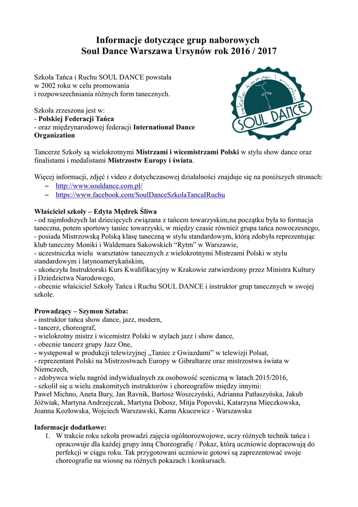 Informacje dotyczące grup naborowych Soul Dance Warszawa Ursynów rok 2016 / 2017 Szkoła Tańca i Ruchu SOUL DANCE powstała w 2002 roku w celu promowania i rozpowszechniania różnych form tanecznych. Szkoła zrzeszona jest w: - Polskiej Federacji Tańca - oraz międzynarodowej federacji International Dance Organization Tancerze Szkoły są wielokrotnymi Mistrzami i wicemistrzami Polski w stylu show dance oraz finalistami i medalistami Mistrzostw Europy i świata. Więcej informacji, zdjęć i video z dotychczasowej działalności znajduje się na poniższych stronach: – http://www.souldance.com.pl/ – https://www.facebook.com/SoulDanceSzkolaTancaIRuchu Właściciel szkoły – Edyta Mędrek Śliwa - od najmłodszych lat dziecięcych związana z tańcem towarzyskim,na początku była to formacja taneczna, potem sportowy taniec towarzyski, w między czasie również grupa tańca nowoczesnego, - posiada Mistrzowską Polską klasę taneczną w stylu standardowym, którą zdobyła reprezentując klub taneczny Moniki i Waldemara Sakowskich “Rytm” w Warszawie, - uczestniczka wielu warsztatów tanecznych z wielokrotnymi Mistrzami Polski w stylu standardowym i latynoamerykańskim, - ukończyła Instruktorski Kurs Kwalifikacyjny w Krakowie zatwierdzony przez Ministra Kultury i Dziedzictwa Narodowego, - obecnie właściciel Szkoły Tańca i Ruchu SOUL DANCE i instruktor grup tanecznych w swojej szkole. Prowadzący – Szymon Sztaba: - instruktor tańca show dance, jazz, modern, - tancerz, choreograf, - wielokrotny mistrz i wicemistrz Polski w stylach jazz i show dance, - obecnie tancerz grupy Jazz One, - występował w produkcji telewizyjnej „Taniec z Gwiazdami” w telewizji Polsat, - reprezentant Polski na Mistrzostwach Europy w Gibraltarze oraz mistrzostwa świata w Niemczech, - zdobywca wielu nagród indywidualnych za osobowość sceniczną w latach 2015/2016, - szkolił się u wielu znakomitych instruktorów i choreografów między innymi: Paweł Michno, Aneta Bury, Jan Ravnik, Bartosz Woszczyński, Adrianna Patłaszyńska, Jakub Jóźwiak, Martyna Andrzejczak, Martyna Dobosz, Mitja Popovski, Katarzyna Mieczkowska, Joanna Kozłowska, Wojciech Warszawski, Kama Akucewicz - Warszawska Informacje dodatkowe: 1. W trakcie roku szkoła prowadzi zajęcia ogólnorozwojowe, uczy różnych technik tańca i opracowuje dla każdej grupy inną Choreografię / Pokaz, którą uczniowie dopracowują do perfekcji w ciągu roku. Tak przygotowani uczniowie gotowi są zaprezentować swoje choreografie na wiosnę na różnych pokazach i konkursach. 2. Kostiumy – szkoła tańca zapewnia darmowe wypożyczenie profesjonalnych kostiumów do tańca na pokazy taneczne w pierwszym roku nauki. 3. Pokazy – szkoła tańca zapewnia przygotowanie Koncertu dla rodziców na zakończenie sezonu – w miesiącu czerwcu 2017 r. oraz pokazów tanecznych w Domu Kultury w drugiej połowie roku szkolnego 2016/2017 ( oraz innych imprezach okolicznościowych lub konkursach). 4. Opłaty za lekcje uiszczane są do 10 dnia każdego miesiąca z góry, na konto bankowe szkoły. 5. Kontakt ze szkołą: - Oddział Warszawa Ursynów: Dagmara Marchel, kom. 513 055 227, mail: [email protected] - Edyta Mędrek Śliwa, kom. 512 083 389, mail: [email protected] - wszelkie informacje szkoła będzie przekazywać na bieżąco wszystkim zainteresowanym za pomocą dostępnych środków: www, Facebook, sms, telefon, mail, spotkania w Domu Sztuki NABÓR 2016/2017: Grupa Roztańczone Maluchy 5-7 lat Ilość zajęć w tygodniu – 2 x 50 minut Koszt – 120 zł/miesiąc Opis zajęć – są to zajęcia ogólnorozwojowe dostosowane do wieku dzieci. Poprzez taniec rozwijamy koordynację ruchową i poczucie rytmu oraz wprowadzamy dziecko w tajemniczy i niezwykły świat wyobraźni. Poprzez taniec pracujemy również nad właściwą postawą naszych tancerzy. Zajęcia taneczne przeplatane są różnymi zabawami i ćwiczeniami rytmicznymi oraz zabawami uczącymi współdziałania w grupie. Wiek 5- 7 lat jest idealną porą do rozpoczęcia przygody z tańcem. Grupa Roztańczone Smyki 8-11 lat Grupa Juniorzy Soul Dance 12-15 lat oraz Grupa młodzieżowa Soul Dance 16 + Ilość zajęć w tygodniu – 2 x 60 minut Koszt – 135 zł/miesiąc Opis zajęć – zajęcia dostosowane są do wieku i umiejętności tancerzy. Są to zajęcia show dance, która jest kompilacją wielu technik m.in. tańca jazzowego, klasycznego, rewiowego, musicalowego, elementów gimnastycznych i akrobatycznych. Zajęcia są połączeniem tańca i gry aktorskiej, a przygotowywane choreografie są barwną opowieścią jakiejś historii. Często w show dance wykorzystywane są rekwizyty sceniczne, na których bazuje cała choreografia. Zajęcia show dance są wypełnione nauką techniki, elementów tanecznych, ekspresji. Na zakończenie nauki powstaje barwne widowisko o niezwykłym wyrazie artystycznym.