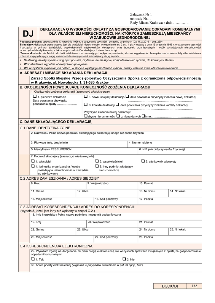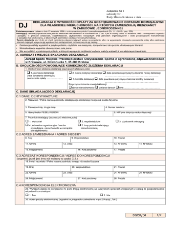 Załącznik Nr 1 uchwały Nr… Rady Miasta Krakowa z dnia …………. DEKLARACJA O WYSOKOŚCI OPŁATY ZA GOSPODAROWANIE ODPADAMI KOMUNALNYMI DLA WŁAŚCICIELI NIERUCHOMOŚCI, NA KTÓRYCH ZAMIESZKUJĄ MIESZKAŃCY W ZABUDOWIE JEDNORODZINNEJ DJ Podstawa prawna: ustawa z dnia 13 września 1996 r. o utrzymaniu czystości i porządku w gminach (Dz. U. z 2016 r. poz. 250) Składający: deklaracja przeznaczona jest dla właścicieli nieruchomości w rozumieniu art. 2 ust. 1 pkt 4 ustawy z dnia 13 września 1996 r. o utrzymaniu czystości i porządku w gminach (właścicieli, współwłaścicieli, użytkowników wieczystych oraz jednostek organizacyjnych i osób posiadających nieruchomości w zarządzie lub użytkowaniu, a także innych podmiotów władających nieruchomością). Termin składania: do 14 dni od chwili zaistnienia zdarzeń mających wpływ na powstanie, albo na wygaśnięcie obowiązku ponoszenia opłaty albo zaistnienia zdarzeń mających wpływ na jej wysokość lub osobę/podmiot zobowiązany do jej zapłaty. Deklarację należy wypełnić w języku polskim, czytelnie, na maszynie, komputerowo lub ręcznie, drukowanymi literami. Wnioskodawca wypełnia obowiązkowo pola jasne. We wszystkich wypełnianych polach, w których występuje możliwość wyboru, należy wstawić X we właściwym kwadracie. A. ADRESAT I MIEJSCE SKŁADANIA DEKLARACJI Zarząd Spółki Miejskie Przedsiębiorstwo Oczyszczania Spółka z ograniczoną odpowiedzialnością w Krakowie, ul. Nowohucka 1, 31-580 Kraków B. OKOLICZNOŚCI POWODUJĄCE KONIECZNOŚĆ ZŁOŻENIA DEKLARACJI 1. Okoliczności złożenia deklaracji (zaznaczyć właściwe pole) 1. pierwsza deklaracja 2. nowa (kolejna) deklaracja data powstania przyczyny złożenia nowej deklaracji Data powstania obowiązku ponoszenia opłaty ………..………. ………………………………………………………….. 3. korekta deklaracji data powstania przyczyny złożenia korekty deklaracji ………………………………………………………….. Przyczyna złożenia nowej deklaracji: zbycie nieruchomości zmiana danych inne…..…………………………………… C. DANE SKŁADAJĄCEGO DEKLARACJĘ C.1 DANE IDENTYFIKACYJNE 2. Nazwisko / Pełna nazwa podmiotu składającego deklarację innego niż osoba fizyczna 3. Pierwsze imię, drugie imię 4. Numer telefonu 5. Identyfikator PESEL/REGON 6. NIP (nie dotyczy osoby fizycznej) 7. Podmiot składający (zaznaczyć właściwe pole) 1. właściciel 4. jednostka organizacyjna / osoba 2. współwłaściciel 5. inny podmiot władający posiadająca nieruchomość w zarządzie lub użytkowaniu 3. użytkownik wieczysty nieruchomością C.2 ADRES ZAMIESZKANIA / ADRES SIEDZIBY 8. Kraj 11. Gmina 9. Województwo 10. Powiat 12. Ulica 15. Miejscowość 13. Nr domu 16. Kod pocztowy 14. Nr lokalu 17. Poczta C.3 ADRESAT KORESPONDENCJI / ADRES DO KORESPONDENCJI (wypełnić, jeżeli jest inny niż wpisany w części C.2.) 18. Imię i nazwisko / Pełna nazwa podmiotu innego niż osoba fizyczna 19. Kraj 22. Gmina 20. Województwo 21. Powiat 23. Ulica 26. Miejscowość 24. Nr domu 27. Kod pocztowy 25. Nr lokalu 28. Poczta C.4 KORESPONDENCJA ELEKTRONICZNA 29. Wyrażam zgodę na doręczanie mi pism drogą elektroniczną we wszystkich sprawach związanych z opłatą za gospodarowanie odpadami komunalnymi. 1. Tak 2. Nie 30. Adres poczty elektronicznej (wypełnić w przypadku zakreślenia w pkt.29 opcji „Tak”) DGOK/DJ 1/2 D. DANE ZBIORCZE NIERUCHOMOŚCI, Z KTÓREJ ODBYWA SIĘ ODBIÓR ODPADÓW 31. Ulica 32. Nr domu 33. Kod pocztowy E. WYSOKOŚĆ OPŁATY ZA GOSPODAROWANIE ODPADAMI KOMUNALNYMI 34. Sposób zbierania odpadów komunalnych: (zaznaczyć właściwe pole) 1. Zbieranie odpadów komunalnych w sposób selektywny Wielkość gospodarstwa domowego I 2. Zbieranie odpadów komunalnych w sposób nieselektywny Tabela stawek opłat za gospodarowanie odpadami komunalnymi : Stawka opłaty za gospodarowanie odpadami komunalnymi przypadająca na gospodarstwo domowe [zł/gosp.] Gospodarstwo Zbiórka Zbiórka nieselektywna selektywna jednoosobowe 26,00 39,00 II dwuosobowe 36,00 54,00 III trzyosobowe 46,00 69,00 IV czteroosobowe 56,00 84,00 V pięcioosobowe 63,00 94,00 66,00 99,00 69,00 103,00 VI sześcioosobowe siedmioosobowe i VII większe 35. Wielkość gospodarstwa domowego: Słownie złotych: 36. Opłata (zł/miesiąc) 37. F. PODPIS SKŁADAJĄCEGO DEKLARACJĘ 38. Imię 39. Nazwisko 40. Imię 41. Nazwisko 42.Data wypełnienia deklaracji (dzień/miesiąc/rok) 43. Podpis/y (pieczęć) właściciela nieruchomości / osoby/osób reprezentującej/ych właściciela nieruchomości (należy dołączyć pełnomocnictwo lub inny dokument, z którego wynika uprawnienie do reprezentowania właściciela nieruchomości) G. LISTA ZAŁĄCZNIKÓW Ilość egzemplarzy Nazwa załącznika Załącznik DJ-A H. ADNOTACJE PRZYJMUJĄCEGO DEKLARACJĘ 44. Uwagi przyjmującego deklarację 45. Data (dzień/miesiąc/rok) 46. Podpis przyjmującego deklarację I. POUCZENIA DGOK/DJ 2/2 Deklaracja stanowi podstawę do wystawienia tytułu wykonawczego, zgodnie z przepisami ustawy z dnia 17 czerwca 1966 r. o postępowaniu egzekucyjnym w administracji (tekst jedn. Dz. U. z 2014 r. poz. 1619 z późn.zm.). DGOK/DJ 3/2 Załącznik do deklaracji DJ Numer załącznika DJ-A INFORMACJE O WSPÓŁWŁAŚCICIELACH NIERUCHOMOŚCI (wypełnić, jeżeli nieruchomość znajduje się we współwłasności; wypełnia podmiot składający deklarację DJ) A. DANE IDENTYFIKACYJNE WSPÓŁWŁAŚCICIELI NIERUCHOMOŚCI A.1 DANE IDENTYFIKACYJNE WSPÓŁWŁAŚCICIELA 1. Nazwisko / Pełna nazwa współwłaściciela 3. Pierwsze imię, drugie imię 2. PESEL/NIP 4. Liczba udziałów we współwłasności (nie dotyczy współwłasności łącznej) A.2 ADRES ZAMIESZKANIA / ADRES SIEDZIBY WSPÓŁWŁAŚCICIELA 5. Kraj 8. Gmina 6. Województwo 7. Powiat 9. Ulica 10. Nr domu 12. Miejscowość 13. Kod pocztowy 11. Nr lokalu 14. Poczta B.1 DANE IDENTYFIKACYJNE WSPÓŁWŁAŚCICIE
